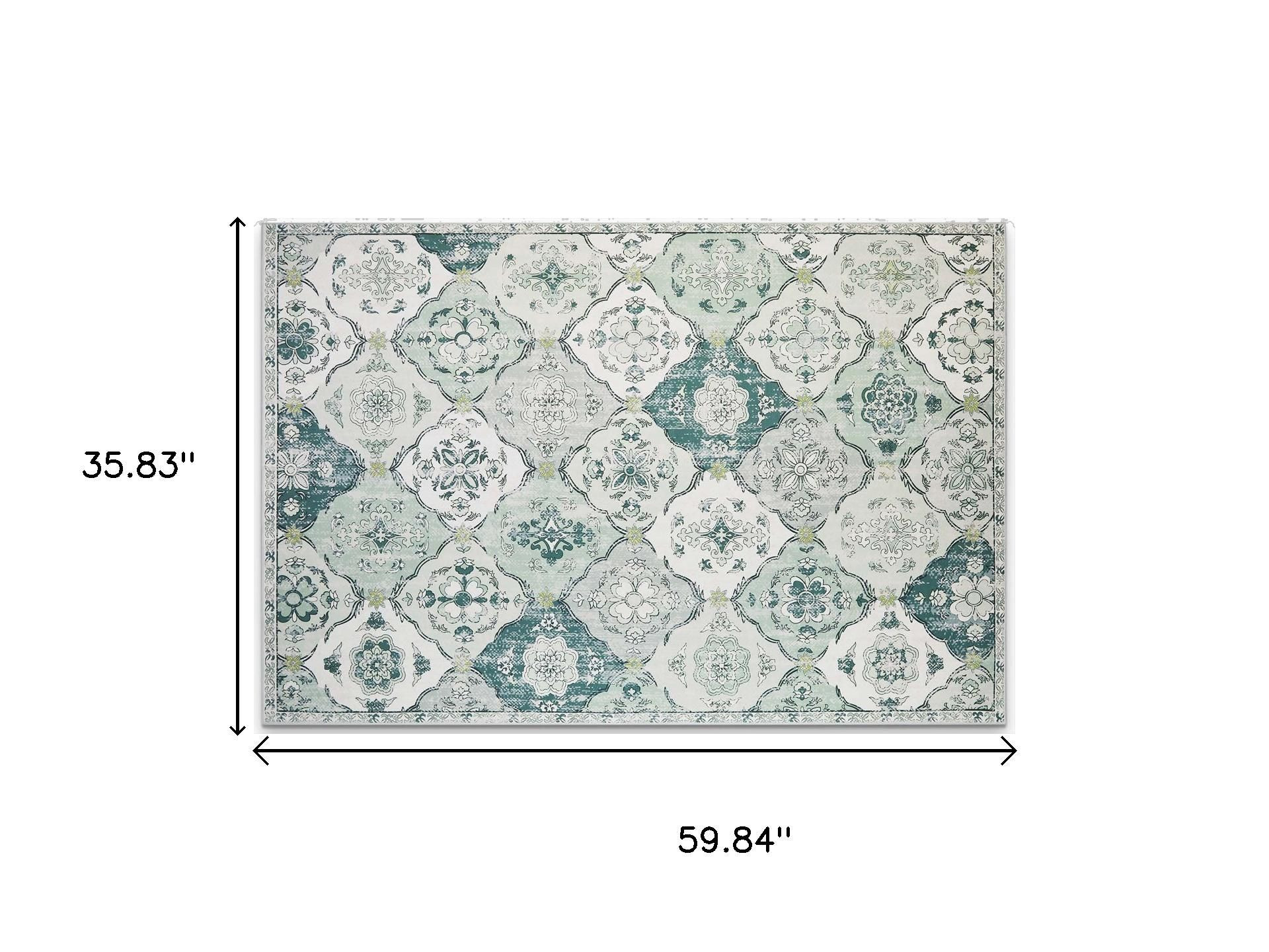 Add great coloration and comfortable texture to your space with this 3-foot x 5-foot green and off white patchwork distressed washable area rug. Ideal for spaces with kids and pets, this rug is stain resistant to help repel dirt and spilled liquids. Rugs are a great way to showcase your style, hide imperfections, warm your home and reduce noise. This smaller sized, traditional styled rug is just what you need for your walkway, bedside, in front of door, cabinet, refrigerator, or chair. 35.83-inch h x 59.84-inch w x 0.17-inch d.