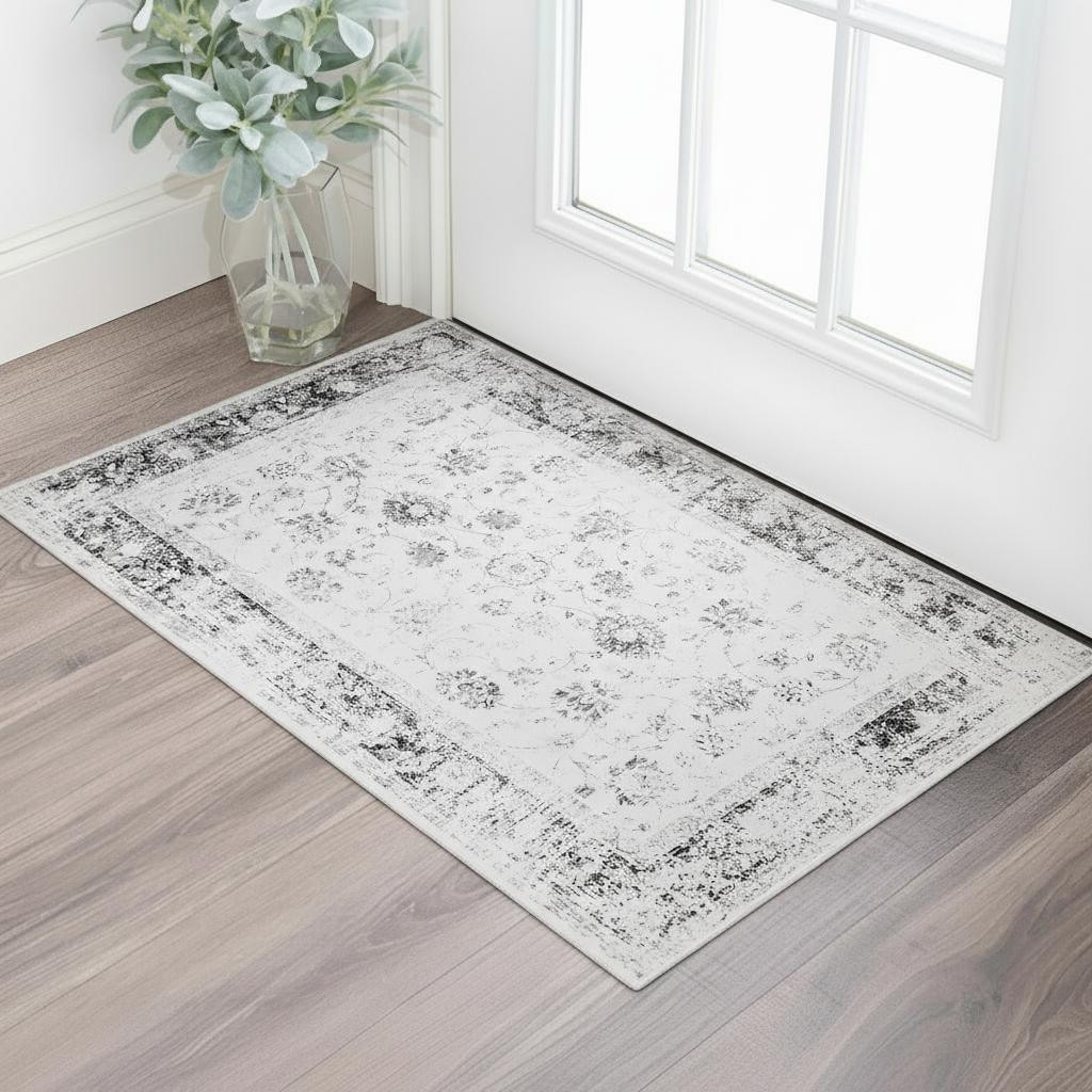Add some artistry to your room with this 3-foot x 5-foot ivory and charcoal oriental distressed washable area rug. Ideal for spaces with kids and pets, this rug is stain resistant to help repel dirt and spilled liquids. Rugs are a great way to showcase your style, hide imperfections, warm your home and reduce noise. This smaller sized, traditional styled rug is just what you need for your walkway, bedside, in front of door, cabinet, refrigerator, or chair. 35.83-inch h x 59.84-inch w x 0.17-inch d.