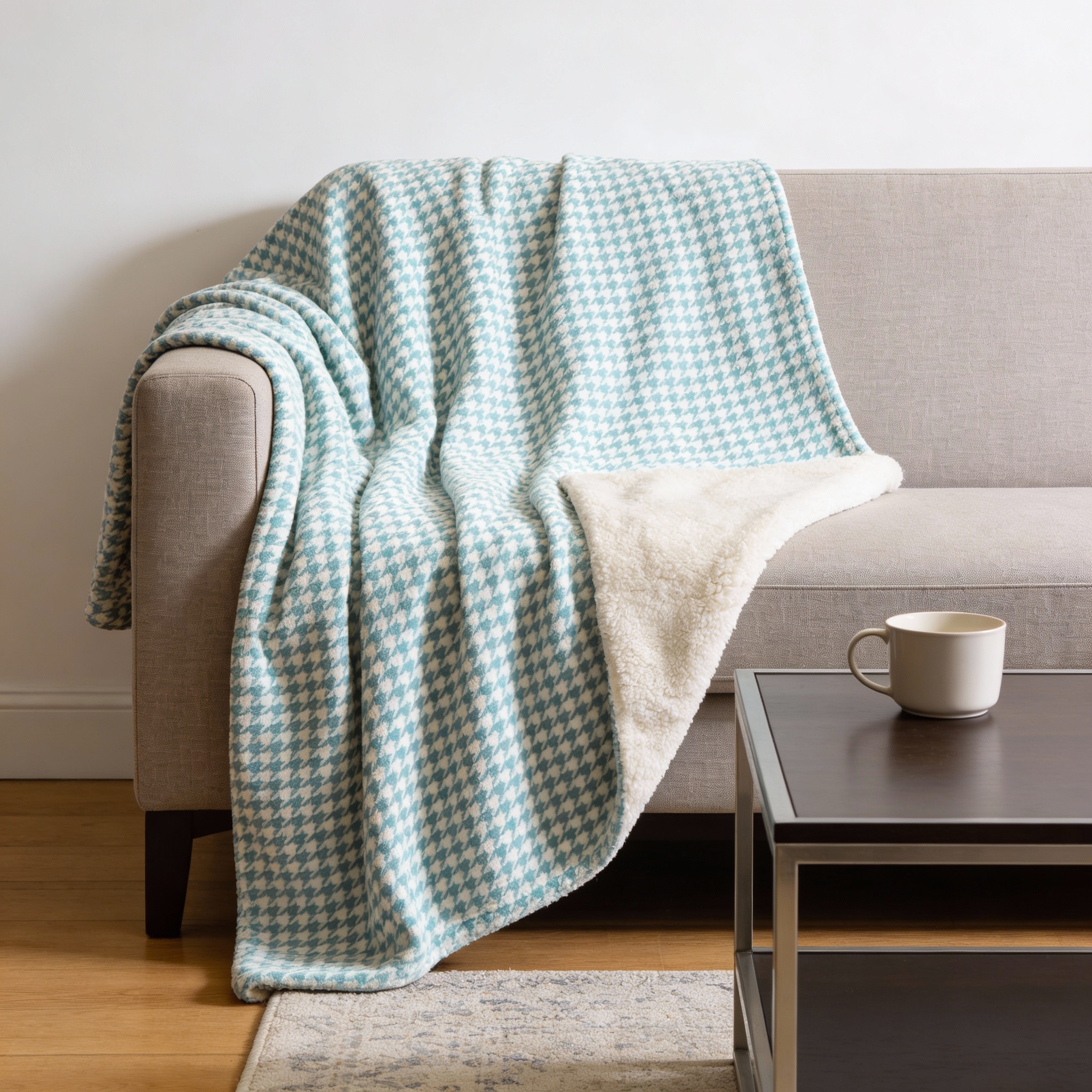 houndstooth microfiber plush throw blanket, microfiber plush throw blanket, plush throw blanket, white houndstooth microfiber plush throw, aqua white houndstooth microfiber plush |