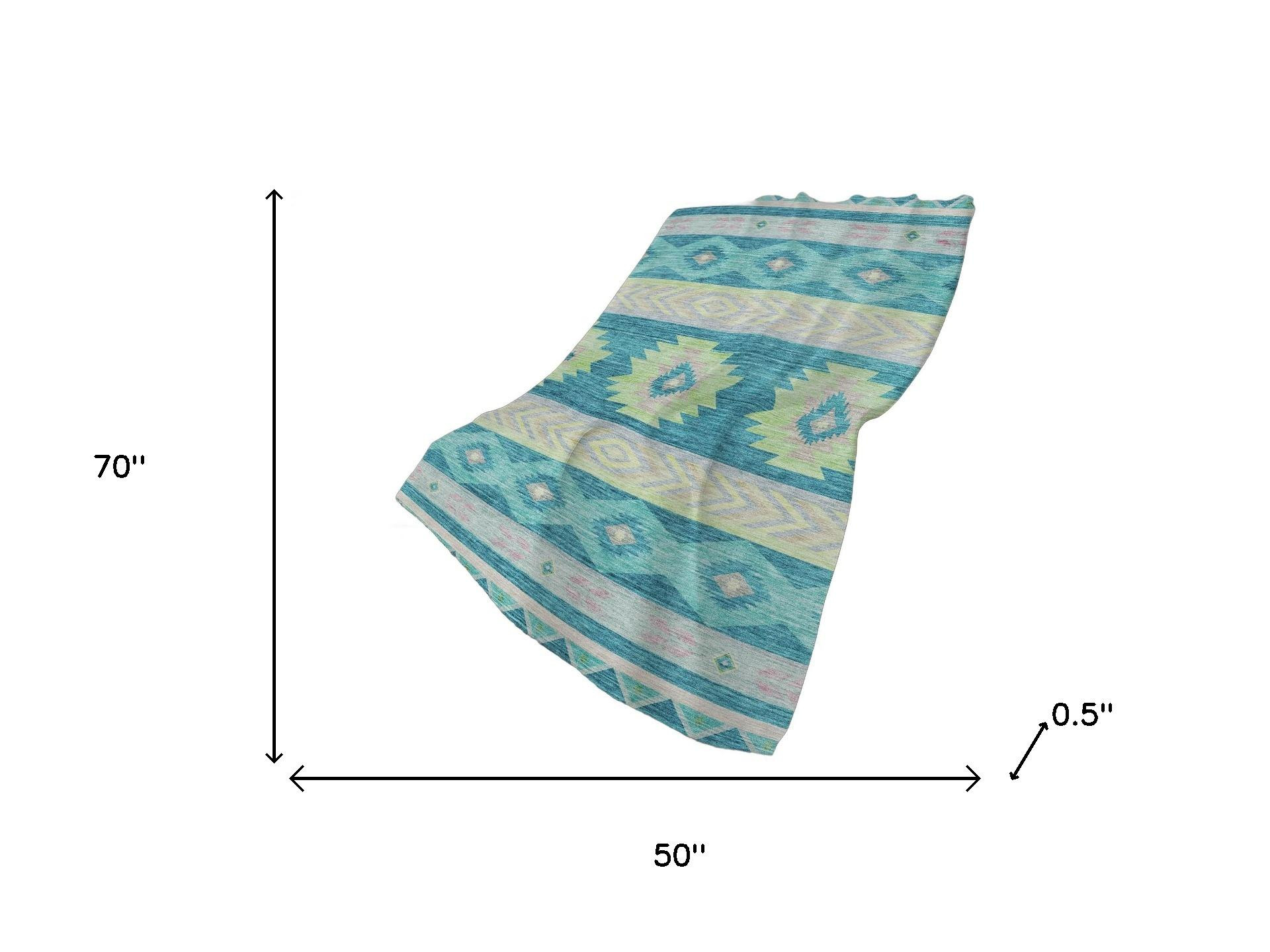 This 50-inch x 70-inch teal lime green and beige geometric polyester woven plush throw blanket is the perfect accent you've been searching for. This ultra-soft plush blanket is designed for ultimate softness. Features a woven geometric design that offers sumptuous softness and texture that you'll cherish for years to come. Made from polyester this blanket will make a great addition to any room it's added to. Add extra texture to your decor and turn your room into an inviting space. This cozy throw blanket is sure to become your go-to couch companion. 70.00-inch h x 50.00-inch w x 0.50-inch d.