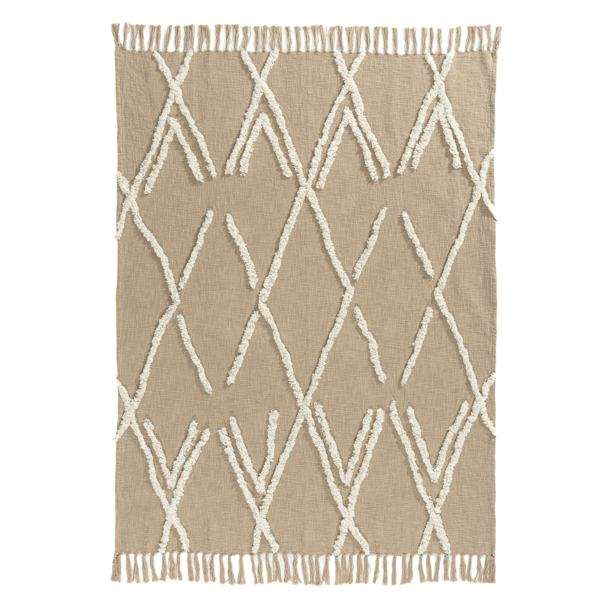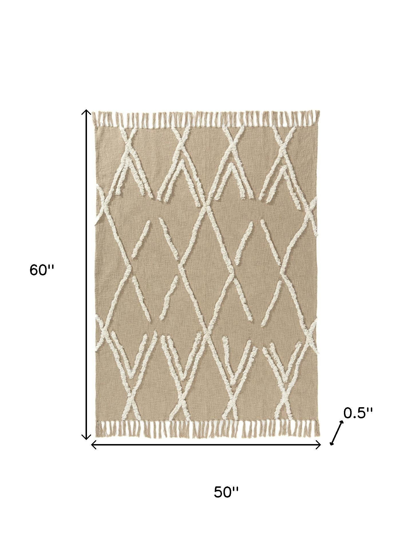 This welcoming 50-inch x 60-inch tan and ivory geometric cotton woven throw blanket is a must-have for every sofa, chaise, and bed. Hand woven by true artisans, this good looking throw will elevate its surroundings with its genuine and artisanal style. Features a woven geometric design that offers sumptuous softness and texture that you'll cherish for years to come. Made from cotton this blanket will make a great addition to any room it's added to. Layering your furnishings with a decorative throw has the ability to awaken a tired living room or elevate the design of your bedroom simply by providing elements of color and texture that weren't there before. This cozy throw blanket makes the perfect add-on to movie nights and lazy afternoons. 60.00-inch h x 50.00-inch w x 0.50-inch d.