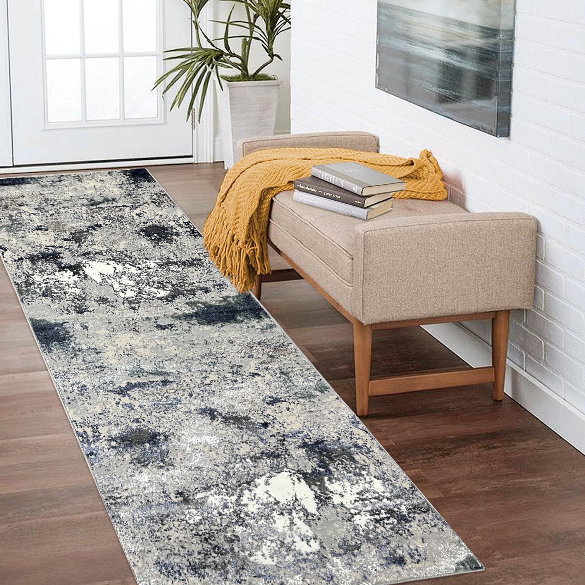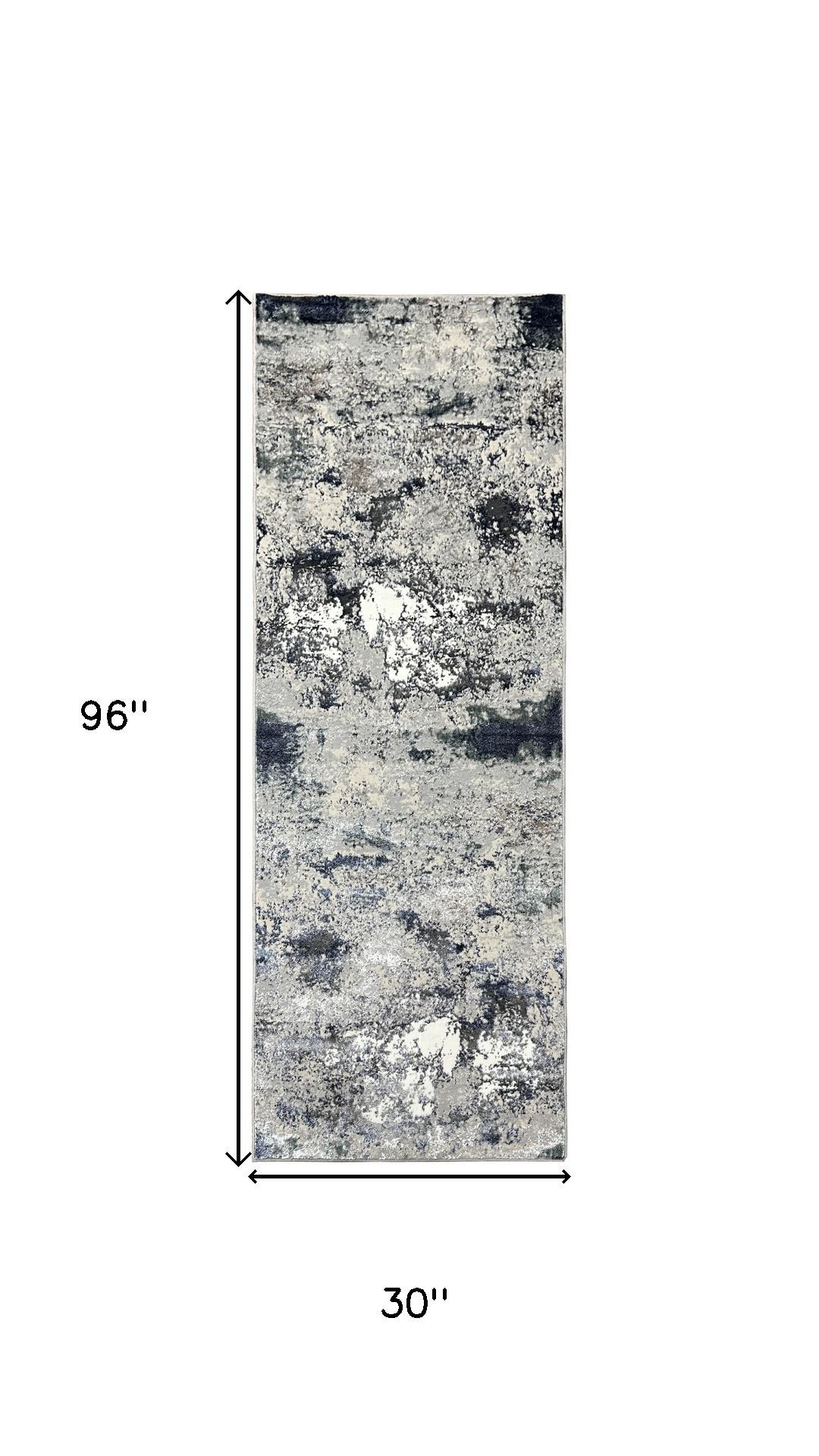 Add great coloration and comfortable texture to your space with this 8-foot gray and blue abstract distressed runner rug. Ideal for spaces with kids and pets, this rug is stain resistant to help repel dirt and spilled liquids. Built to last, this rug crafted from polyester fibers is known for its durability and long lasting appeal. Rugs are a great way to showcase your style, hide imperfections, warm your home and reduce noise. This larger sized, modern styled rug is ready to create a focal point or statement piece in your room. This modern style runner makes a great accent for the hallway, in front of cabinets, in the laundry room, or any other space you need a narrow and long rug. 96.00-inch h x 30.00-inch w x 0.20-inch d.