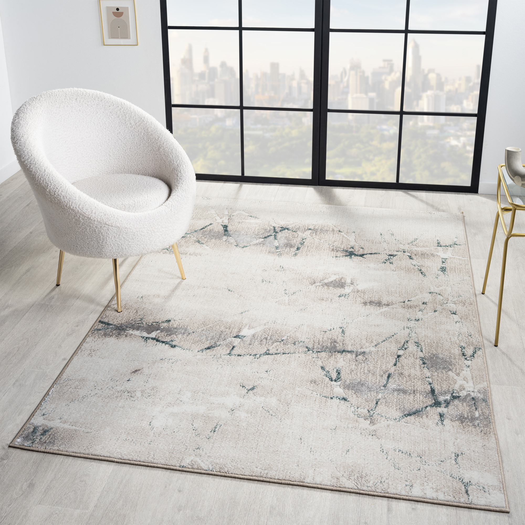 Set an inviting tone in your space with this 5-foot x 7-foot beige and blue abstract distressed area rug. Ideal for spaces with kids and pets, this rug is stain resistant to help repel dirt and spilled liquids. Built to last, this rug crafted from polyester fibers is known for its durability and long lasting appeal. Rugs are a great way to showcase your style, hide imperfections, warm your home and reduce noise. This larger sized, modern styled rug is ready to create a focal point or statement piece in your room. 84.00-inch h x 60.00-inch w x 0.40-inch d.