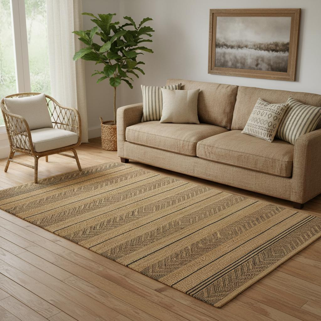 Add some artistry to your room with this 5-foot x 8-foot tan and black jute striped hand woven area rug. Crafted by skilled artisans, this hand woven rug is genuine and unique. No two will be exactly alike. Crafted from jute fibers that give this piece premium texture, refinement, and appeal. Rugs are a great way to showcase your style, hide imperfections, warm your home and reduce noise. This larger sized, rustic styled rug is ready to create a focal point or statement piece in your room. 93.00-inch h x 60.00-inch w x 0.40-inch d.