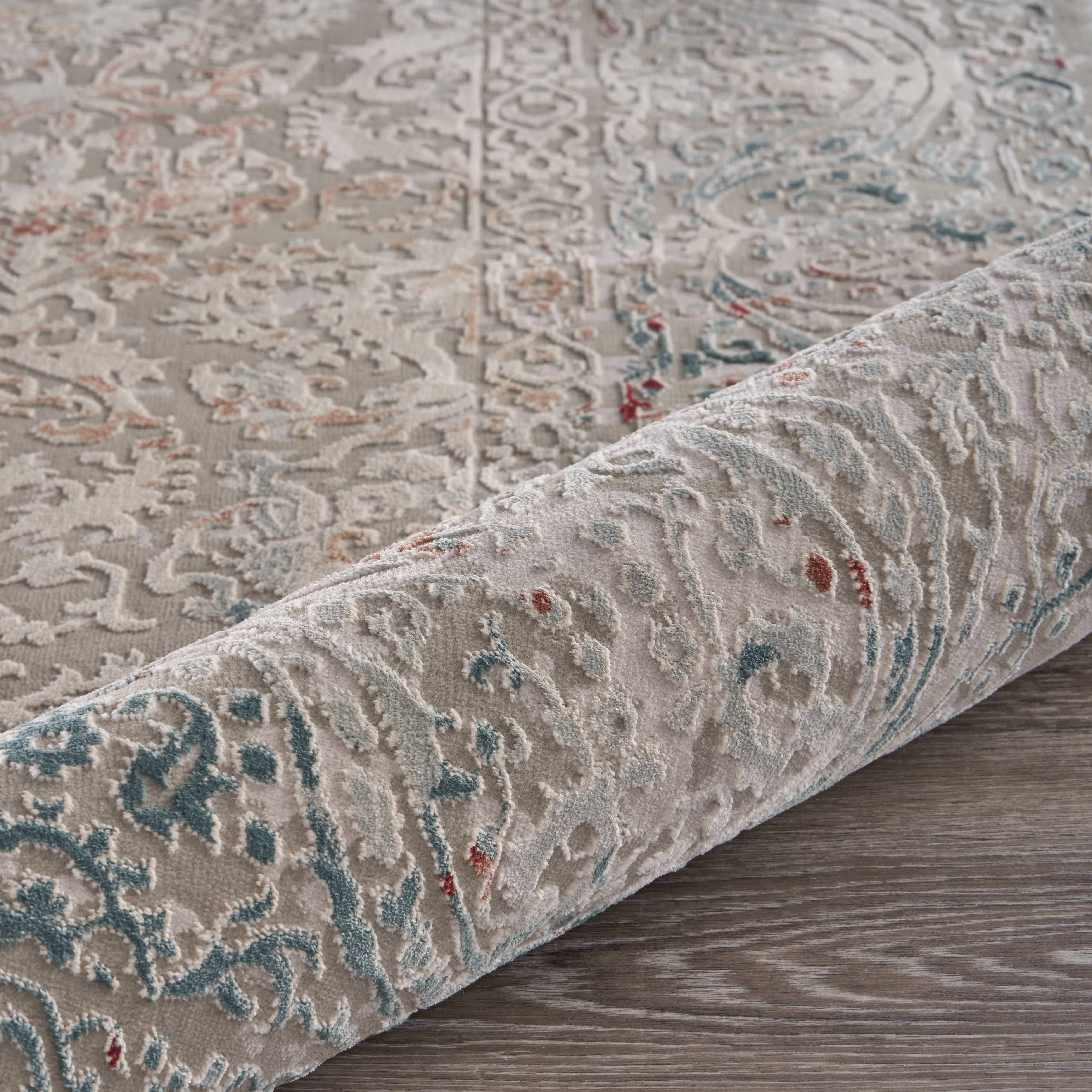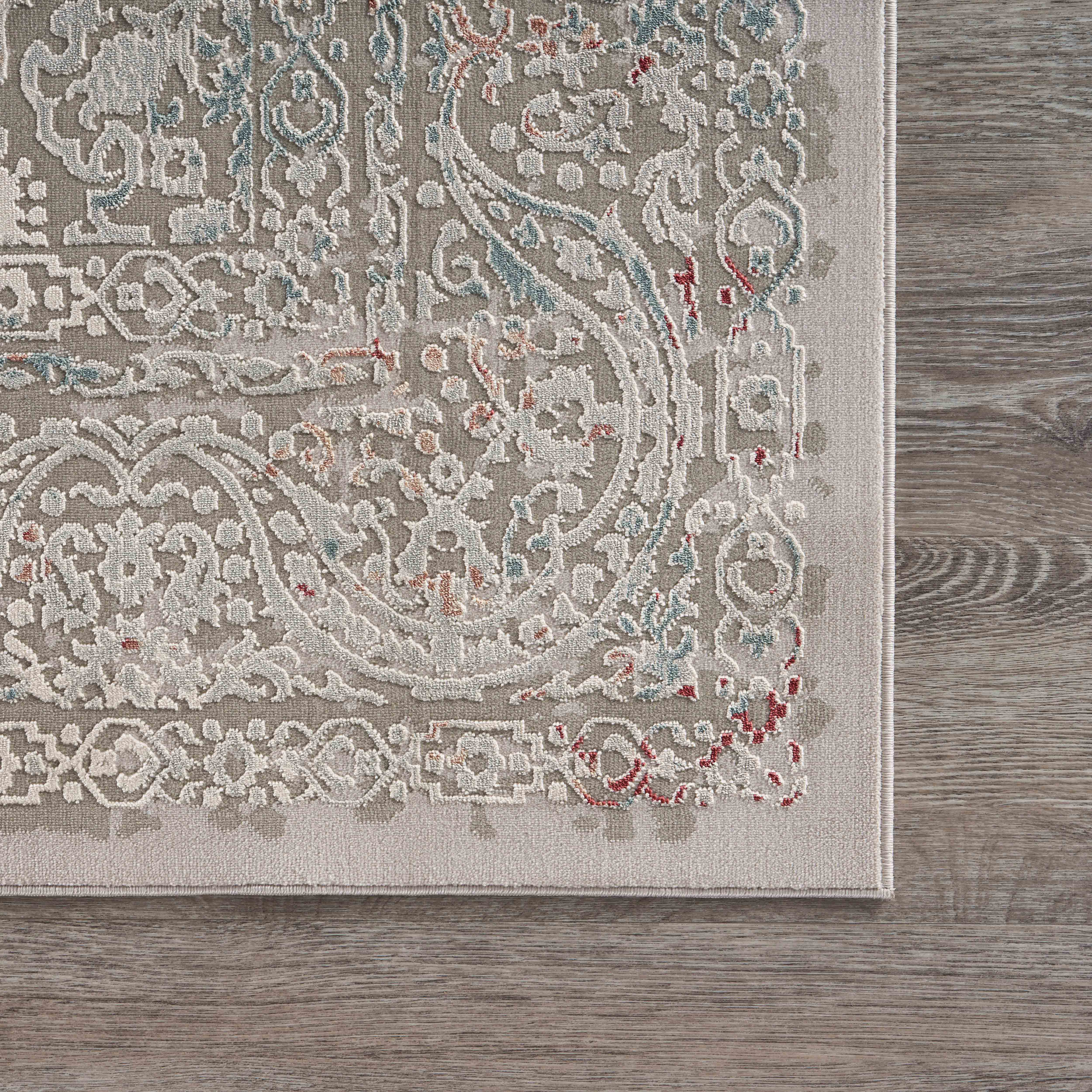 Add some artistry to your room with this 5-foot x 8-foot gray and red medallion distressed area rug. Ideal for spaces with kids and pets, this rug is stain resistant to help repel dirt and spilled liquids. Built to last, this rug crafted from polyester fibers is known for its durability and long lasting appeal. Rugs are a great way to showcase your style, hide imperfections, warm your home and reduce noise. This larger sized, modern styled rug is ready to create a focal point or statement piece in your room. 90.00-inch h x 63.00-inch w x 0.20-inch d.