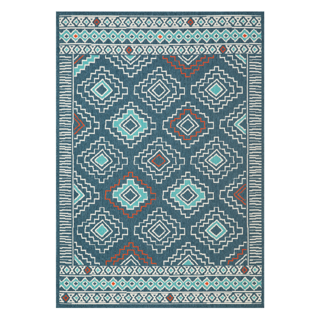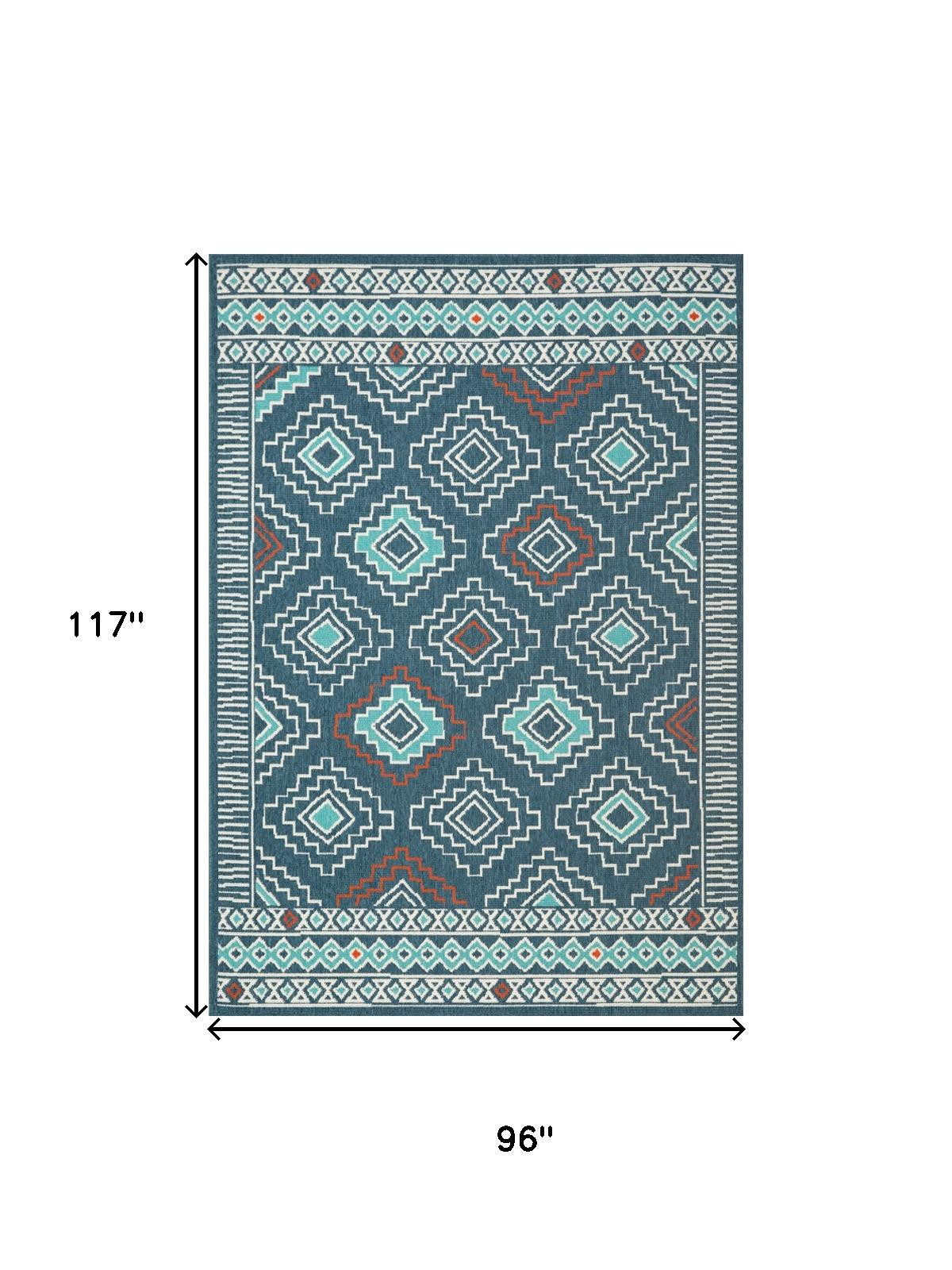 Add some artistry to your room with this 8-foot x 10-foot blue and ivory geometric area rug. Ideal for spaces with kids and pets, this rug is stain resistant to help repel dirt and spilled liquids. Built to last, this rug crafted from polypropylene fibers is known for its durability and long lasting appeal. Rugs are a great way to showcase your style, hide imperfections, warm your home and reduce noise. This larger sized, bohemian styled rug is ready to create a focal point or statement piece in your room. 117.00-inch h x 96.00-inch w x 0.50-inch d.