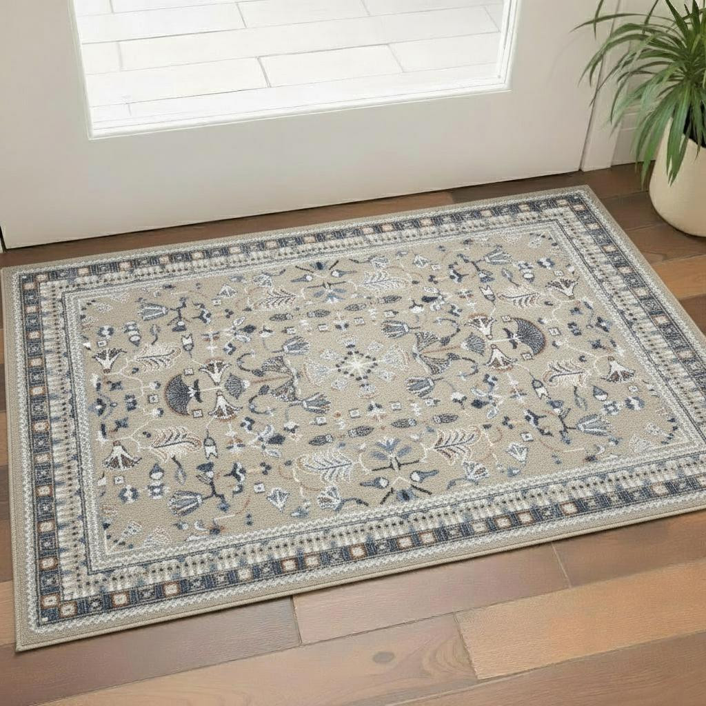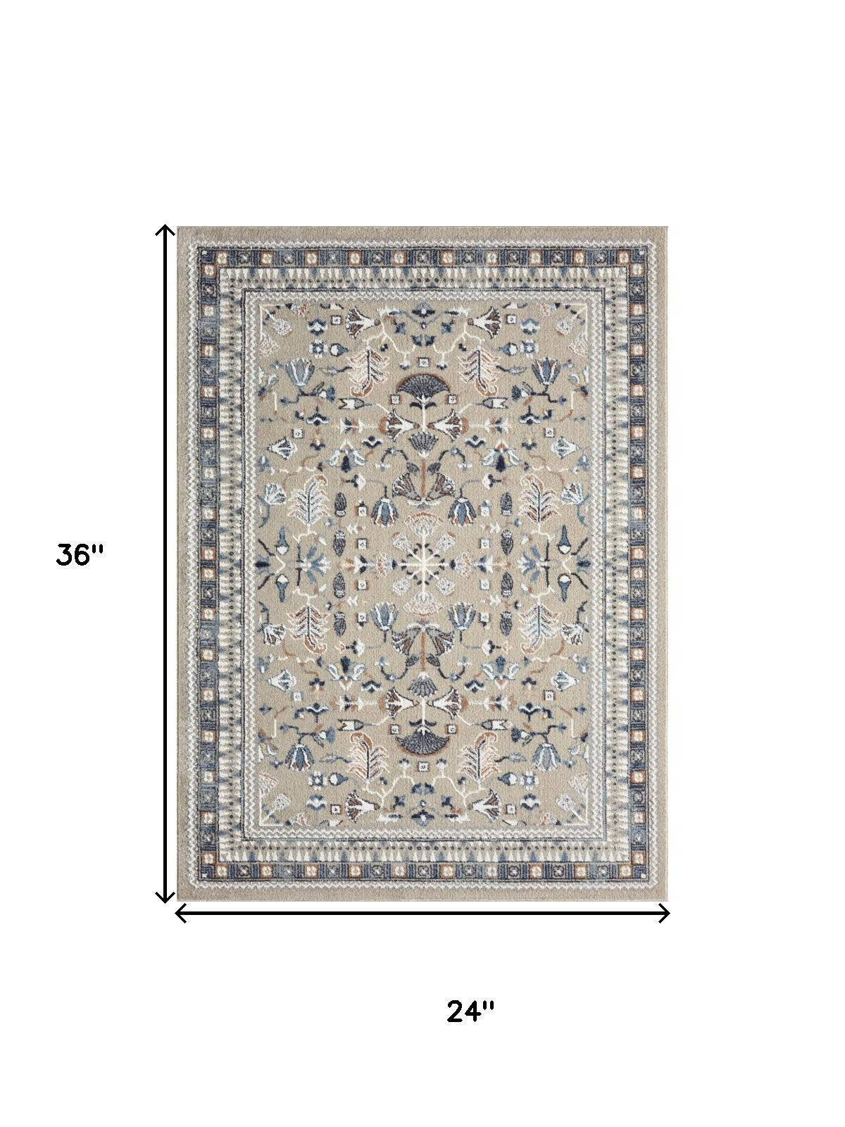 Set an inviting tone in your space with this 2-foot x 3-foot blue and beige floral area rug. Ideal for spaces with kids and pets, this rug is stain resistant to help repel dirt and spilled liquids. Rugs are a great way to showcase your style, hide imperfections, warm your home and reduce noise. This smaller sized, traditional styled rug is just what you need for your walkway, bedside, in front of door, cabinet, refrigerator, or chair. 36.00-inch h x 24.00-inch w x 0.20-inch d.