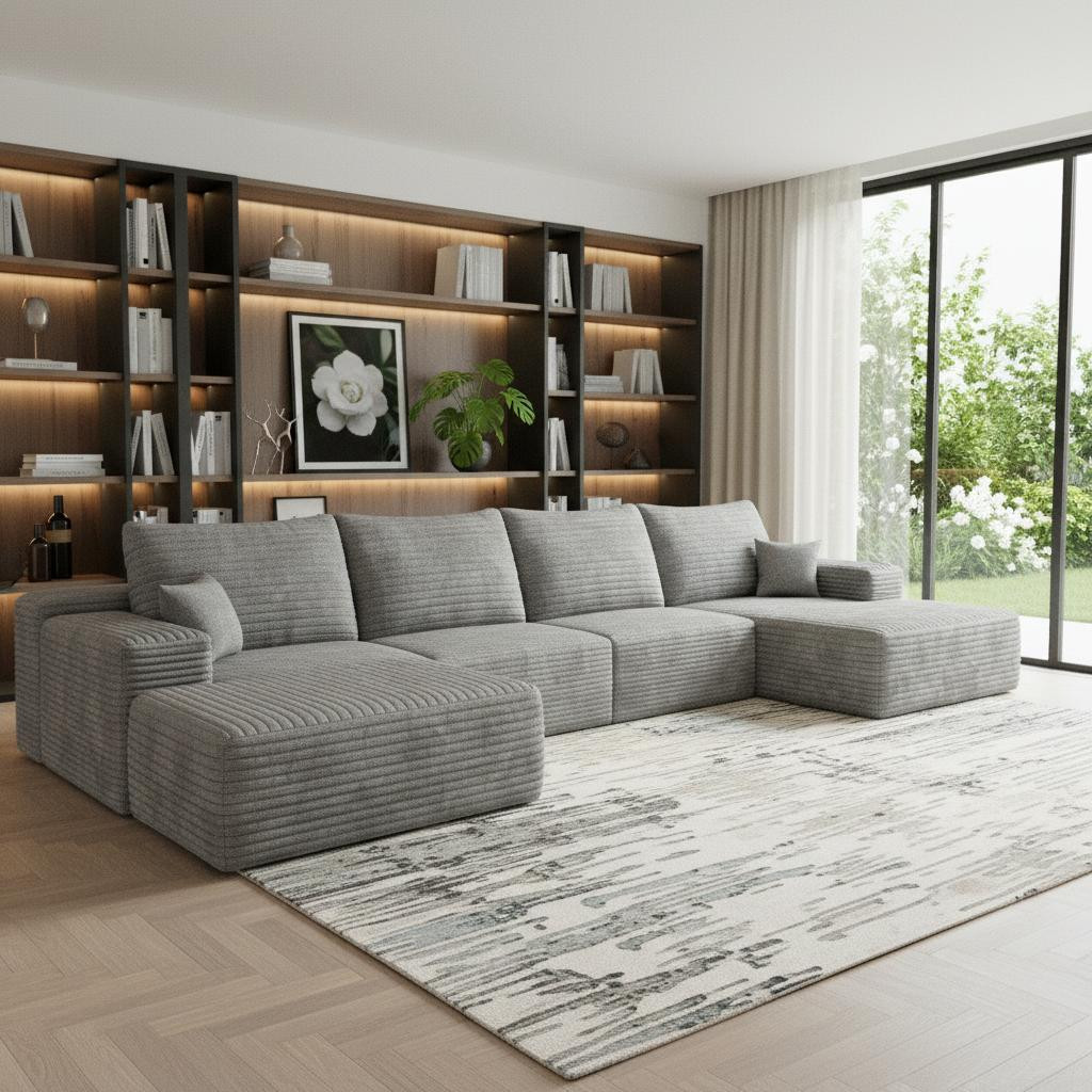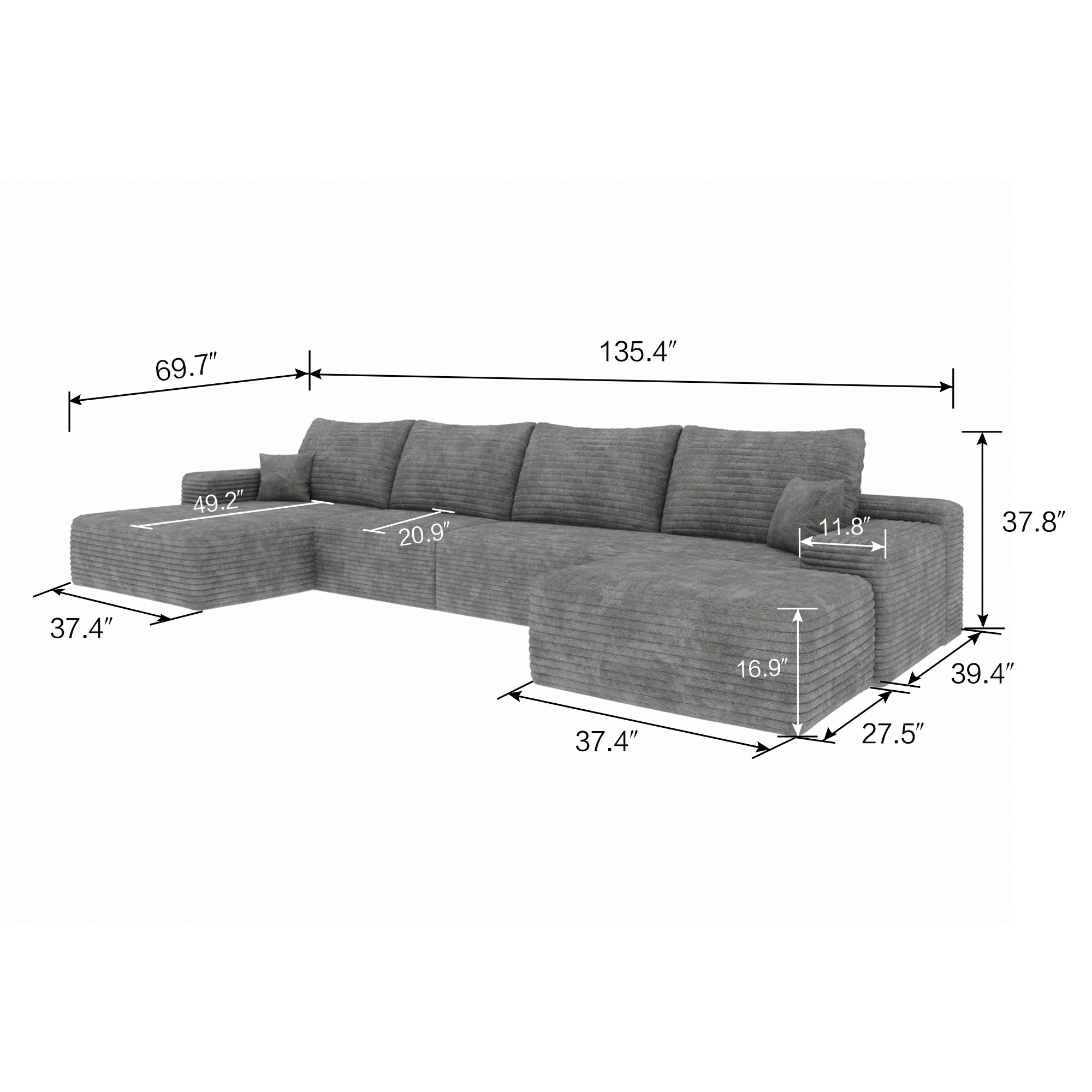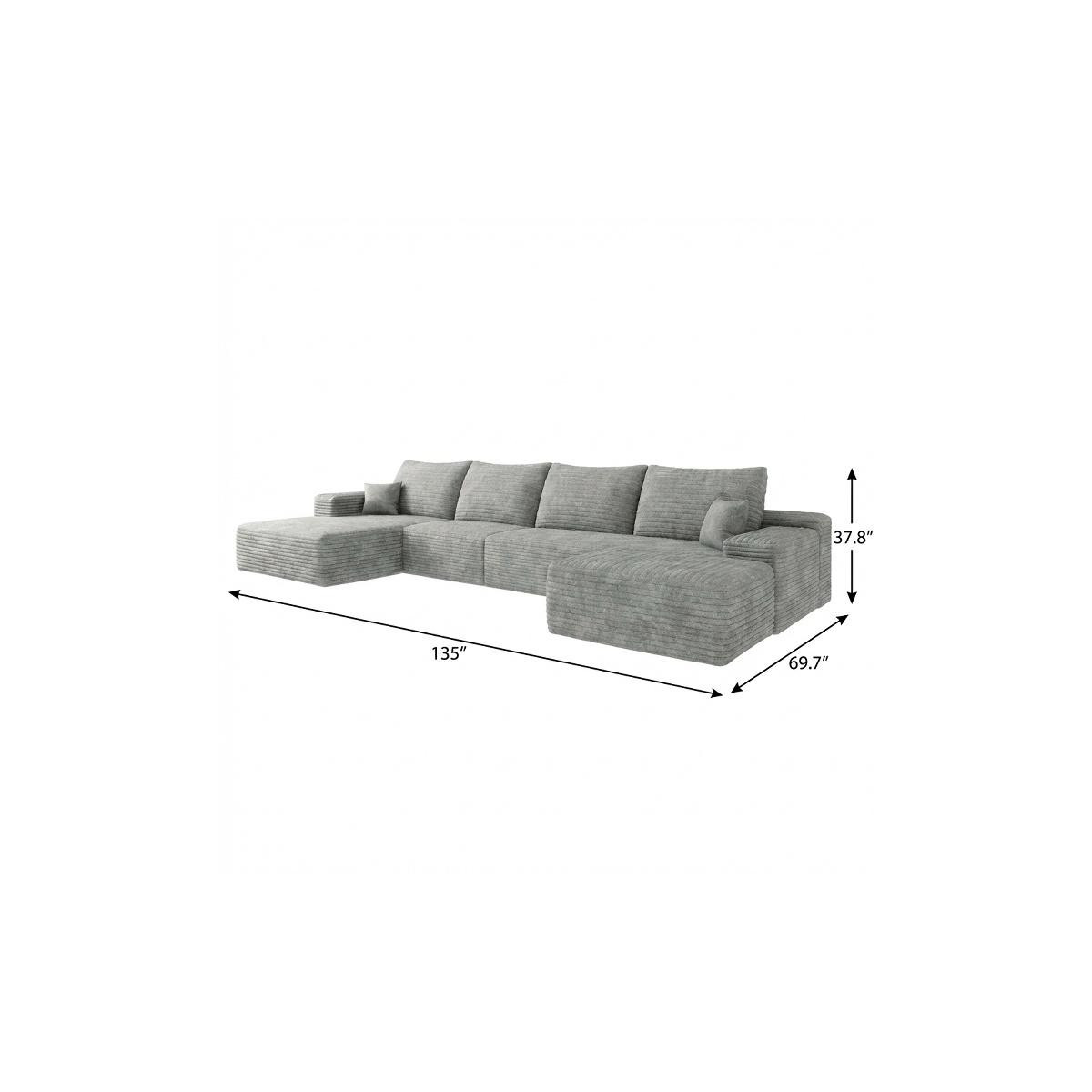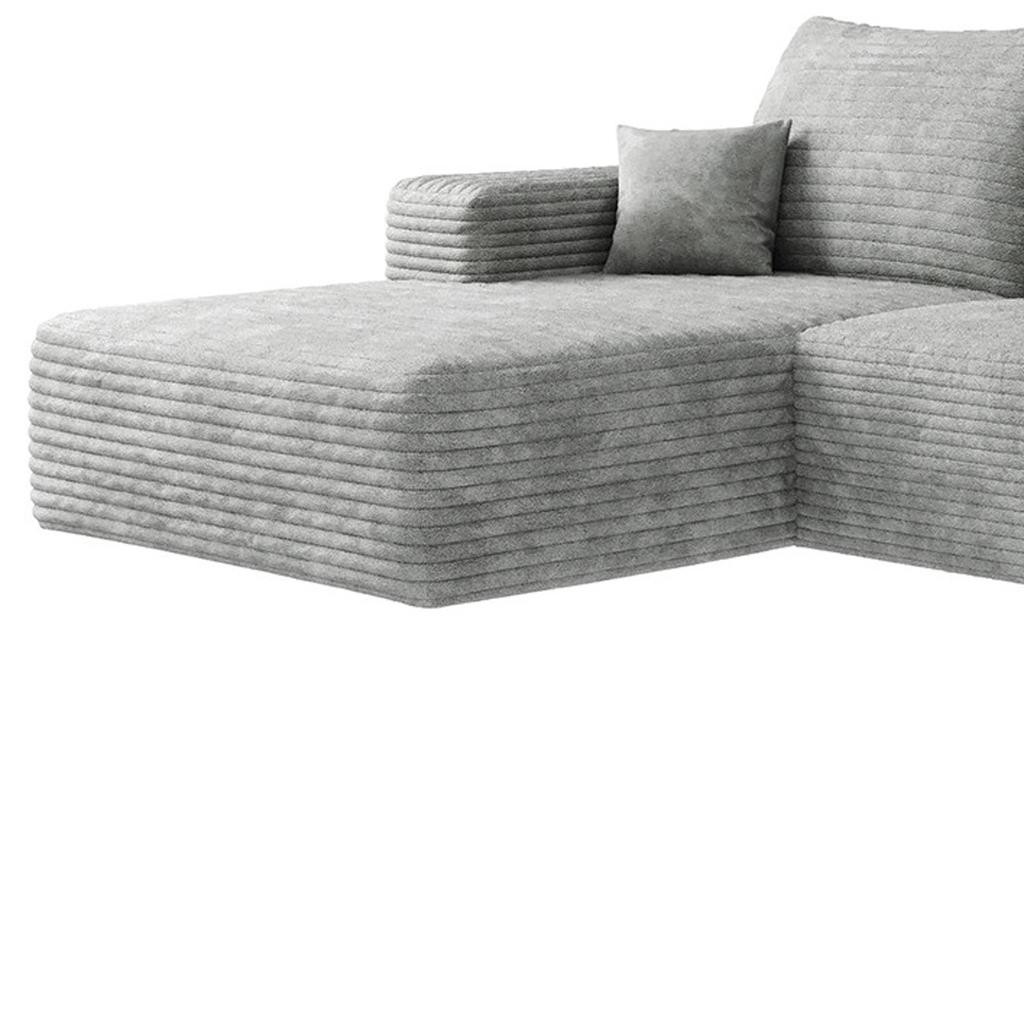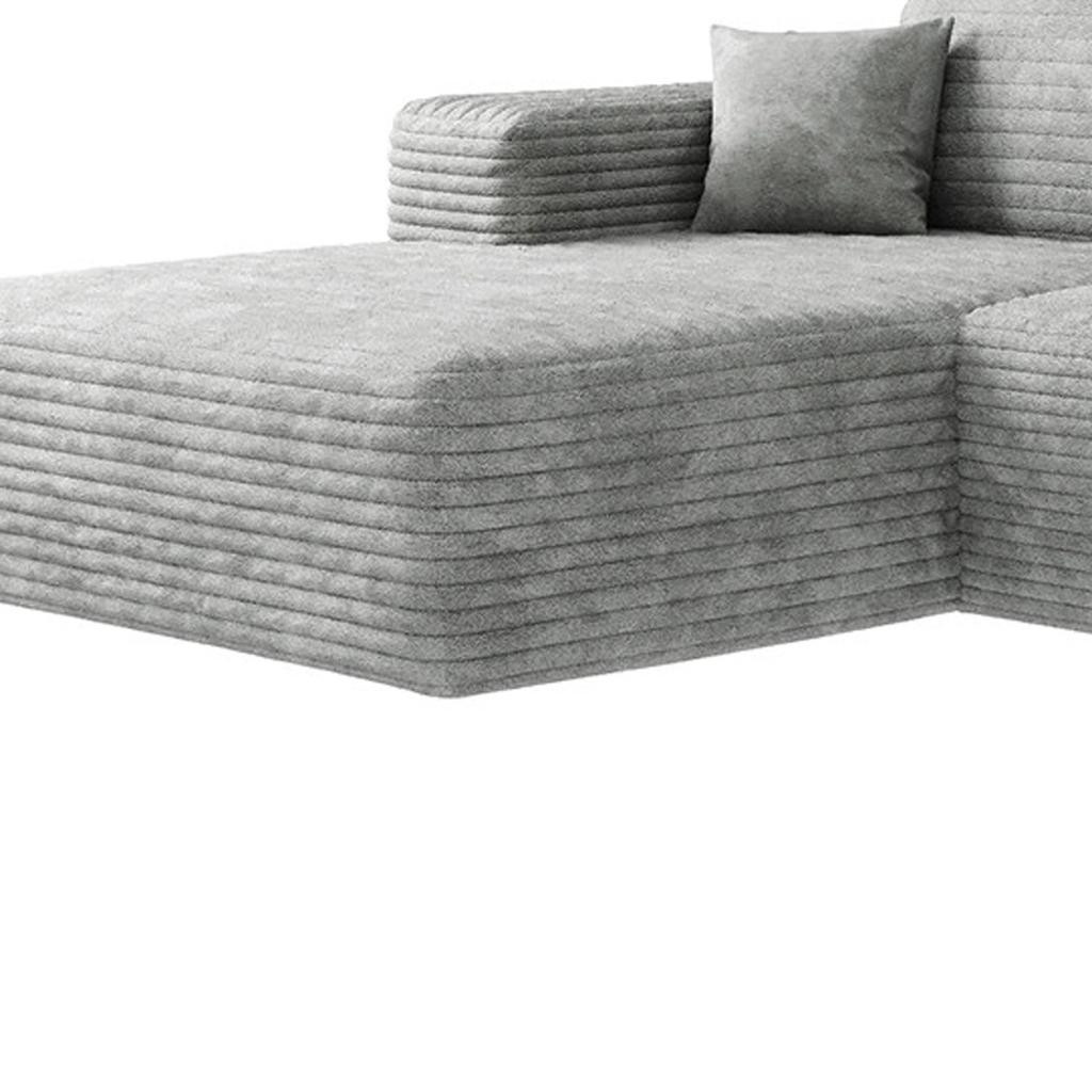 Designed for comfort and good looks, this 135-inch gray corduroy modular compression foam sofa with ottoman and toss pillows is a great option to anchor your space. This solid color modular is made from corduroy that is unique and gives this piece some special flair. Solid colors give you lots of decorative options and are easy to work into your decor scheme. A comfy ottoman is included as part of the package. Great to rest your feet or provide extra seating in a pinch. Fixed arms offer a comfy place to rest. A great showpiece for your room, this sofa is a must have. 37.80-inch h x 135.00-inch w x 69.70-inch d.