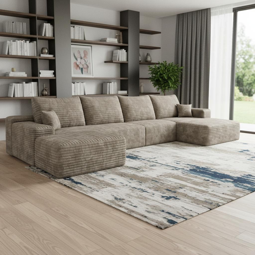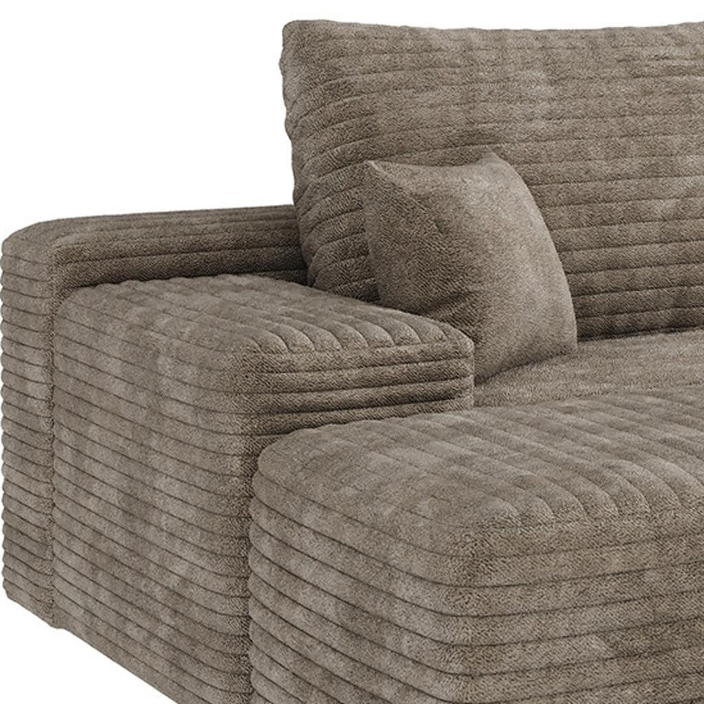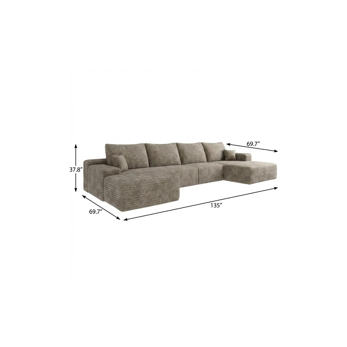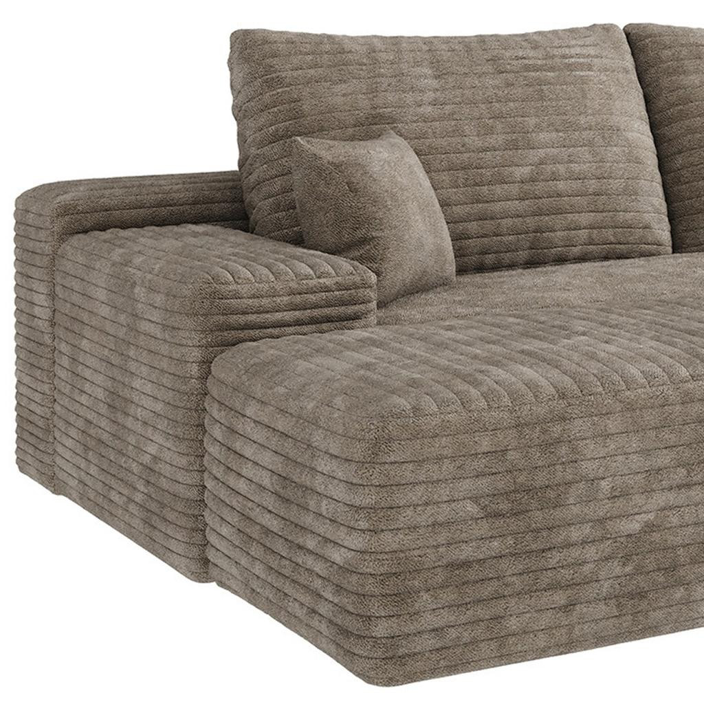Transform your home's interior with this luxurious 135-inch camel corduroy modular compression foam sofa with ottoman and toss pillows. This solid color modular is made from corduroy that is unique and gives this piece some special flair. Solid colors give you lots of decorative options and are easy to work into your decor scheme. Comes complete with a coordinating ottoman to rest your feet. The ottoman can also be used as additional seating option if needed. Fixed arms offer a comfy place to rest. Built to last, this sofa will be a great centerpiece for your room. 37.80-inch h x 135.00-inch w x 69.70-inch d.