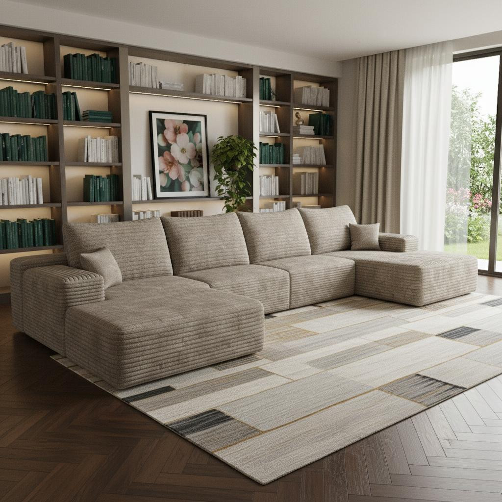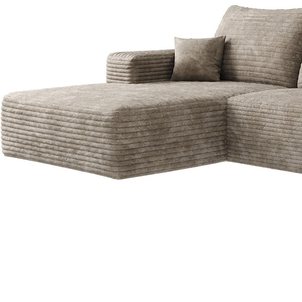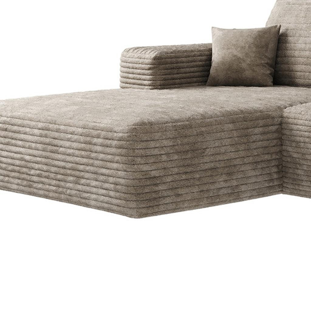 Add an air of fashion to your space with this fabulous 135-inch camel corduroy modular compression foam sofa with ottoman and toss pillows. This solid color modular is made from corduroy that is unique and gives this piece some special flair. Solid colors give you lots of decorative options and are easy to work into your decor scheme. Comes complete with a coordinating ottoman to rest your feet. The ottoman can also be used as additional seating option if needed. Fixed arms offer a comfy place to rest. A great showpiece for your room, this sofa is a must have. 37.80-inch h x 135.00-inch w x 69.70-inch d.