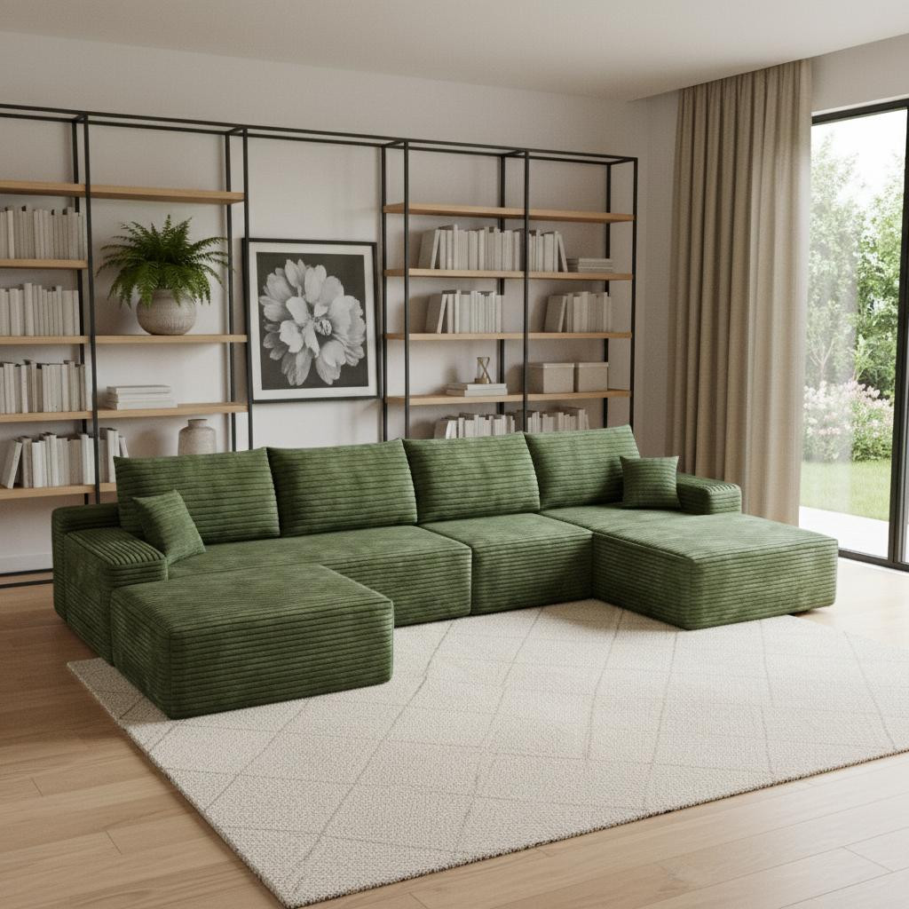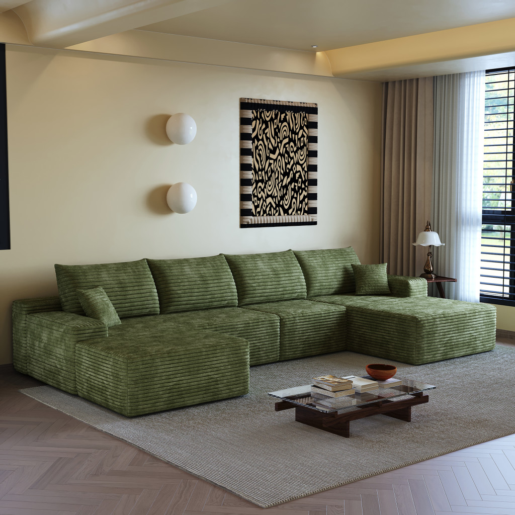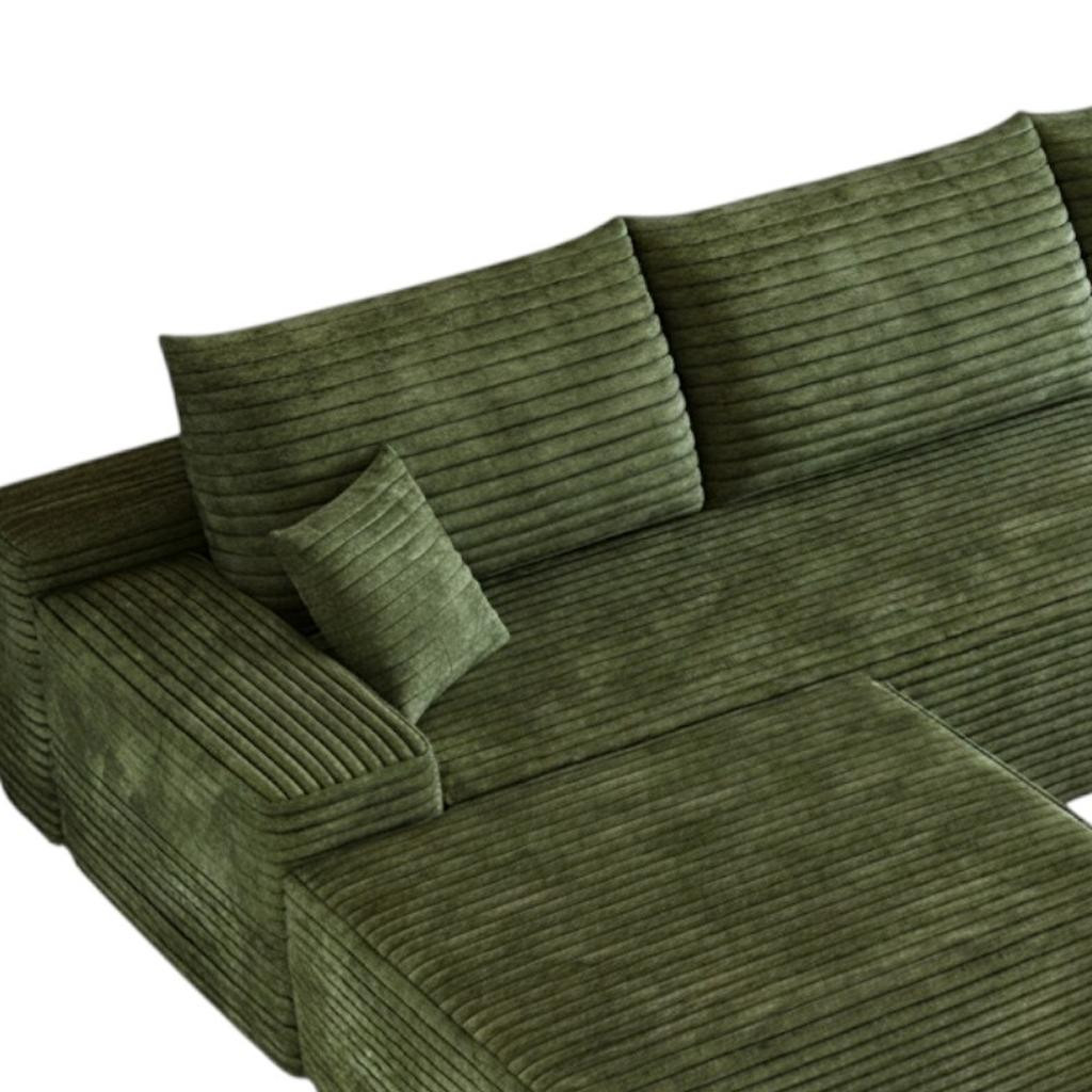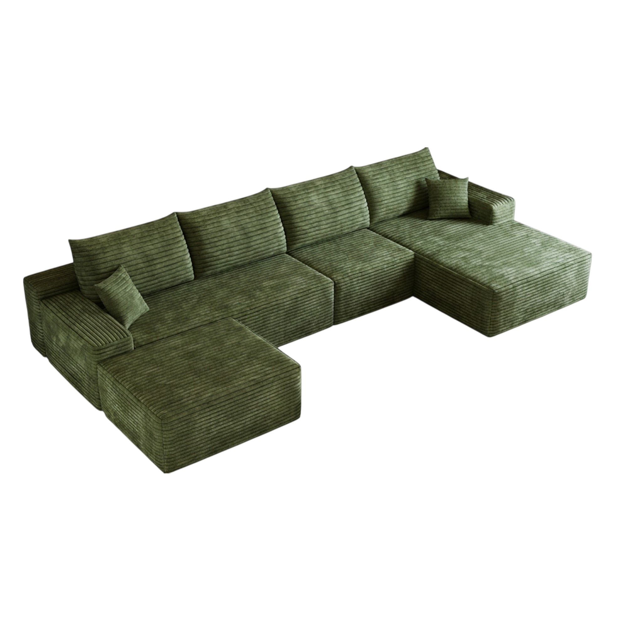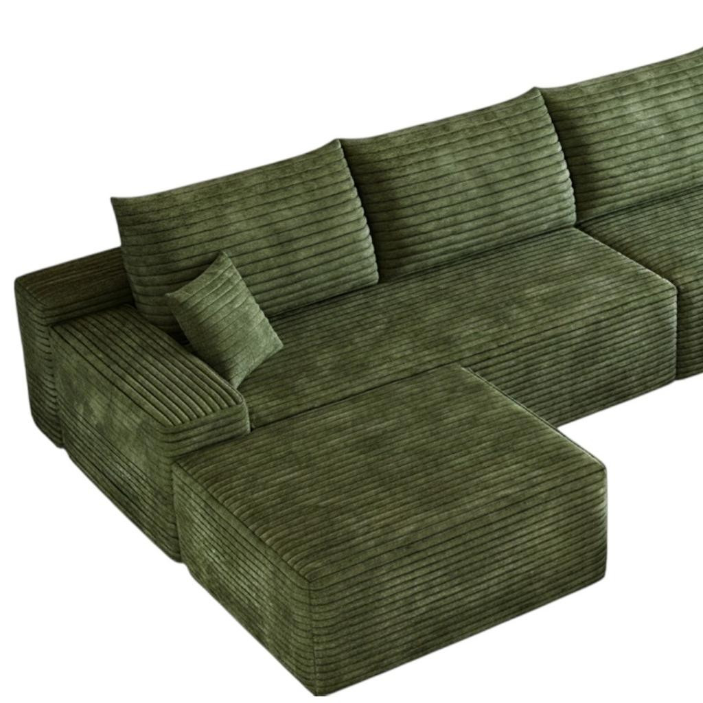 Designed for comfort and good looks, this 135-inch green corduroy modular compression foam sofa with ottoman and toss pillows is a great option to anchor your space. This solid color modular is made from corduroy that is unique and gives this piece some special flair. Solid colors give you lots of decorative options and are easy to work into your decor scheme. Comes complete with a coordinating ottoman to rest your feet. The ottoman can also be used as additional seating option if needed. Fixed arms offer a comfy place to rest. Built to last, this sofa will be a great centerpiece for your room. 37.80-inch h x 135.00-inch w x 69.70-inch d.