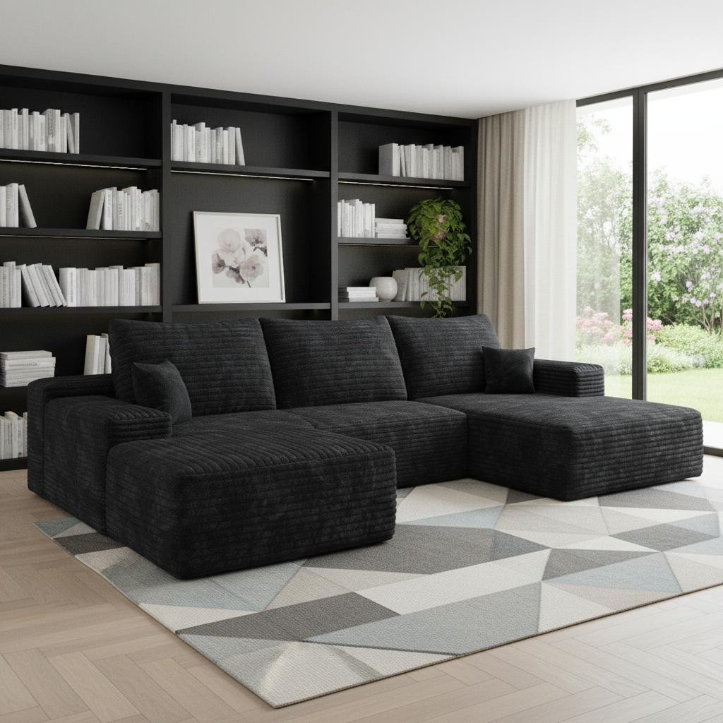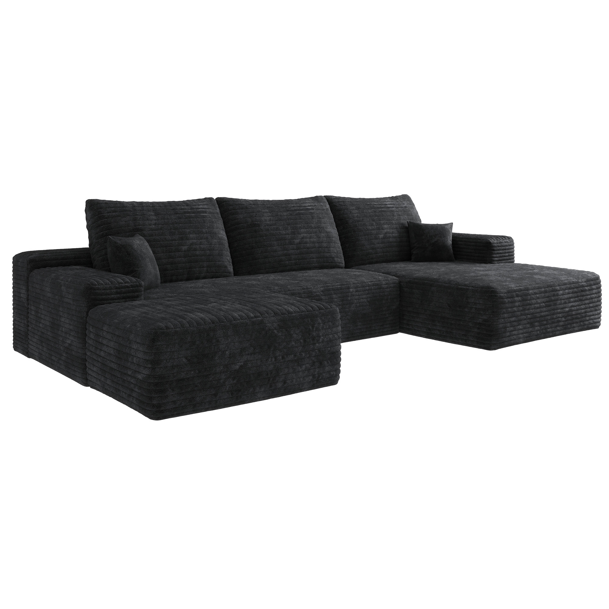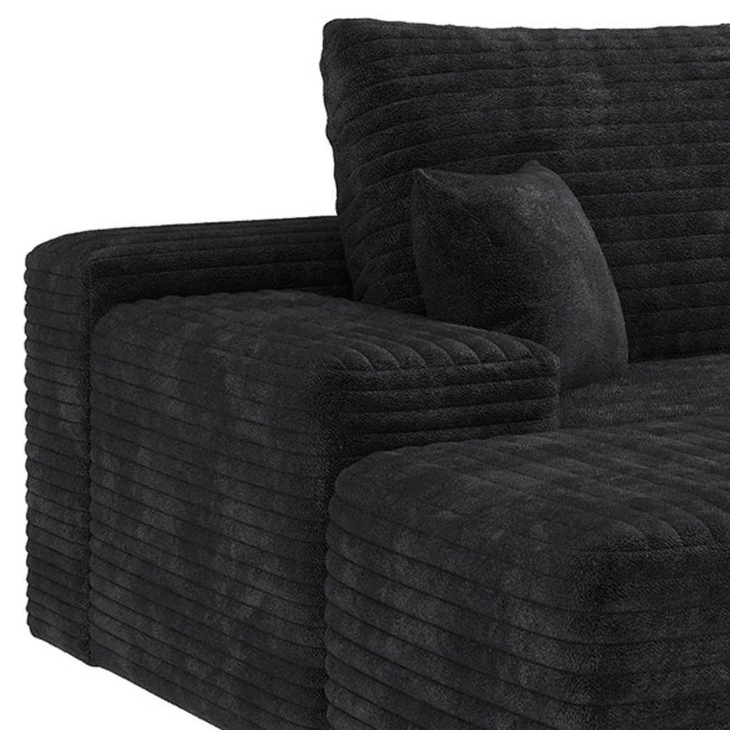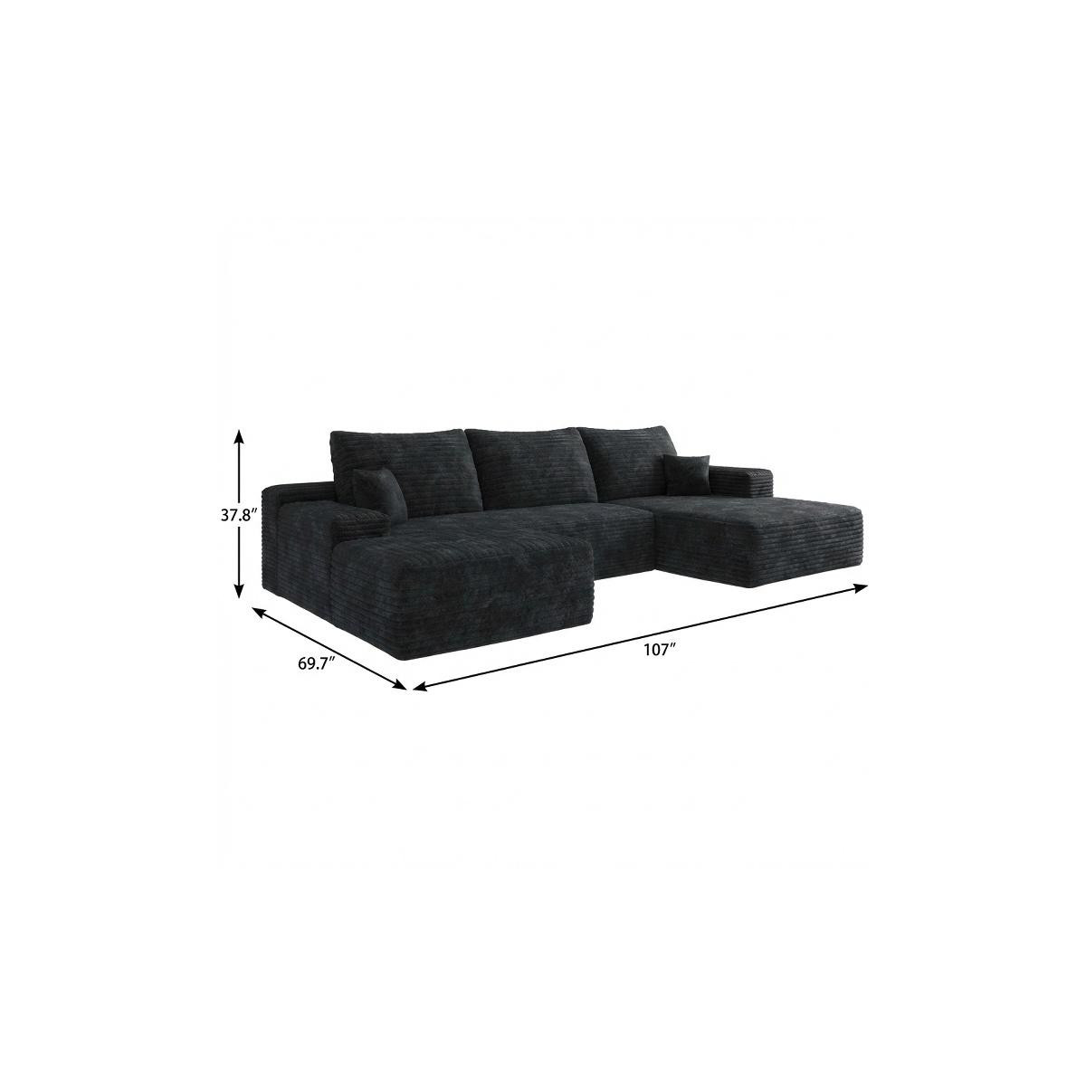 Transform your home's interior with this luxurious 107-inch black corduroy modular compression foam sofa with ottoman and toss pillows. This solid color modular is made from corduroy that is unique and gives this piece some special flair. Solid colors give you lots of decorative options and are easy to work into your decor scheme. Comes complete with a coordinating ottoman to rest your feet. The ottoman can also be used as additional seating option if needed. Fixed arms offer a comfy place to rest. Built to last, this sofa will be a great centerpiece for your room. 37.80-inch h x 107.00-inch w x 69.70-inch d.