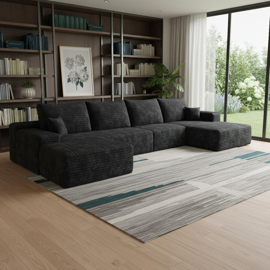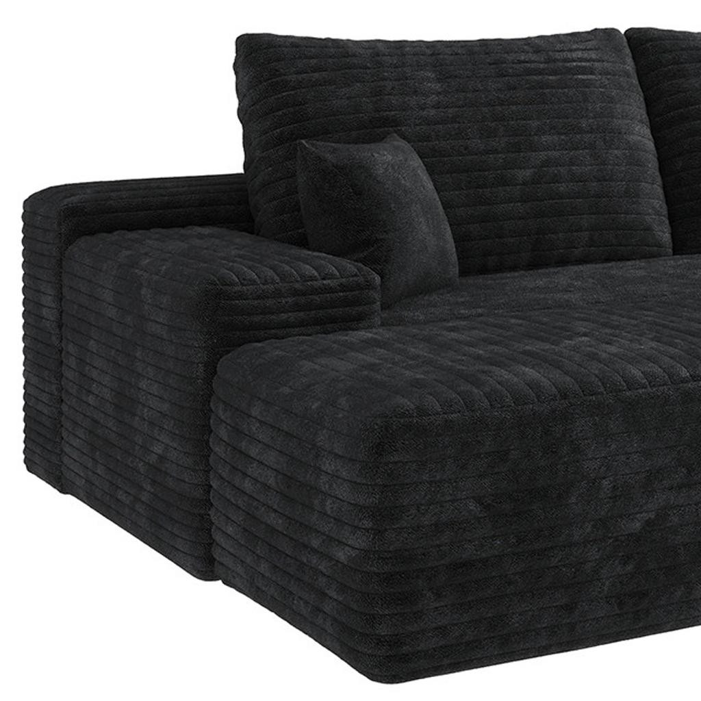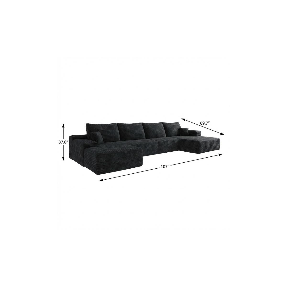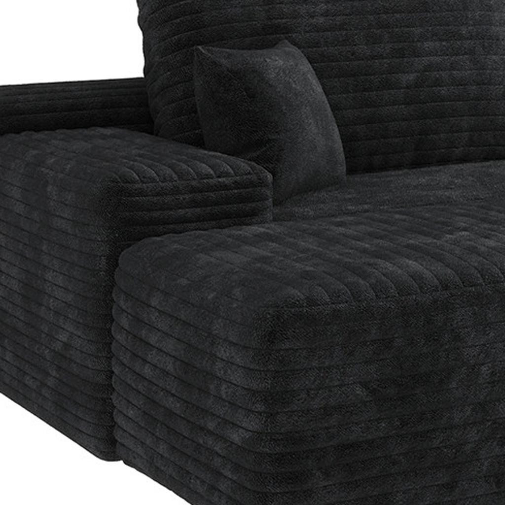 Add an air of fashion to your space with this fabulous 107-inch black corduroy modular compression foam sofa with ottoman and toss pillows. This solid color modular is made from corduroy that is unique and gives this piece some special flair. Solid colors give you lots of decorative options and are easy to work into your decor scheme. Comes complete with a coordinating ottoman to rest your feet. The ottoman can also be used as additional seating option if needed. Fixed arms offer a comfy place to rest. A great showpiece for your room, this sofa is a must have. 37.80-inch h x 107.00-inch w x 69.70-inch d.