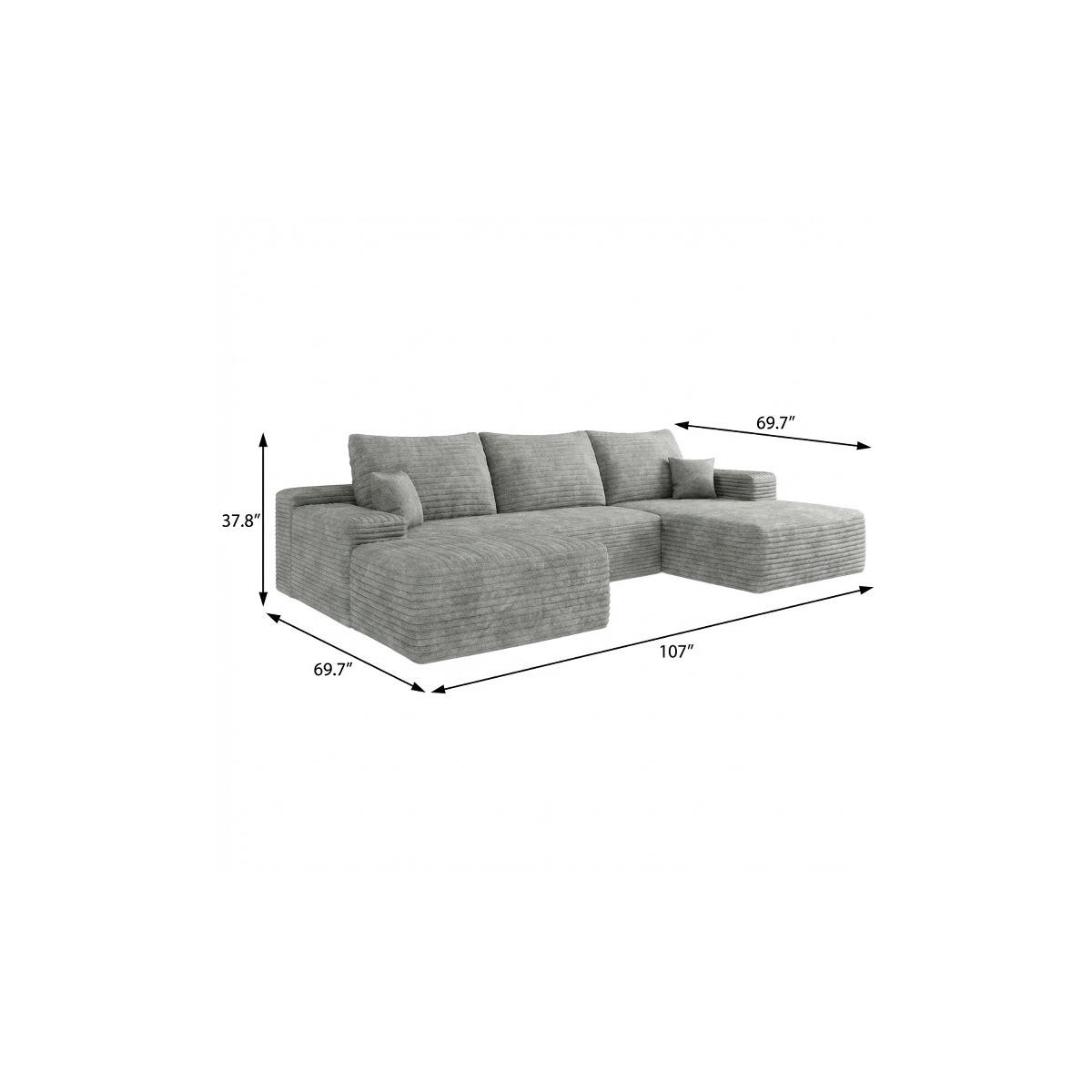Transform your home's interior with this luxurious 107-inch gray corduroy modular compression foam sofa with ottoman and toss pillows. This solid color modular is made from corduroy that is unique and gives this piece some special flair. Solid colors give you lots of decorative options and are easy to work into your decor scheme. Comes complete with a coordinating ottoman to rest your feet. The ottoman can also be used as additional seating option if needed. Fixed arms offer a comfy place to rest. Built to last, this sofa will be a great centerpiece for your room. 37.80-inch h x 107.00-inch w x 69.70-inch d.