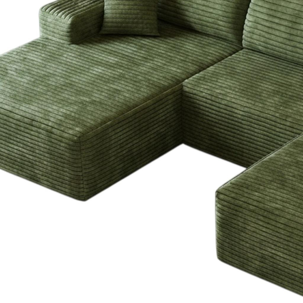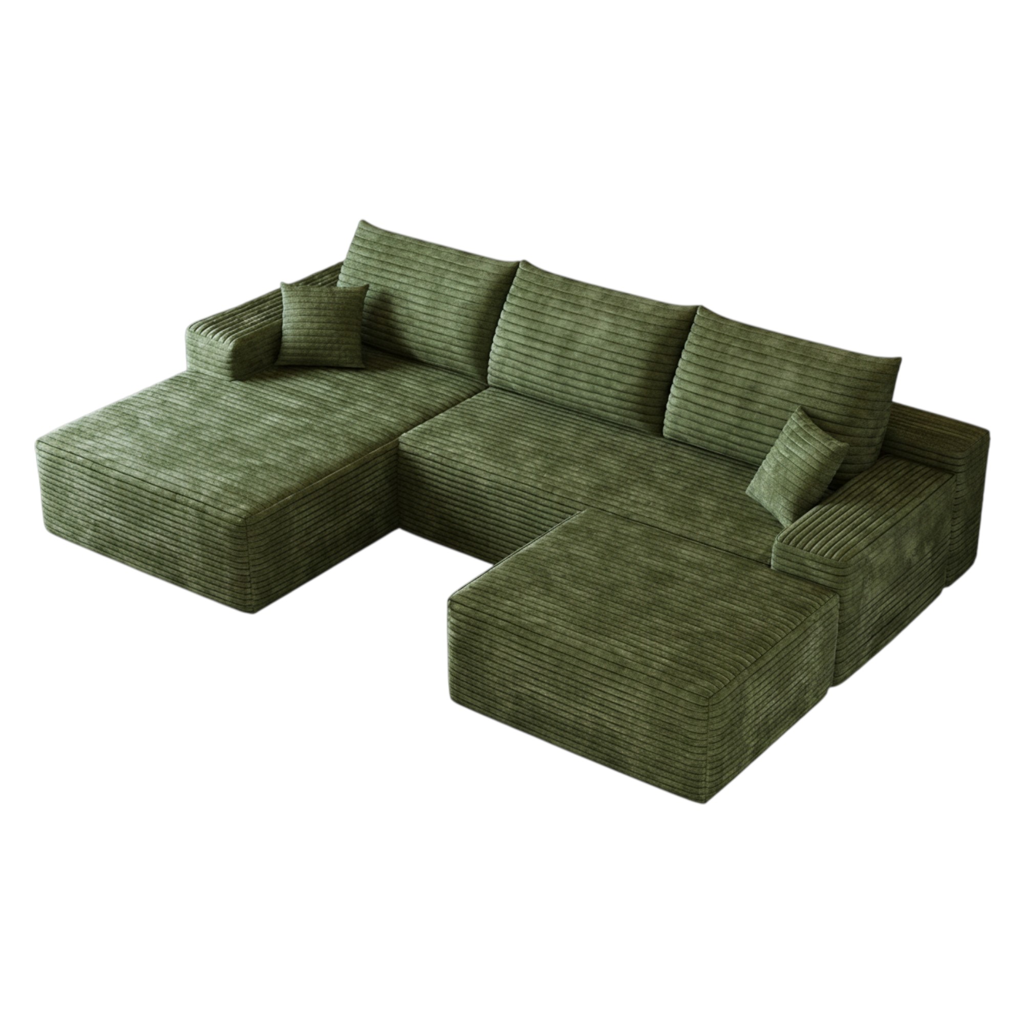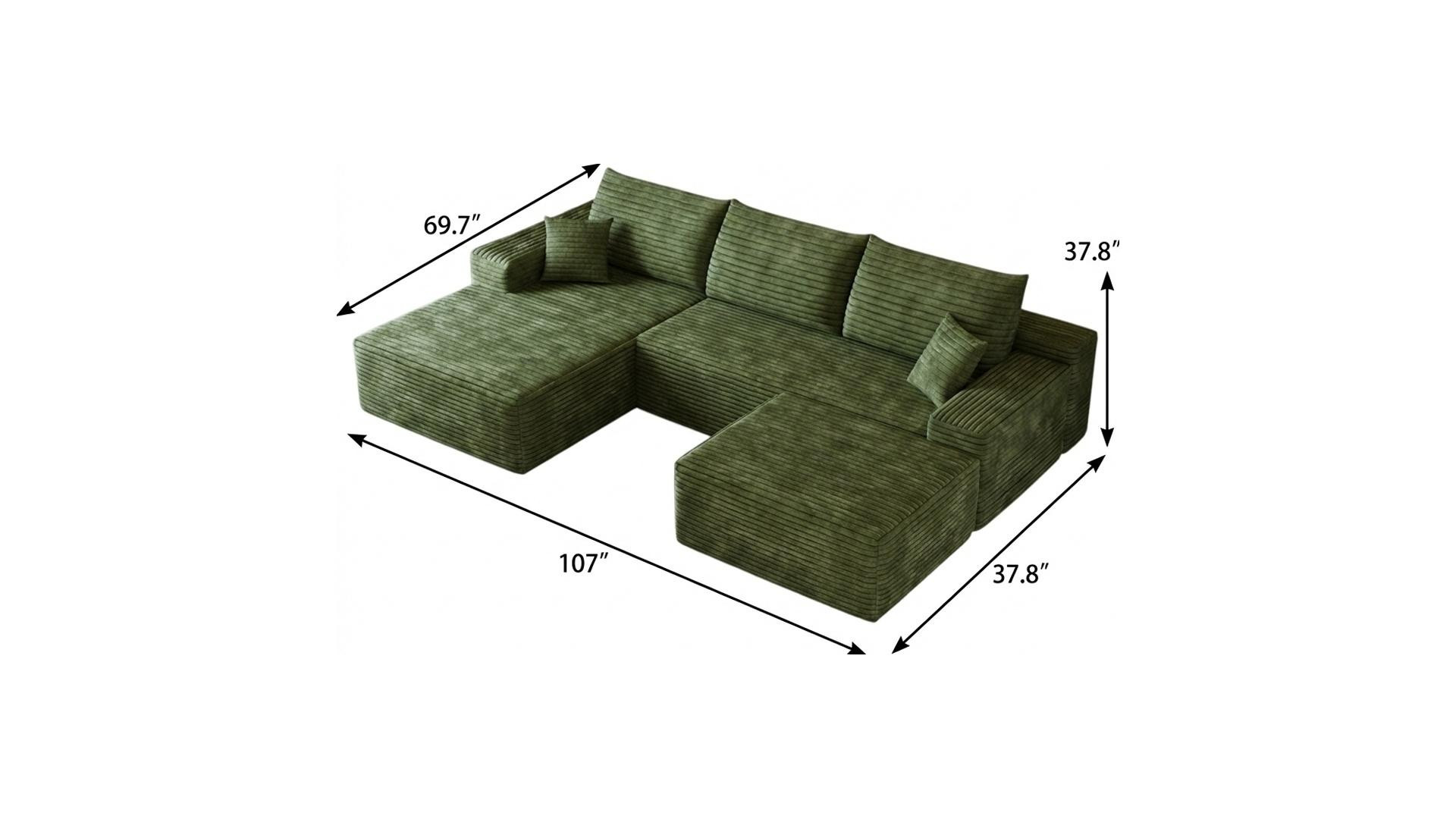 Designed for comfort and good looks, this 107-inch green corduroy modular compression foam sofa with ottoman and toss pillows is a great option to anchor your space. This solid color modular is made from corduroy that is unique and gives this piece some special flair. Solid colors give you lots of decorative options and are easy to work into your decor scheme. A comfy ottoman is included as part of the package. Great to rest your feet or provide extra seating in a pinch. Fixed arms offer a comfy place to rest. A great showpiece for your room, this sofa is a must have. 37.80-inch h x 107.00-inch w x 69.70-inch d.