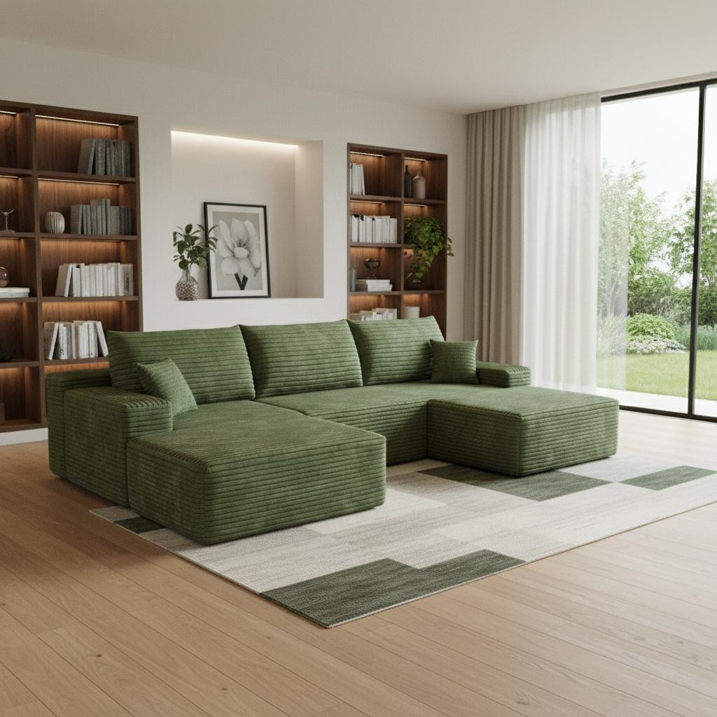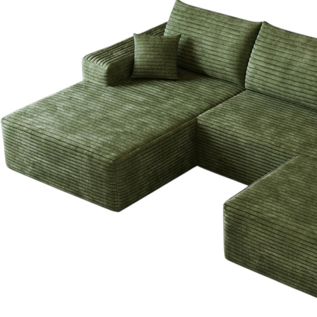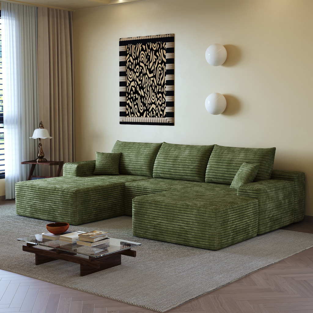 Designed for comfort and good looks, this 107-inch green corduroy modular compression foam sofa with ottoman and toss pillows is a great option to anchor your space. This solid color modular is made from corduroy that is unique and gives this piece some special flair. Solid colors give you lots of decorative options and are easy to work into your decor scheme. A comfy ottoman is included as part of the package. Great to rest your feet or provide extra seating in a pinch. Fixed arms offer a comfy place to rest. A great showpiece for your room, this sofa is a must have. 37.80-inch h x 107.00-inch w x 69.70-inch d.