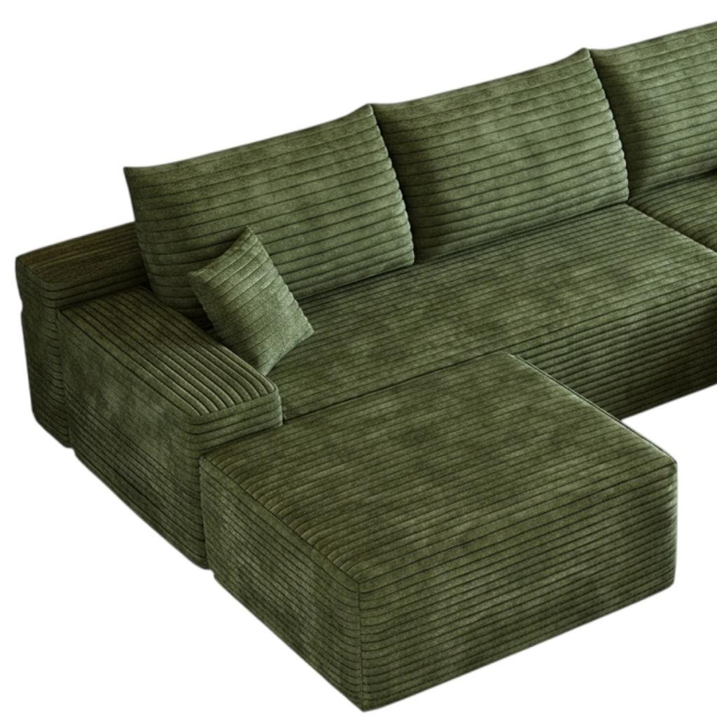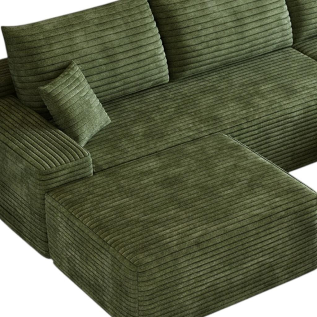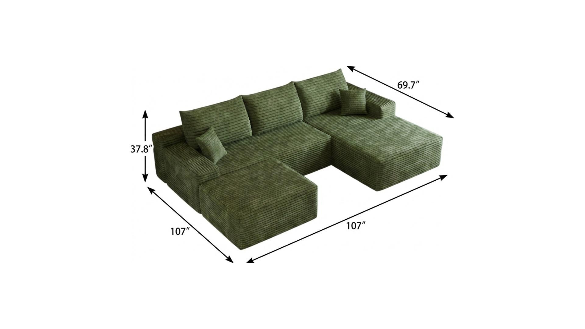Transform your home's interior with this luxurious 107-inch green corduroy modular compression foam sofa with ottoman and toss pillows. This solid color modular is made from corduroy that is unique and gives this piece some special flair. Solid colors give you lots of decorative options and are easy to work into your decor scheme. A comfy ottoman is included as part of the package. Great to rest your feet or provide extra seating in a pinch. Fixed arms offer a comfy place to rest. A great showpiece for your room, this sofa is a must have. 37.80-inch h x 107.00-inch w x 69.70-inch d.