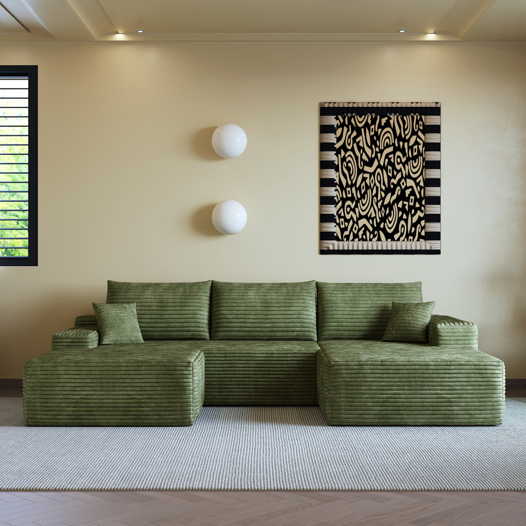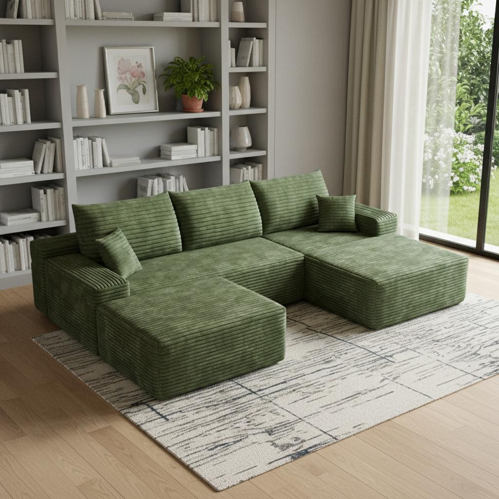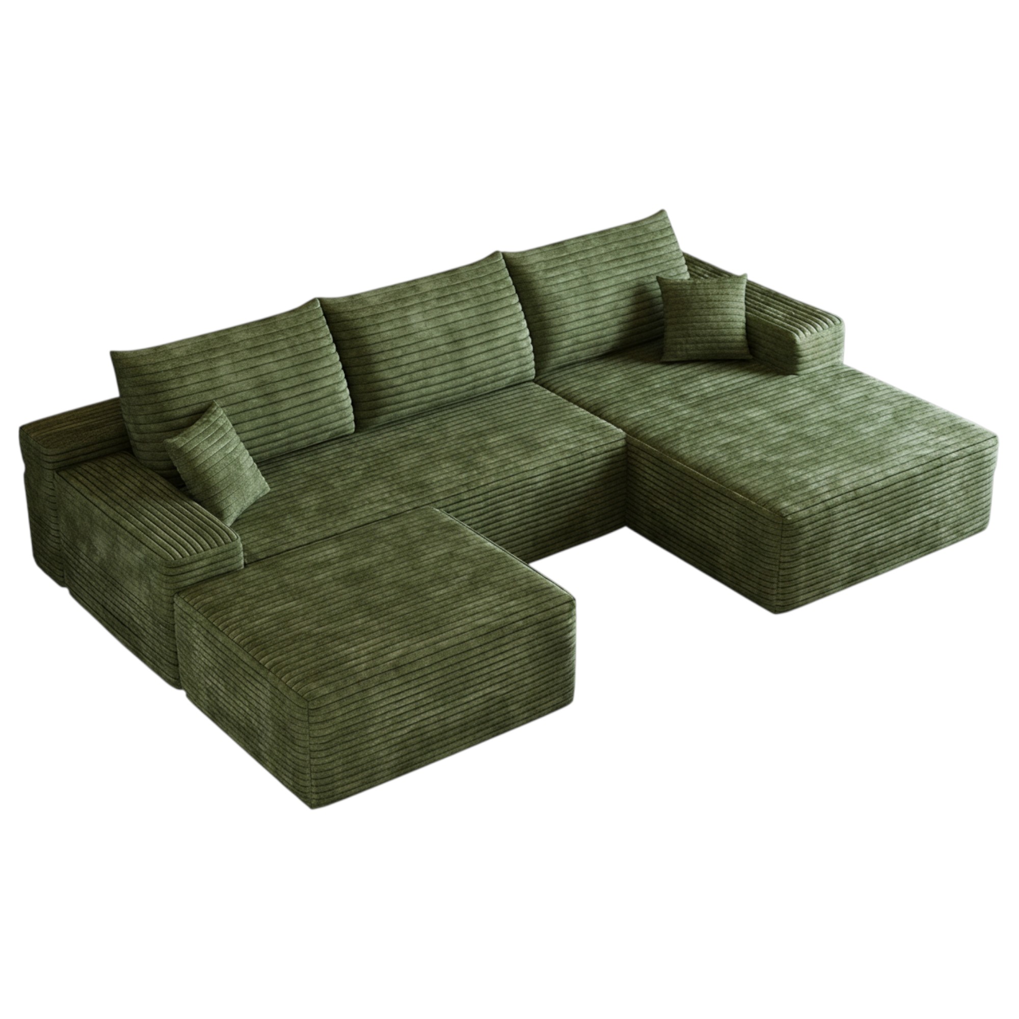 Transform your home's interior with this luxurious 107-inch green corduroy modular compression foam sofa with ottoman and toss pillows. This solid color modular is made from corduroy that is unique and gives this piece some special flair. Solid colors give you lots of decorative options and are easy to work into your decor scheme. A comfy ottoman is included as part of the package. Great to rest your feet or provide extra seating in a pinch. Fixed arms offer a comfy place to rest. A great showpiece for your room, this sofa is a must have. 37.80-inch h x 107.00-inch w x 69.70-inch d.