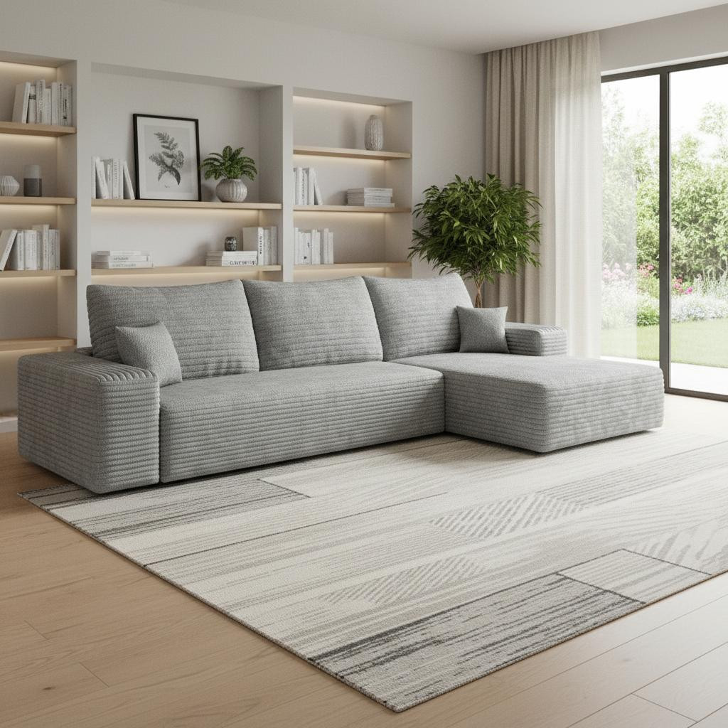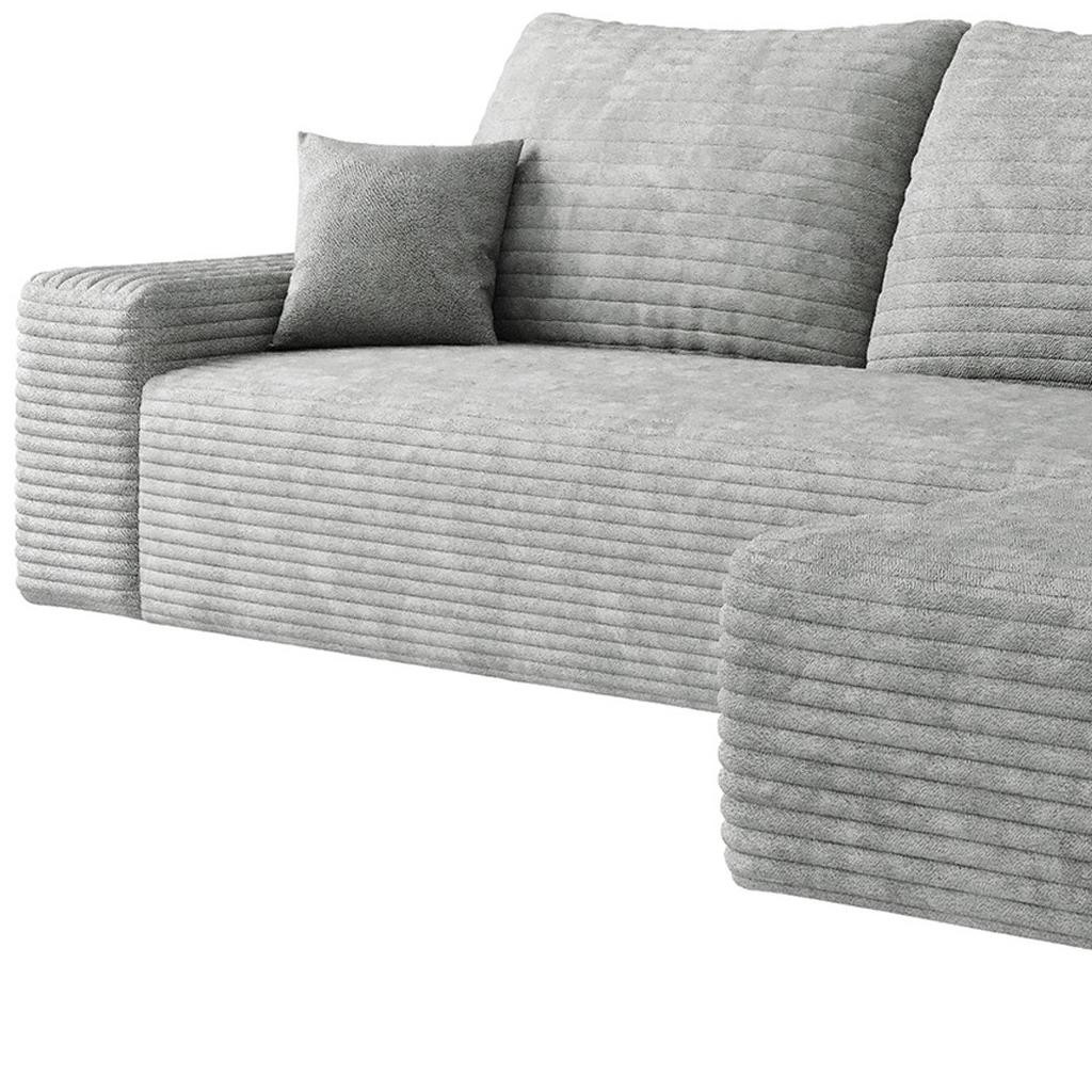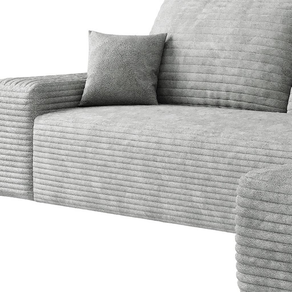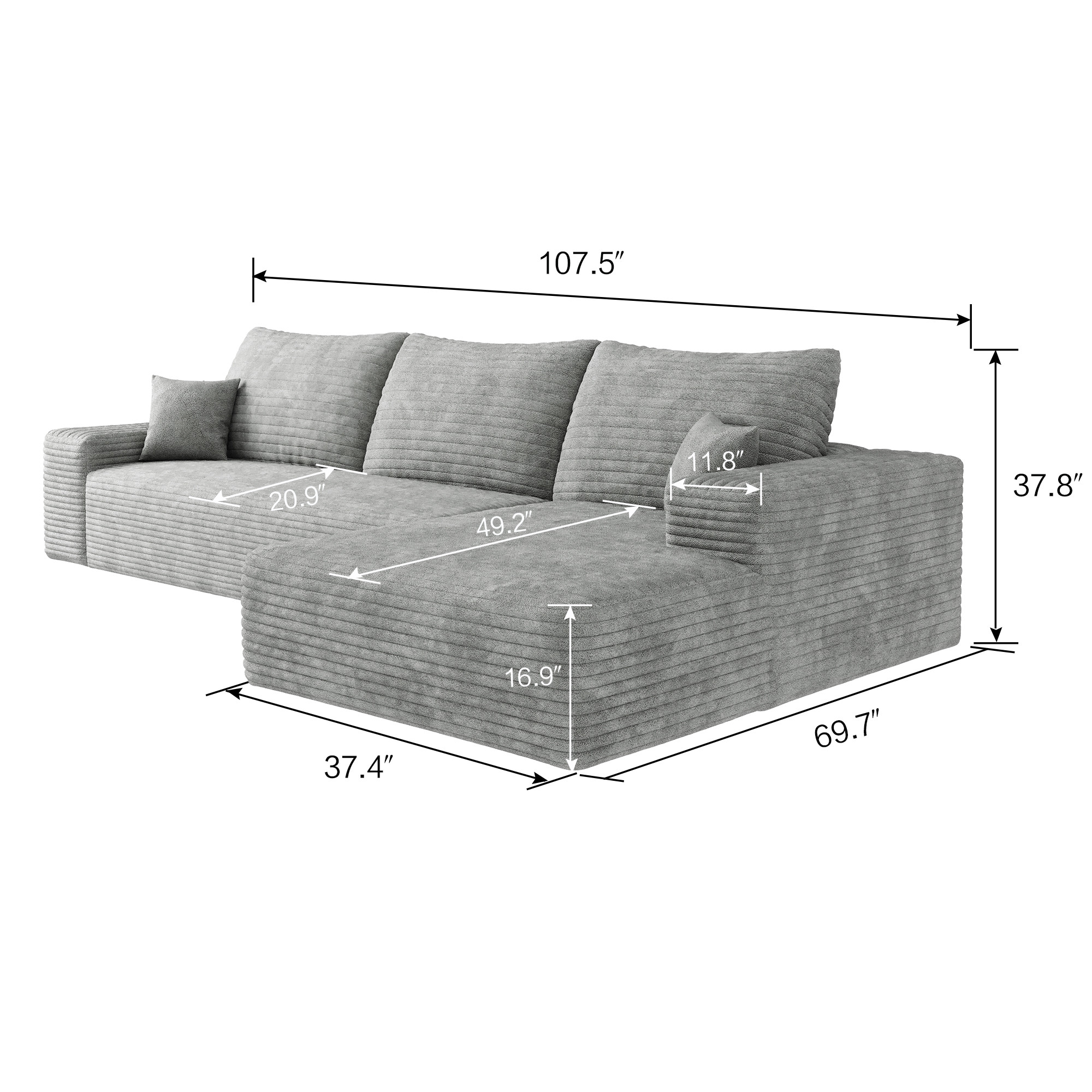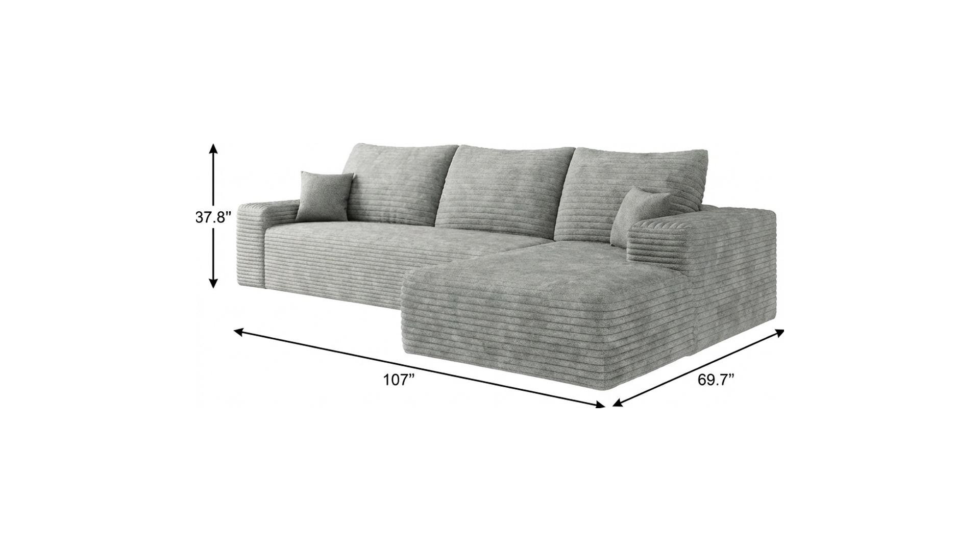 Add an air of fashion to your space with this fabulous 107-inch gray corduroy modular compression foam sofa with toss pillows. This solid color modular is made from corduroy that is unique and gives this piece some special flair. Solid colors give you lots of decorative options and are easy to work into your decor scheme. Fixed arms offer a comfy place to rest. Built to last, this sofa will be a great centerpiece for your room. 37.80-inch h x 107.00-inch w x 69.70-inch d.