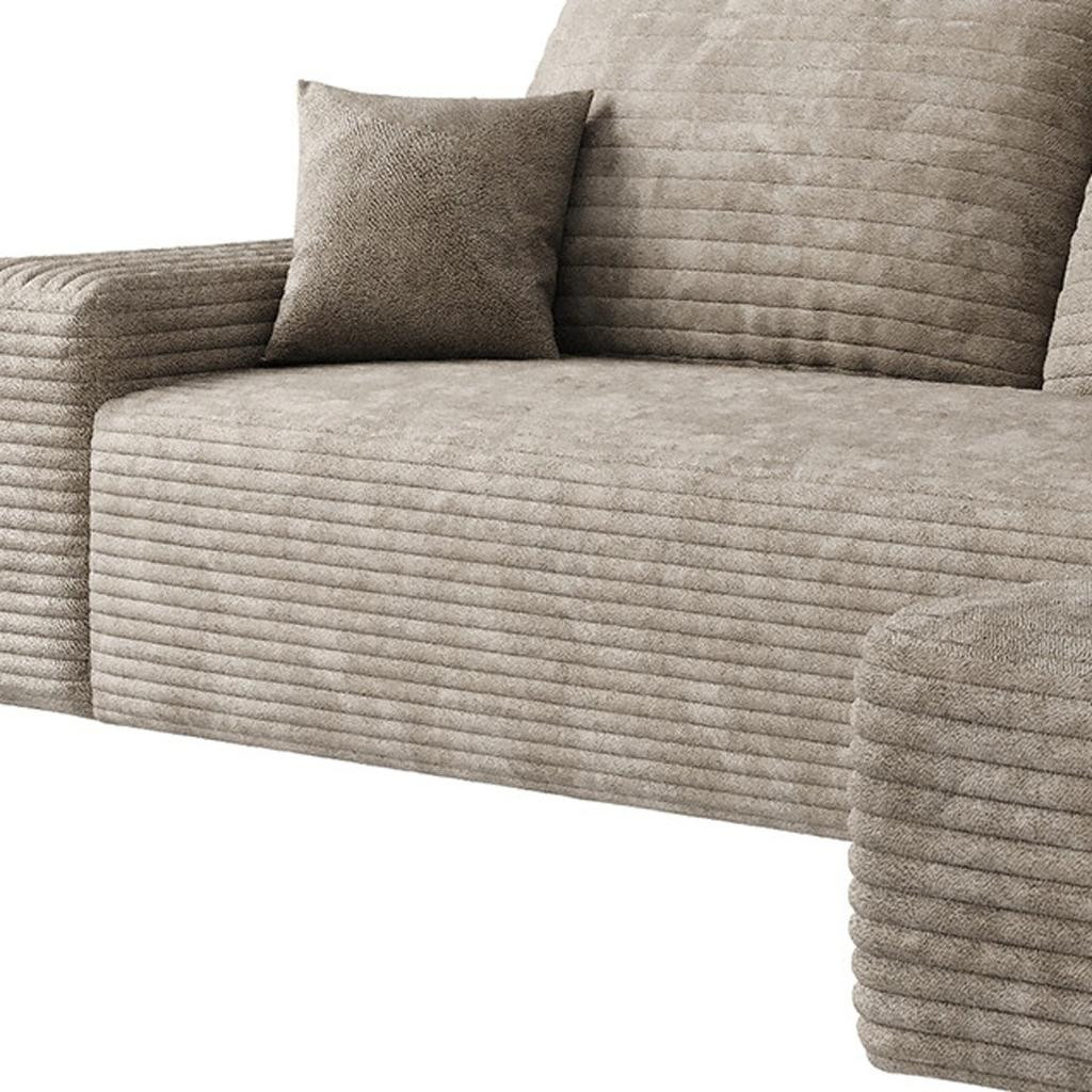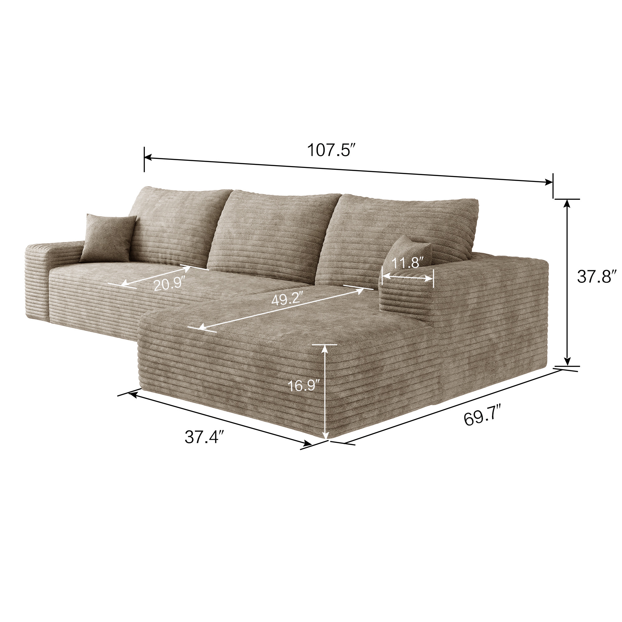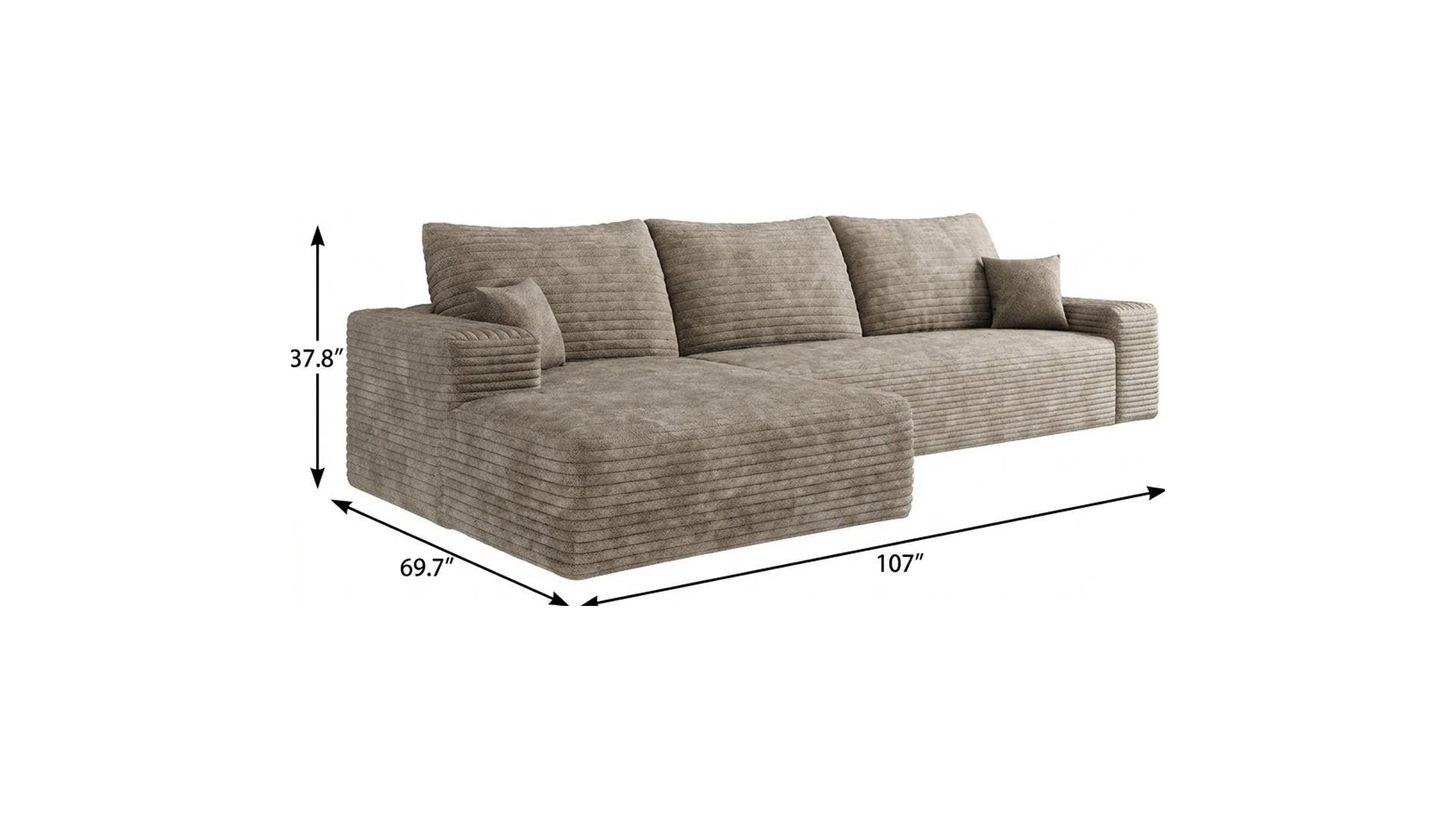 Transform your home's interior with this luxurious 107-inch camel corduroy modular compression foam sofa with toss pillows. This solid color modular is made from corduroy that is unique and gives this piece some special flair. Solid colors give you lots of decorative options and are easy to work into your decor scheme. Fixed arms offer a comfy place to rest. Built to last, this sofa will be a great centerpiece for your room. 37.80-inch h x 107.00-inch w x 69.70-inch d.