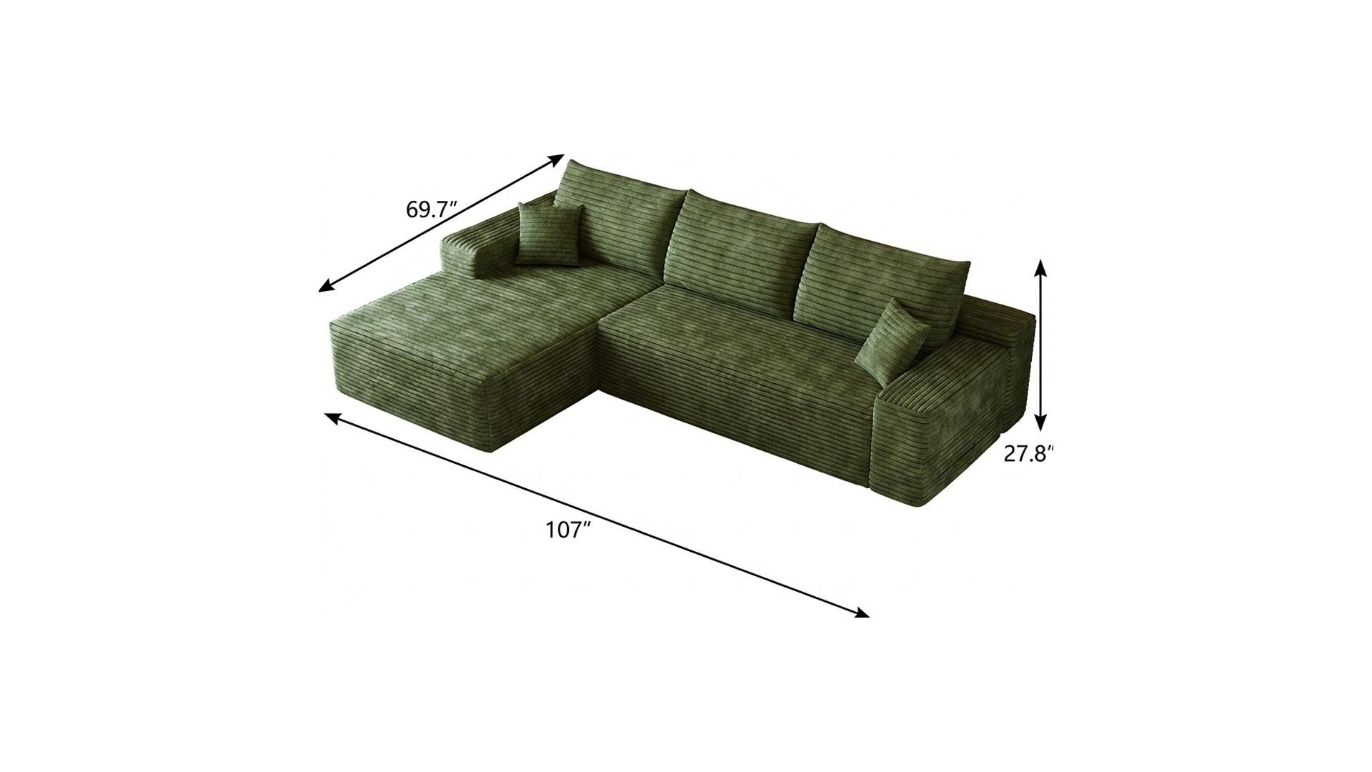 Transform your home's interior with this luxurious 107-inch green corduroy modular compression foam sofa with toss pillows. This solid color modular is made from corduroy that is unique and gives this piece some special flair. Solid colors give you lots of decorative options and are easy to work into your decor scheme. Fixed arms offer a comfy place to rest. Built to last, this sofa will be a great centerpiece for your room. 27.80-inch h x 107.00-inch w x 69.70-inch d.
