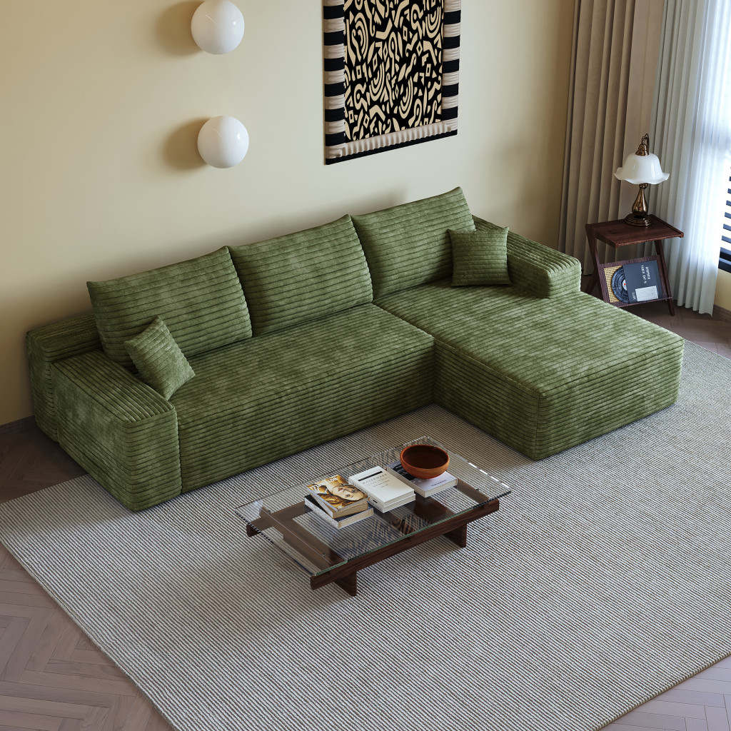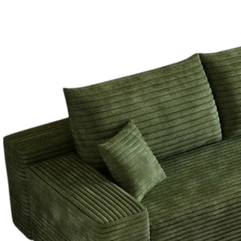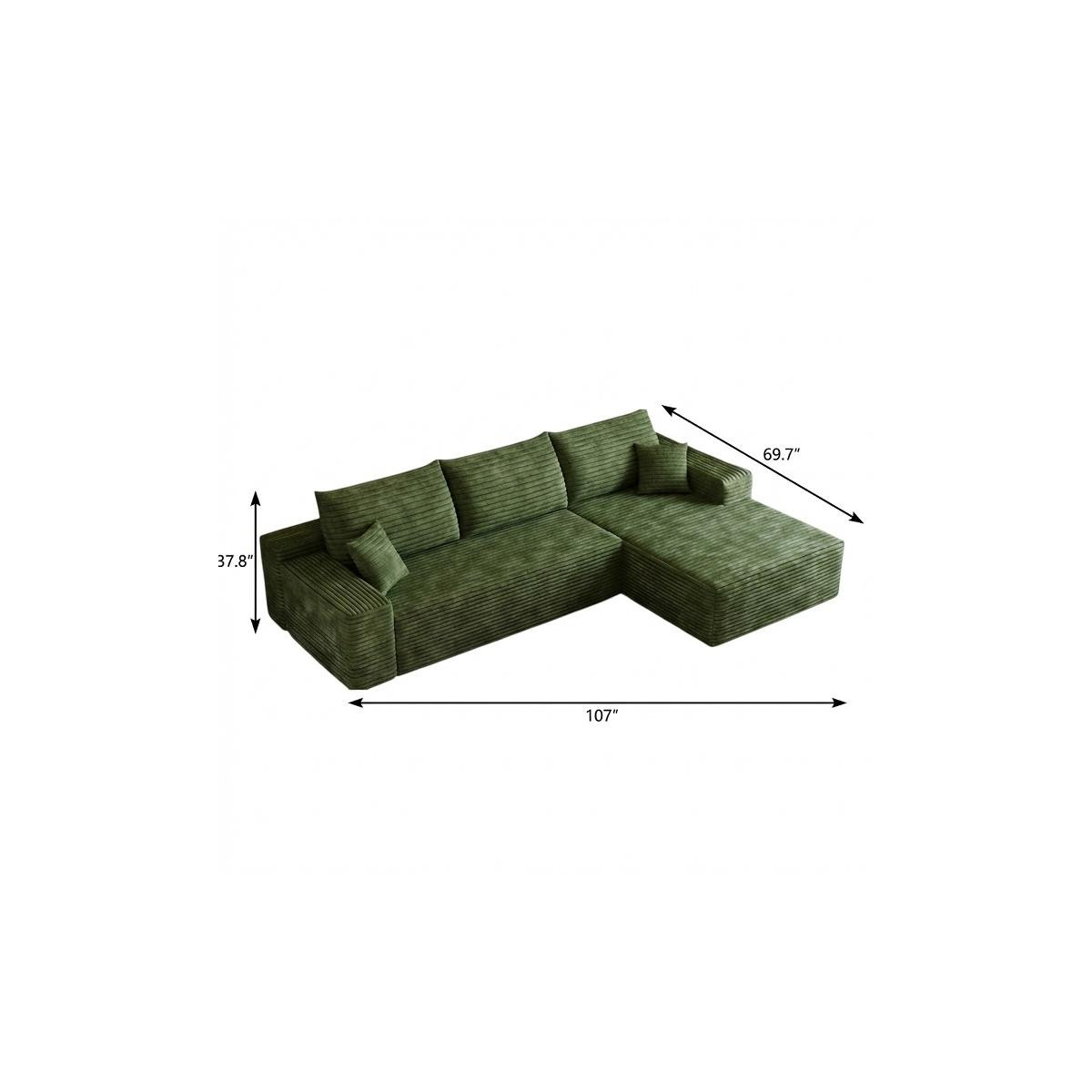 Transform your home's interior with this luxurious 107-inch green corduroy modular compression foam sofa with toss pillows. This solid color modular is made from corduroy that is unique and gives this piece some special flair. Solid colors give you lots of decorative options and are easy to work into your decor scheme. Fixed arms offer a comfy place to rest. A great showpiece for your room, this sofa is a must have. 37.80-inch h x 107.00-inch w x 69.70-inch d.