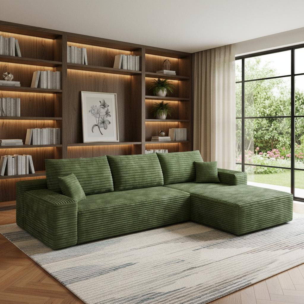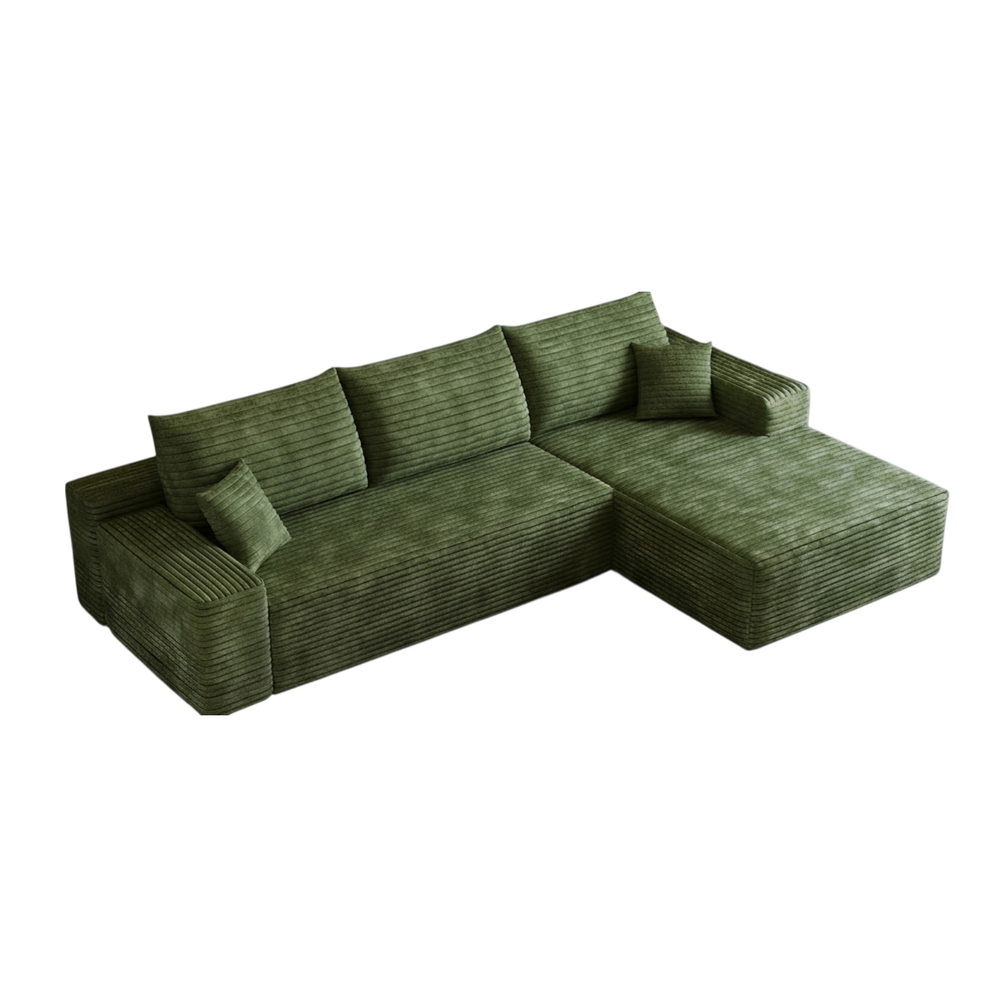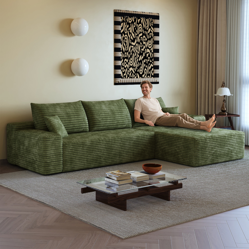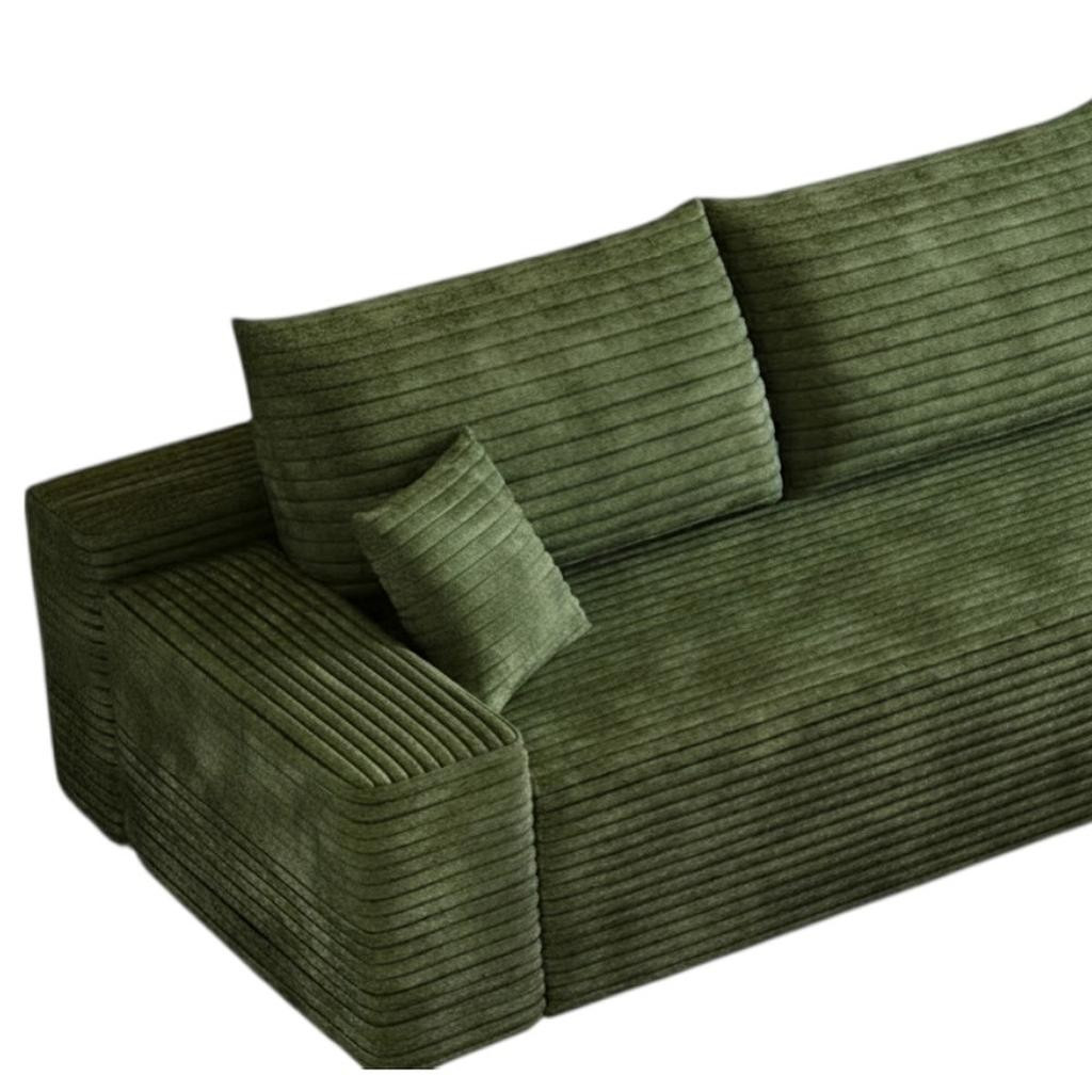 Transform your home's interior with this luxurious 107-inch green corduroy modular compression foam sofa with toss pillows. This solid color modular is made from corduroy that is unique and gives this piece some special flair. Solid colors give you lots of decorative options and are easy to work into your decor scheme. Fixed arms offer a comfy place to rest. A great showpiece for your room, this sofa is a must have. 37.80-inch h x 107.00-inch w x 69.70-inch d.