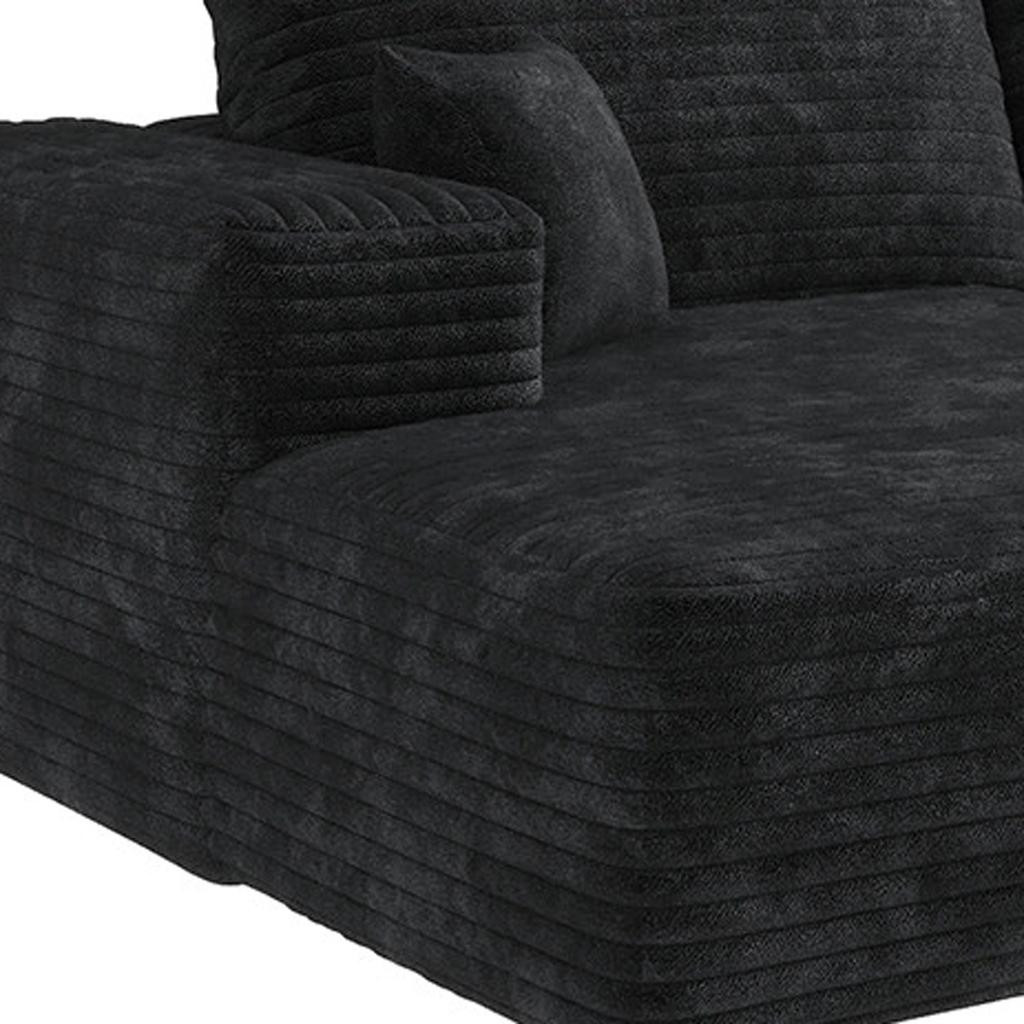 Add an air of fashion to your space with this fabulous 135-inch black corduroy modular compression foam sofa with toss pillows. This solid color modular is made from corduroy that is unique and gives this piece some special flair. Solid colors give you lots of decorative options and are easy to work into your decor scheme. Fixed arms offer a comfy place to rest. A great showpiece for your room, this sofa is a must have. 37.80-inch h x 135.00-inch w x 69.70-inch d.