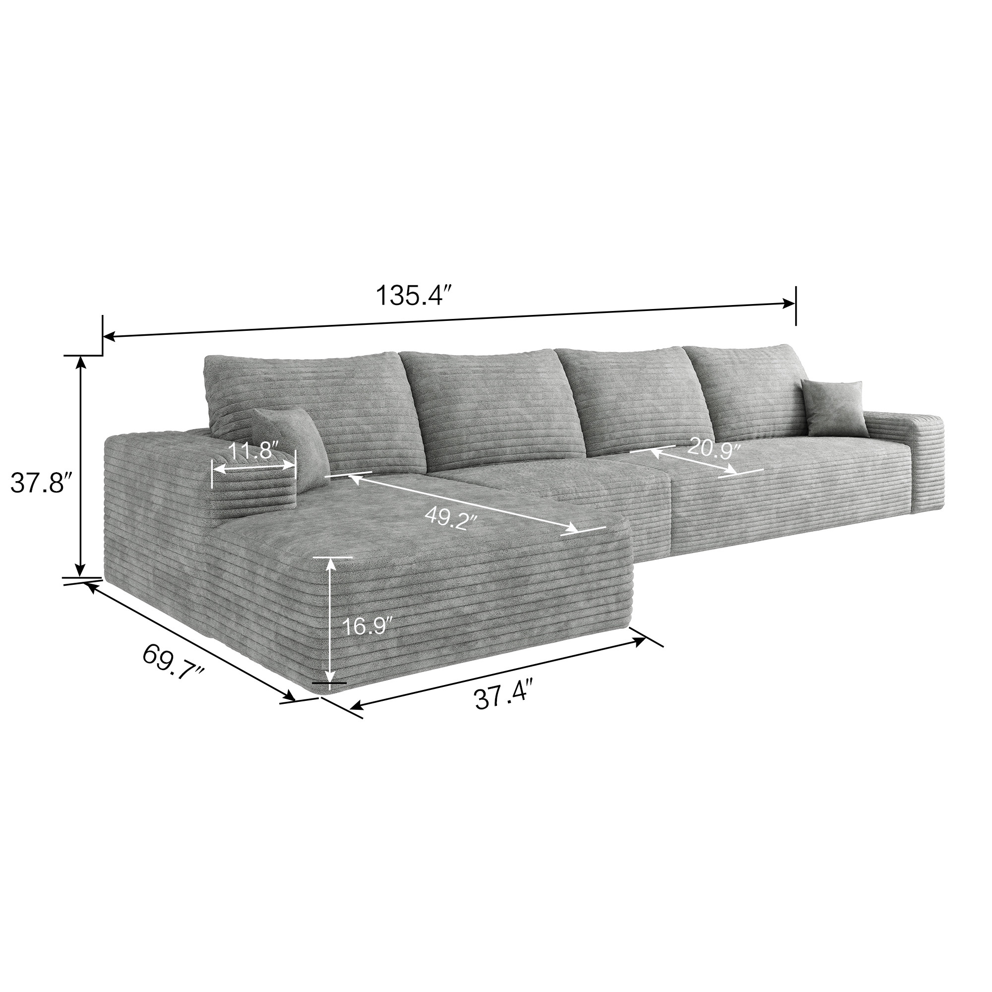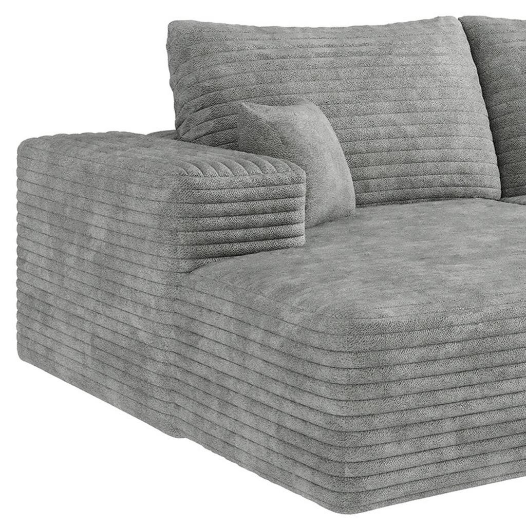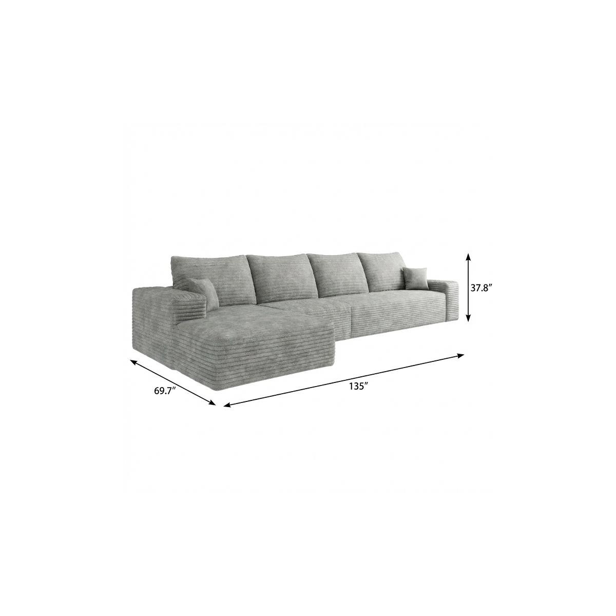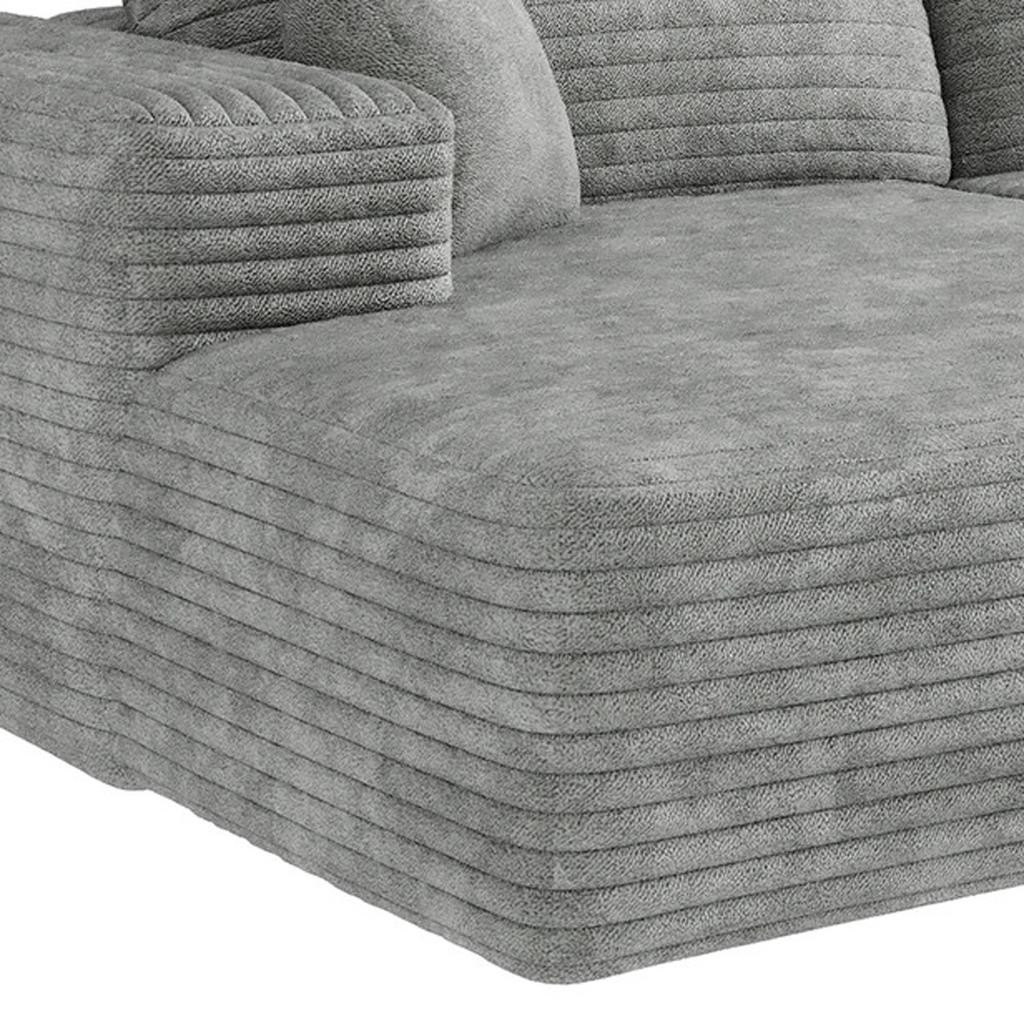 Designed for comfort and good looks, this 135-inch gray corduroy modular compression foam sofa with toss pillows is a great option to anchor your space. This solid color modular is made from corduroy that is unique and gives this piece some special flair. Solid colors give you lots of decorative options and are easy to work into your decor scheme. Fixed arms offer a comfy place to rest. A great showpiece for your room, this sofa is a must have. 37.80-inch h x 135.00-inch w x 69.70-inch d.