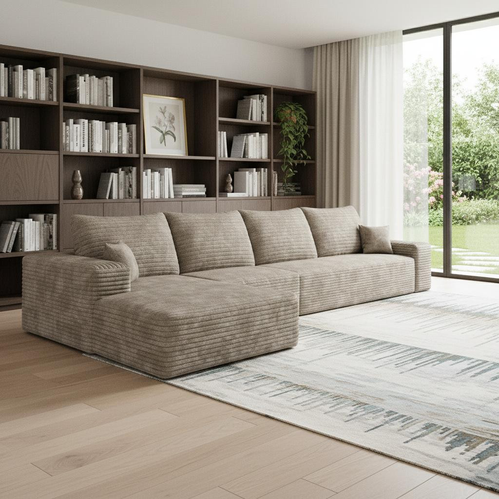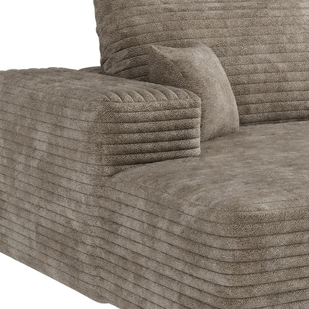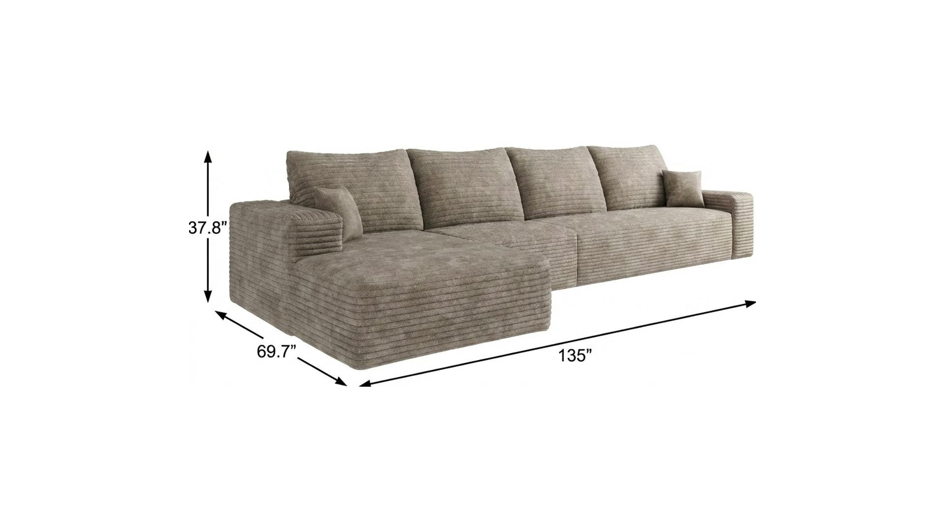 Transform your home's interior with this luxurious 135-inch camel corduroy modular compression foam sofa with toss pillows. This solid color modular is made from corduroy that is unique and gives this piece some special flair. Solid colors give you lots of decorative options and are easy to work into your decor scheme. Fixed arms offer a comfy place to rest. A great showpiece for your room, this sofa is a must have. 37.80-inch h x 135.00-inch w x 69.70-inch d.