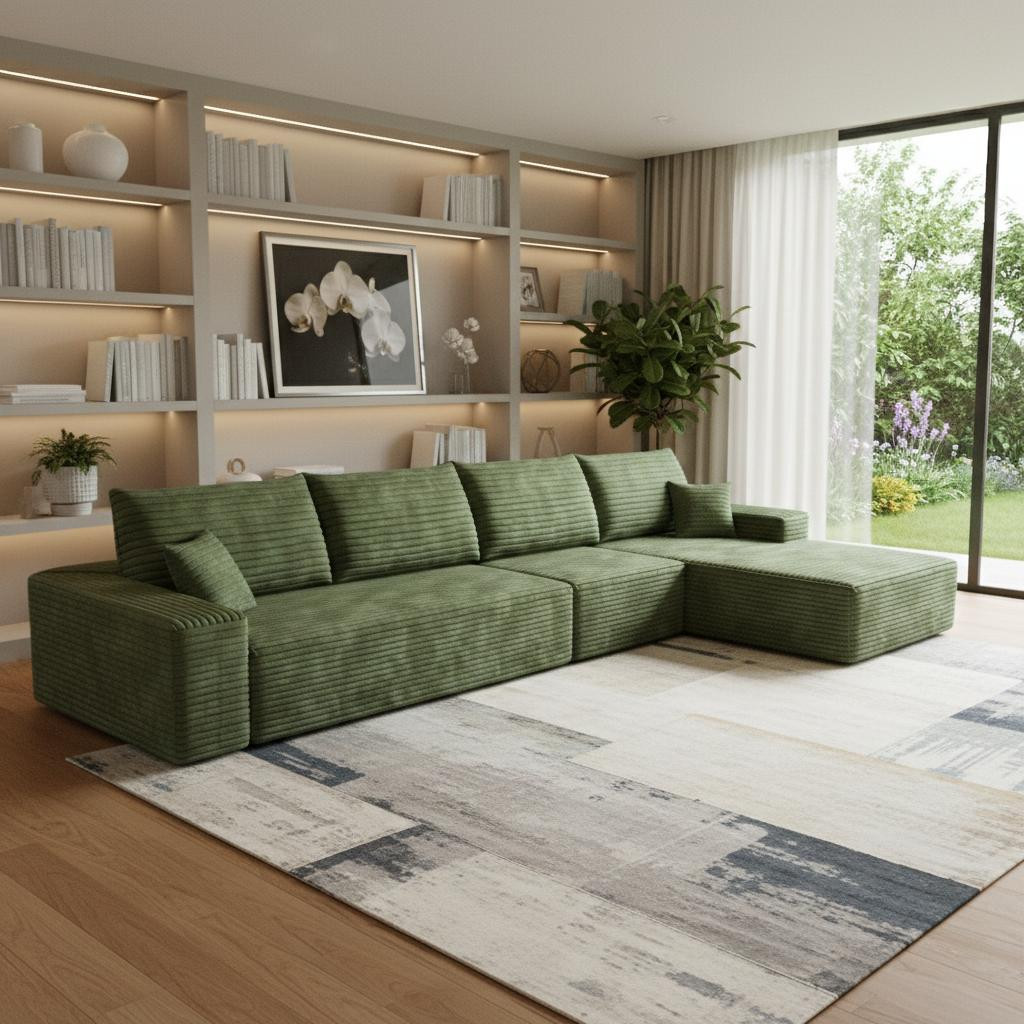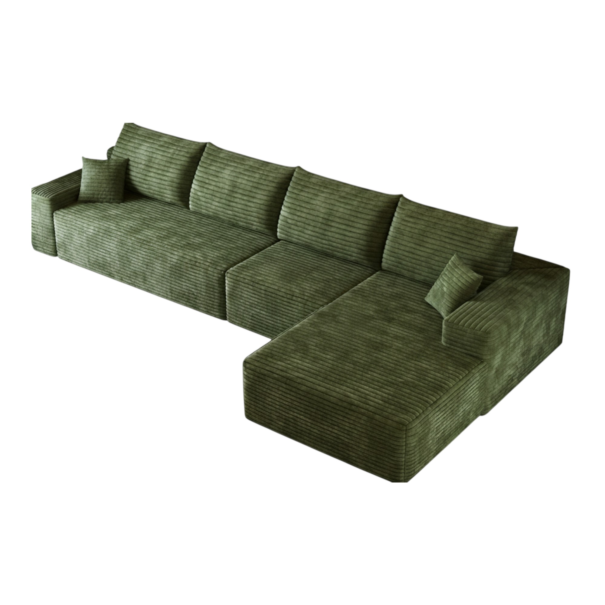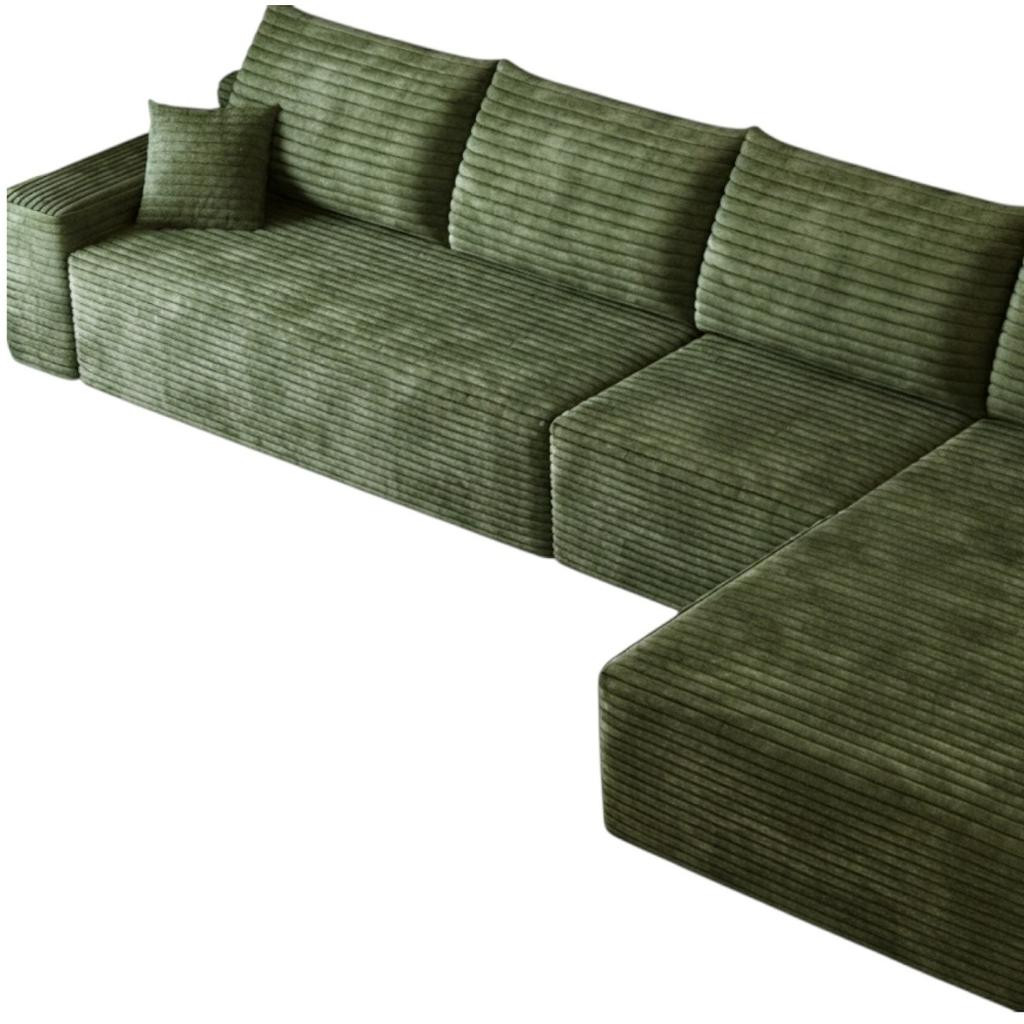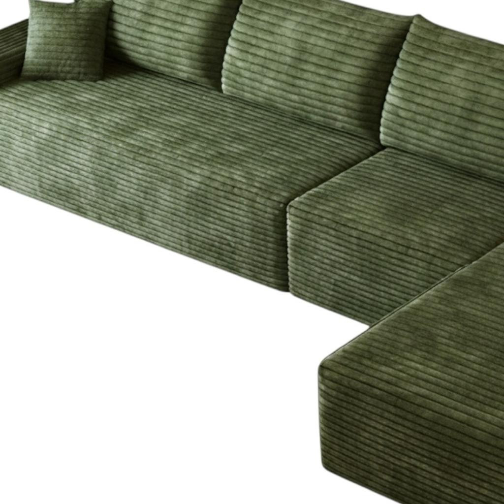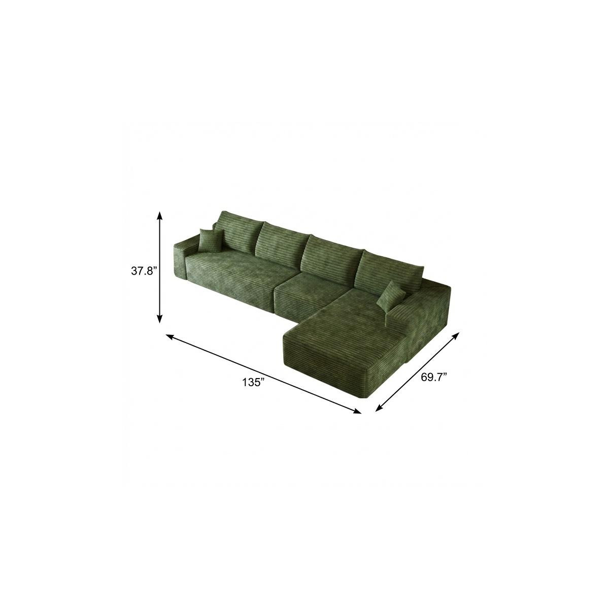 Designed for comfort and good looks, this 135-inch green corduroy modular compression foam sofa with toss pillows is a great option to anchor your space. This solid color modular is made from corduroy that is unique and gives this piece some special flair. Solid colors give you lots of decorative options and are easy to work into your decor scheme. Fixed arms offer a comfy place to rest. Built to last, this sofa will be a great centerpiece for your room. 37.80-inch h x 135.00-inch w x 69.70-inch d.