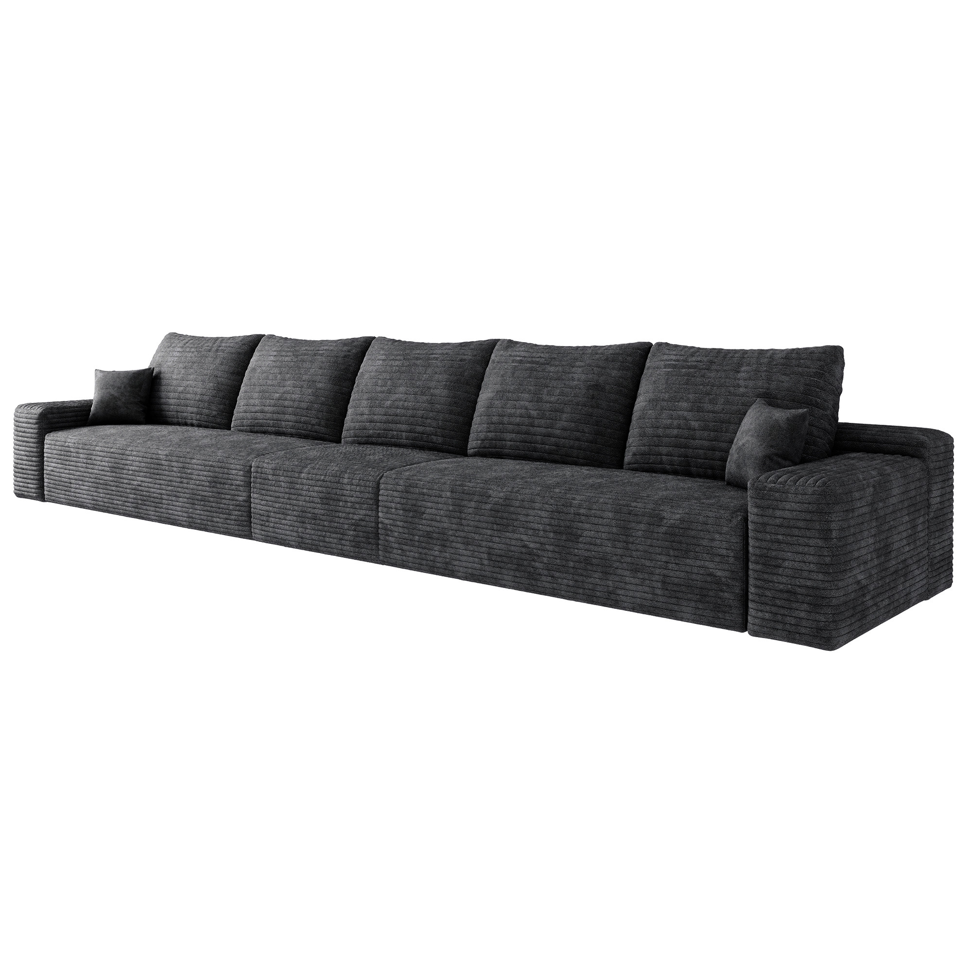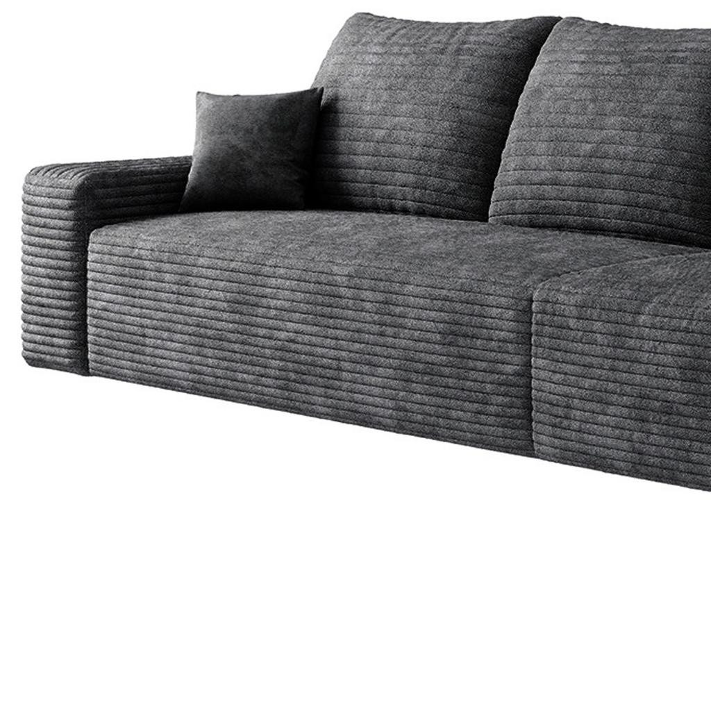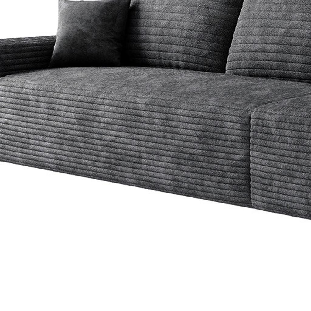 Transform your home's interior with this luxurious 168-inch black corduroy modular compression foam sofa with toss pillows. This solid color modular is made from corduroy that is unique and gives this piece some special flair. Solid colors give you lots of decorative options and are easy to work into your decor scheme. Fixed arms offer a comfy place to rest. A great showpiece for your room, this sofa is a must have. 37.80-inch h x 168.00-inch w x 39.40-inch d.