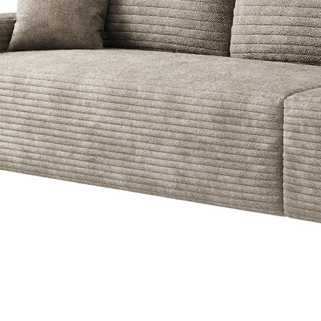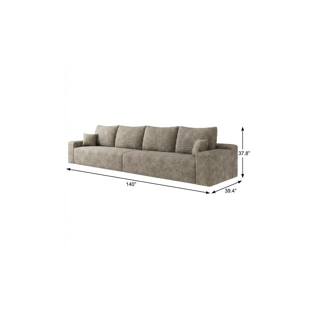 Designed for comfort and good looks, this 140-inch camel corduroy modular compression foam sofa with toss pillows is a great option to anchor your space. This solid color modular is made from corduroy that is unique and gives this piece some special flair. Solid colors give you lots of decorative options and are easy to work into your decor scheme. Fixed arms offer a comfy place to rest. Built to last, this sofa will be a great centerpiece for your room. 37.80-inch h x 140.00-inch w x 39.40-inch d.
