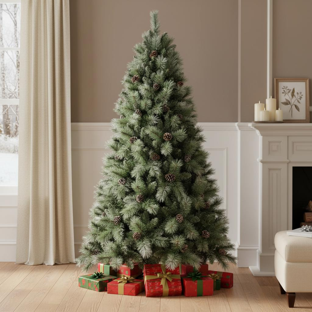 Decorate and celebrate in style with this festive 9-foot full pine christmas tree. This artificial tree features a lush green color that evokes the spirit of the season. With its regular fullness, it creates a beautiful backdrop for your holiday decorations. The sturdy tree stand included ensures stability, allowing you to display ornaments with confidence. Crafted from durable polyvinyl chloride, this tree is designed to last for years of holiday joy. With an impressive tip count of 2518, it offers a dense and realistic appearance that enhances your festive ambiance. Bring home this stunning centerpiece to elevate your christmas celebrations. 108.00-inch h x 63.00-inch w x 63.00-inch d.