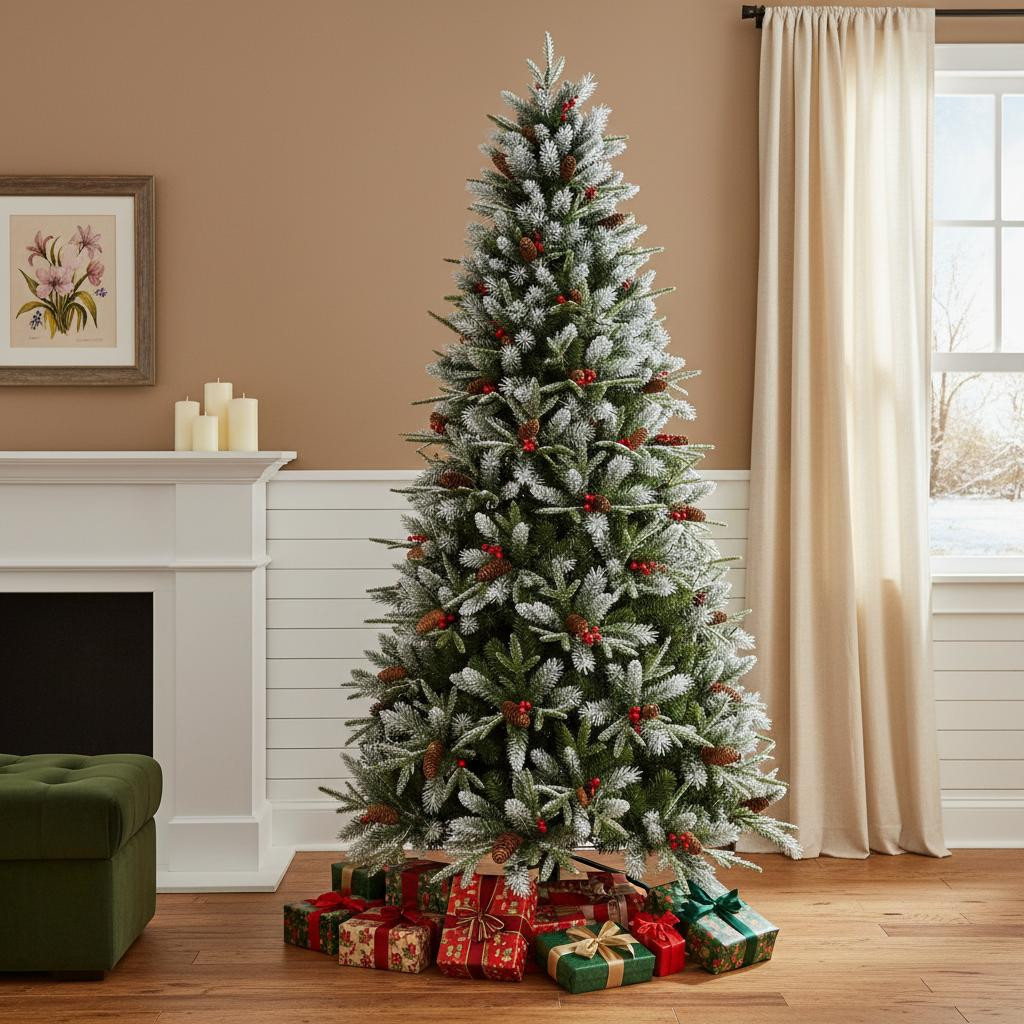 Decorate and celebrate in style with this festive 7.5-foot white full pine christmas tree. This stunning artificial tree features a regular fullness shape, making it a perfect centerpiece for your holiday gatherings. With its beautiful white needle color, it brings a touch of elegance to any space. The tree includes a sturdy stand for easy setup and stability throughout the festive season. Crafted from durable polyvinyl chloride, it ensures long-lasting use for many holidays to come. Boasting an impressive tip count of 2,514, this tree offers plenty of space for your favorite ornaments and lights, creating a magical winter wonderland in your home. 90.00-inch h x 51.00-inch w x 51.00-inch d.