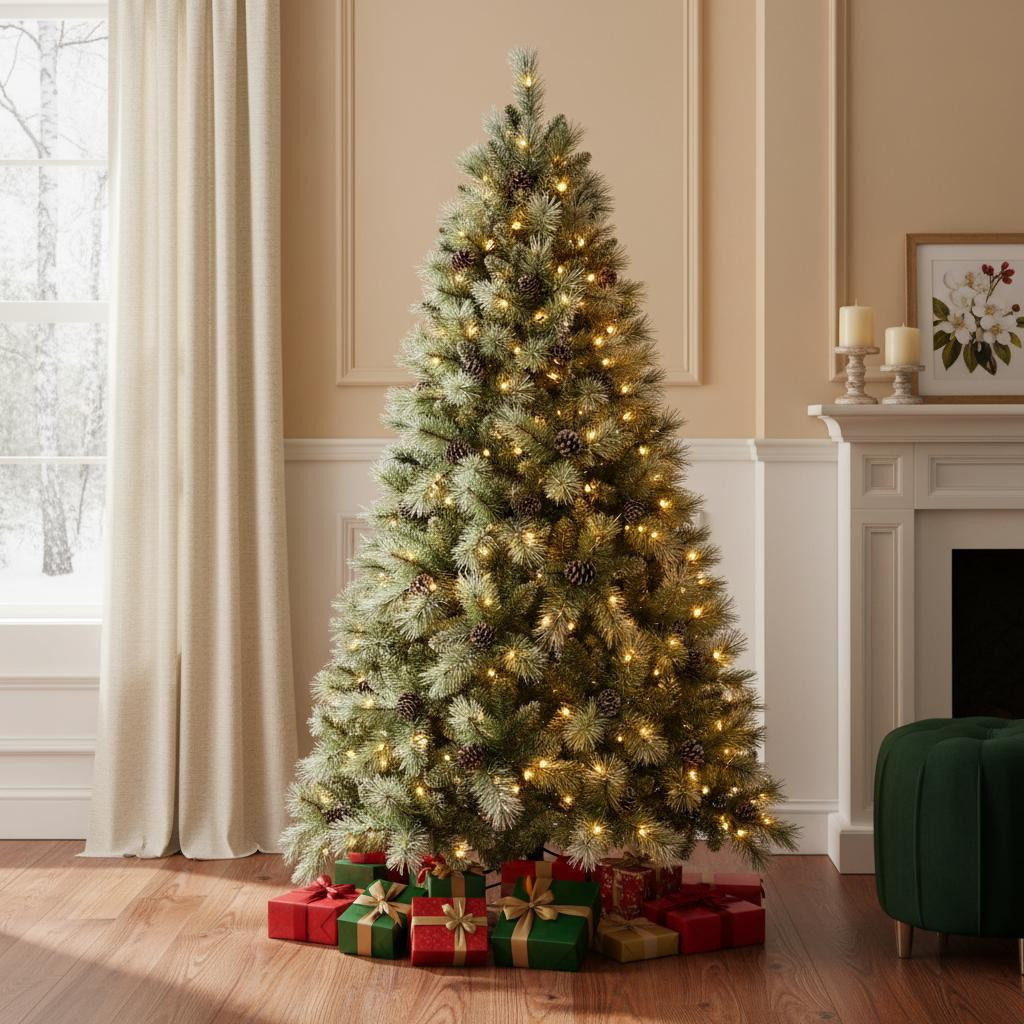 Decorate and celebrate in style with this festive 7-foot pre lit full pine christmas tree. This artificial tree features a lush, green color and is designed in a regular fullness shape, making it perfect for any holiday setting. Enjoy the convenience of instant power lights, which illuminate the tree with 400 clear white led bulbs that cast a warm glow across your space. The electrical plug-in power source ensures consistent lighting, while the stay-lit bulbs provide assurance during festivities. A sturdy tree stand is included for easy setup, adding stability to your holiday display. Celebrate the season with this beautiful centerpiece. 84.00-inch h x 53.00-inch w x 53.00-inch d.