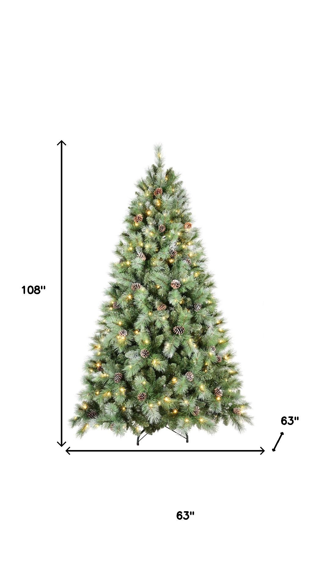Add some festive spirit to your space with this 9-foot pre lit full pine christmas tree. This exquisite artificial tree features a regular fullness with a lush green needle color that brings nature indoors. The tree is equipped with 700 led clear white lights, creating a warm and inviting atmosphere. With its instant power lights and stay-lit bulbs, you'll never have to worry about a dim holiday season. The included tree stand ensures stability, making the setup process seamless. Crafted from durable polyvinyl chloride, this timeless piece is designed to be a cherished part of your holiday traditions for years to come. 108.00-inch h x 63.00-inch w x 63.00-inch d.