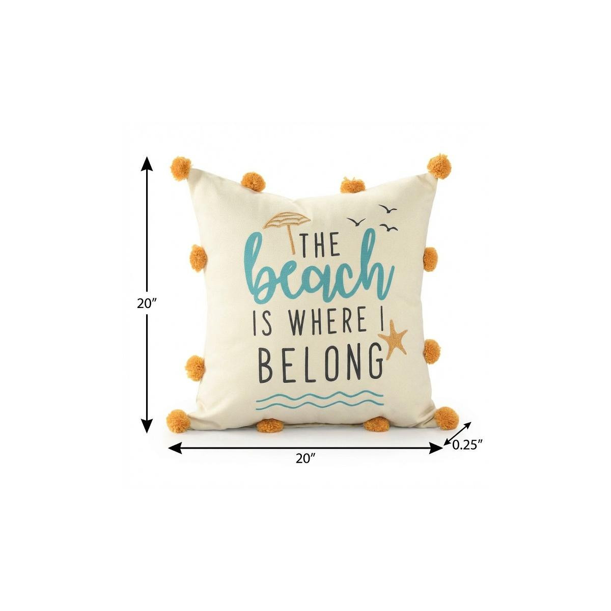 Unique and decorative, this comfortable 20-inch blue orange and off white the beach is where i belong beach nautical throw pillow cover with pompoms will leave a lasting impression. The blue, orange, and off white coloring of the extremely durable and long lasting polyester pillow cover will add dimension and texture to your space. Fun and decorative pom-poms add some high end and hand-crafted textural designer touches. Decorative pillow covers are a great way to change up the look and feel of your space easily and quickly. Combine with your own fill or insert to add decoration and dimension to your favorite chair, accent your sofa, or to use as part of your bed ensemble. 20.00-inch h x 20.00-inch w x 0.25-inch d.