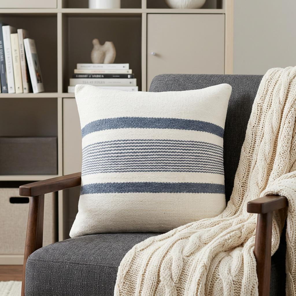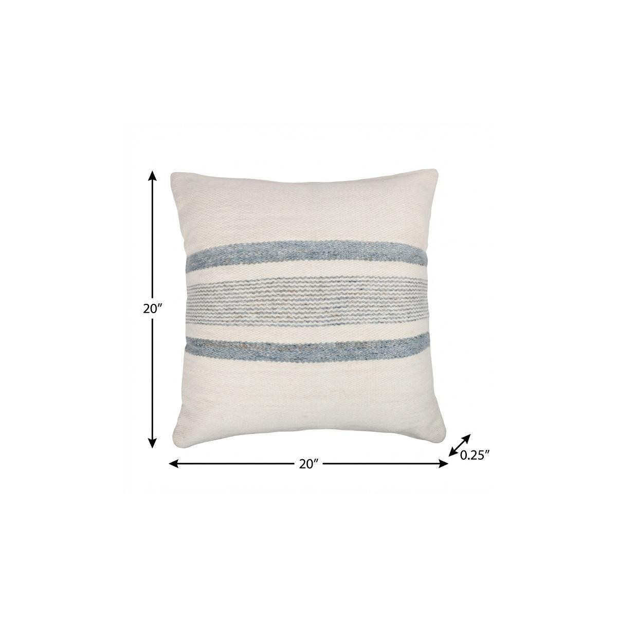 The perfect complement to your sofa, favorite chair, or bed, this 20-inch ivory and blue beach striped throw pillow cover is a great decorative accent. Durable ivory and blue polyester has been used to give this pillow cover a beautiful look that will stand the test of time. Decorative pillow covers are a great way to change up the look and feel of your space easily and quickly. Combine with your own fill or insert to add decoration and dimension to your favorite chair, accent your sofa, or to use as part of your bed ensemble. 20.00-inch h x 20.00-inch w x 0.25-inch d.