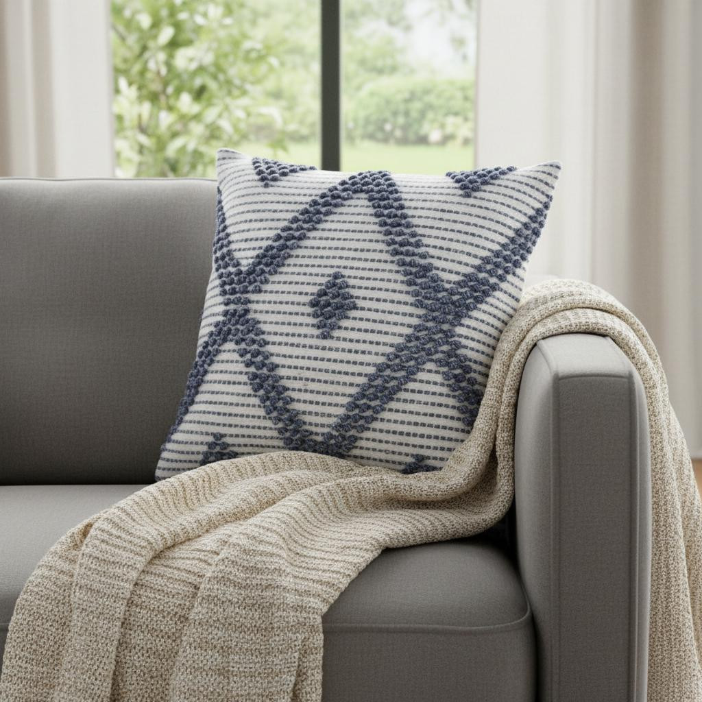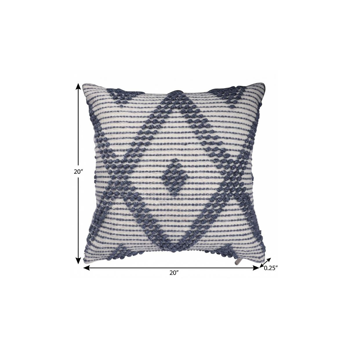 The perfect complement to your sofa, favorite chair, or bed, this 20-inch ivory and blue beach diamond throw pillow cover with texture is a great decorative accent. This soft and durable decorative pillow cover is expertly made of high grade, long lasting polyester in a ivory and blue coloration. Pillow covers are a good idea for anyone that loves to decorate or accent their space with color and texture. Combine with your own fill or insert to add decoration and dimension to your favorite chair, accent your sofa, or to use as part of your bed ensemble. 20.00-inch h x 20.00-inch w x 0.25-inch d.