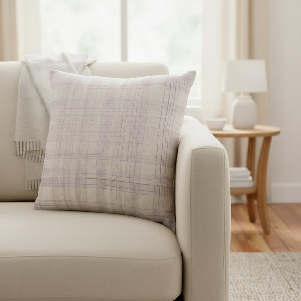 cotton blend throw pillow cover, 20" ivory lilac check cotton, blend throw pillow cover, ivory lilac check cotton blend, check cotton blend throw pillow |