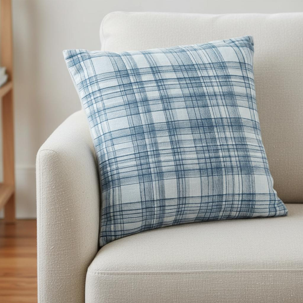 cotton blend throw pillow cover, blend throw pillow cover, check cotton blend throw pillow, cotton blend throw pillow, 24" blue indigo check cotton |