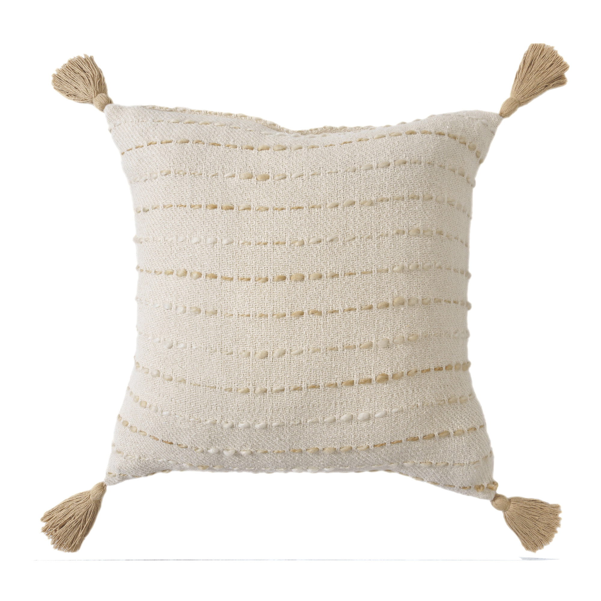The perfect complement to your sofa, favorite chair, or bed, this 20-inch white and beige striped cotton blend throw pillow cover is a great decorative accent. This white and beige colored decorative pillow cover is made from high grade cotton blend that is durable and long lasting. Pillow covers are a good idea for anyone that loves to decorate or accent their space with color and texture. Combine with your own fill or insert to add decoration and dimension to your favorite chair, accent your sofa, or to use as part of your bed ensemble. 20.00-inch h x 20.00-inch w x 0.25-inch d.