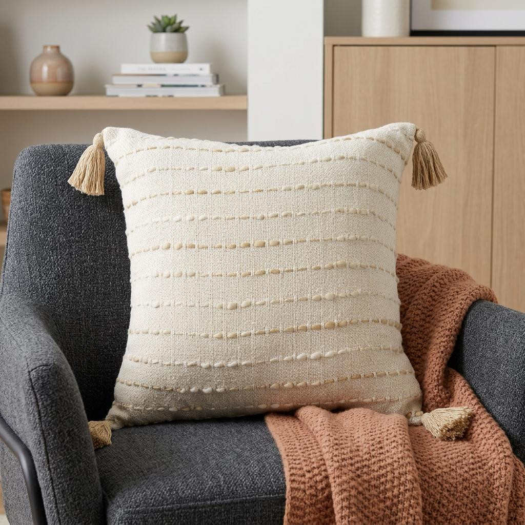 The 20-inch white and beige striped cotton blend throw pillow cover with tassels embroidery and texture is the perfect decorative accessory for your home. Durable white and beige cotton blend has been used to give this pillow cover a beautiful look that will stand the test of time. Decorative pillow covers are a great way to change up the look and feel of your space easily and quickly. Combine with your own fill or insert to add decoration and dimension to your favorite chair, accent your sofa, or to use as part of your bed ensemble. 20.00-inch h x 20.00-inch w x 0.25-inch d.