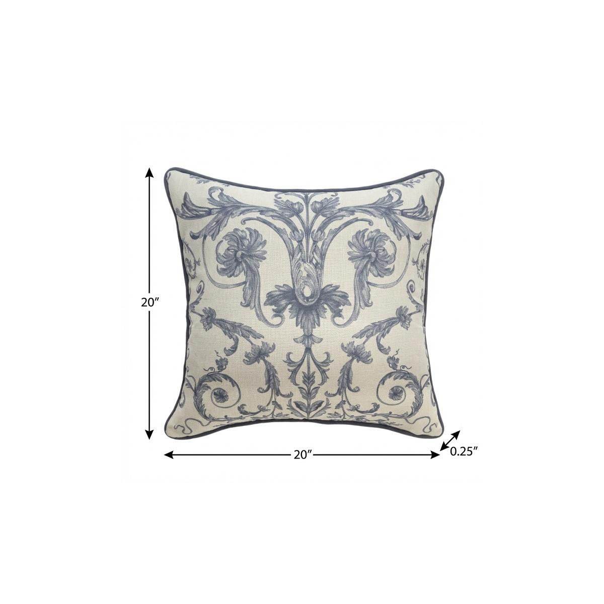 The 20-inch ivory and blue damask throw pillow cover is the perfect decorative accessory for your home. This soft and durable decorative pillow cover is expertly made of high grade, long lasting polyester in a ivory and blue coloration. Decorative pillow covers are a great way to change up the look and feel of your space easily and quickly. Combine with your own fill or insert to add decoration and dimension to your favorite chair, accent your sofa, or to use as part of your bed ensemble. 20.00-inch h x 20.00-inch w x 0.25-inch d.