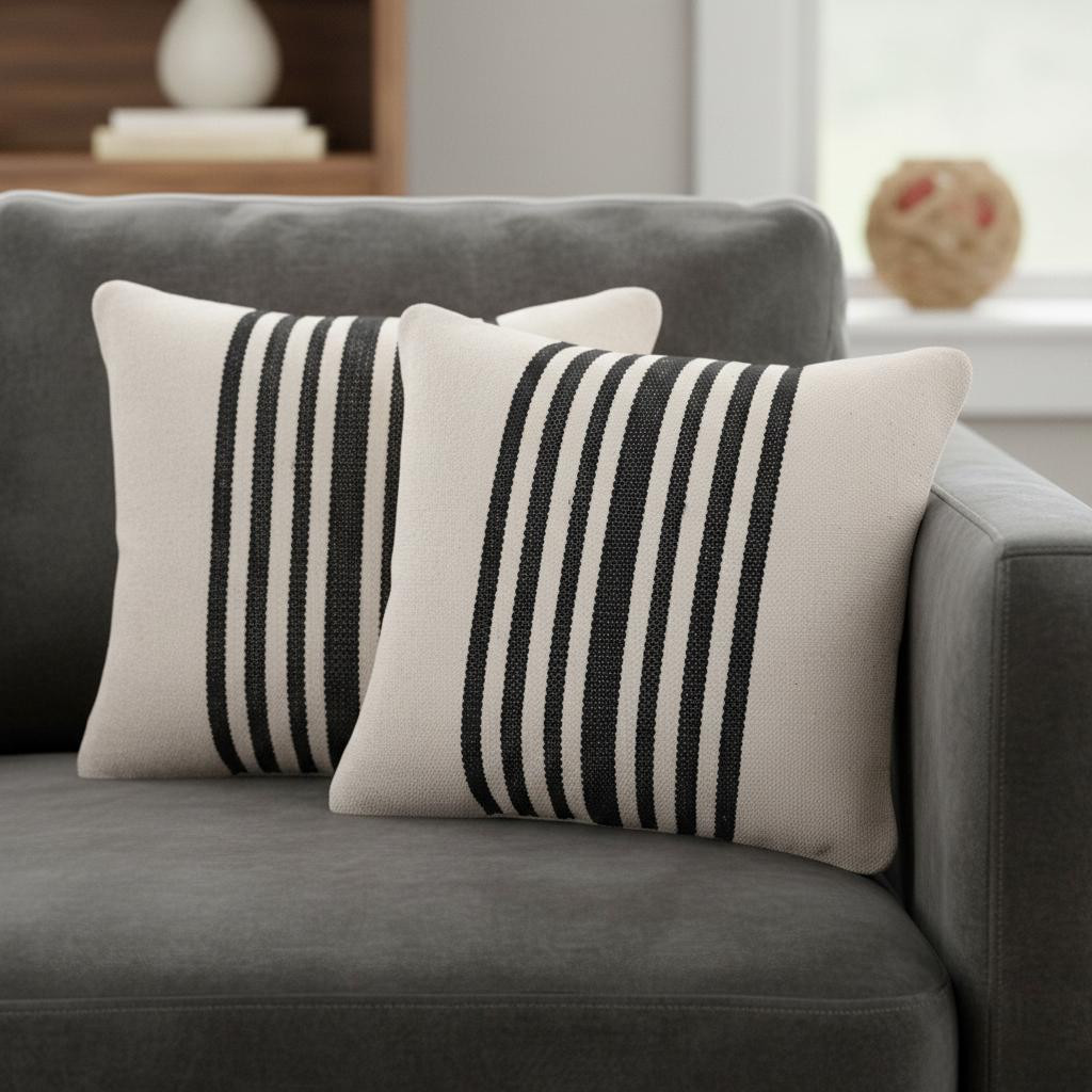 This set of two 22-inch white and black striped cotton throw pillow covers will add a beautiful decorative accent to your decor. Ultra durable white and black cotton has been used to make this decorative pillow cover set a beautiful look that will stand the test of time. Decorative pillow covers are a great way to change up the look and feel of your space easily and quickly. Combine with your own fill or insert to add decoration and dimension to your favorite chair, accent your sofa, or to use as part of your bed ensemble. 22.00-inch h x 22.00-inch w x 0.25-inch d.