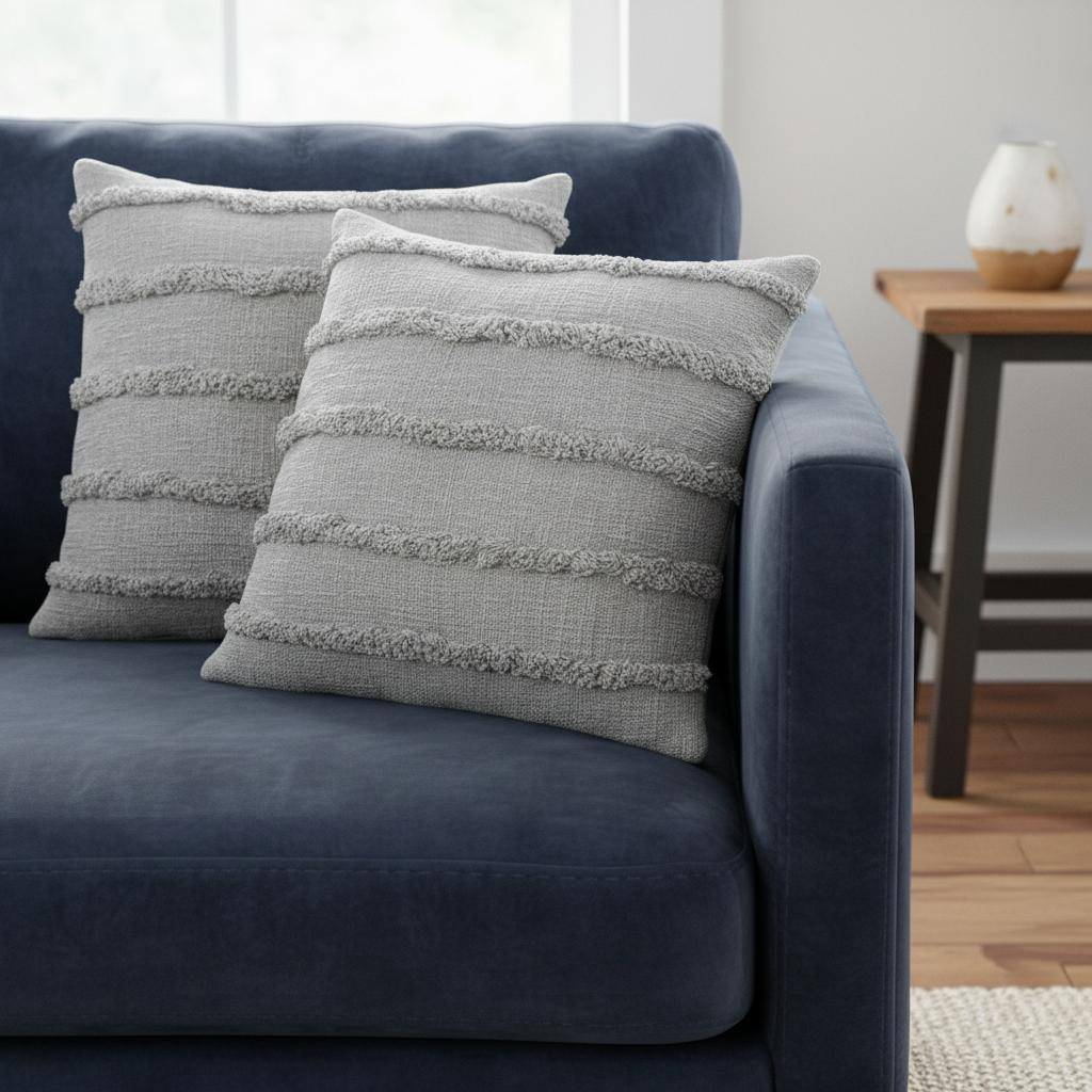 Add an air of fashion to your room and rejuvenate the space with this cute and fashionable set of two 20-inch gray striped cotton throw pillow covers with tufts. This gray colored decorative pillow cover set is made from high grade cotton that is durable and soft to the touch. Fun and decorative tufts add some high end and hand-crafted textural designer touches. Emblazoned with the text these pillows add some visual interest and decor to your space. Emblazoned with the text these pillow covers add some visual interest and decor to your space. Pillow covers are a good idea for anyone that loves to decorate or accent their space with color and texture. Combine with your own fill or insert to add decoration and dimension to your favorite chair, accent your sofa, or to use as part of your bed ensemble. 20.00-inch h x 20.00-inch w x 0.25-inch d.