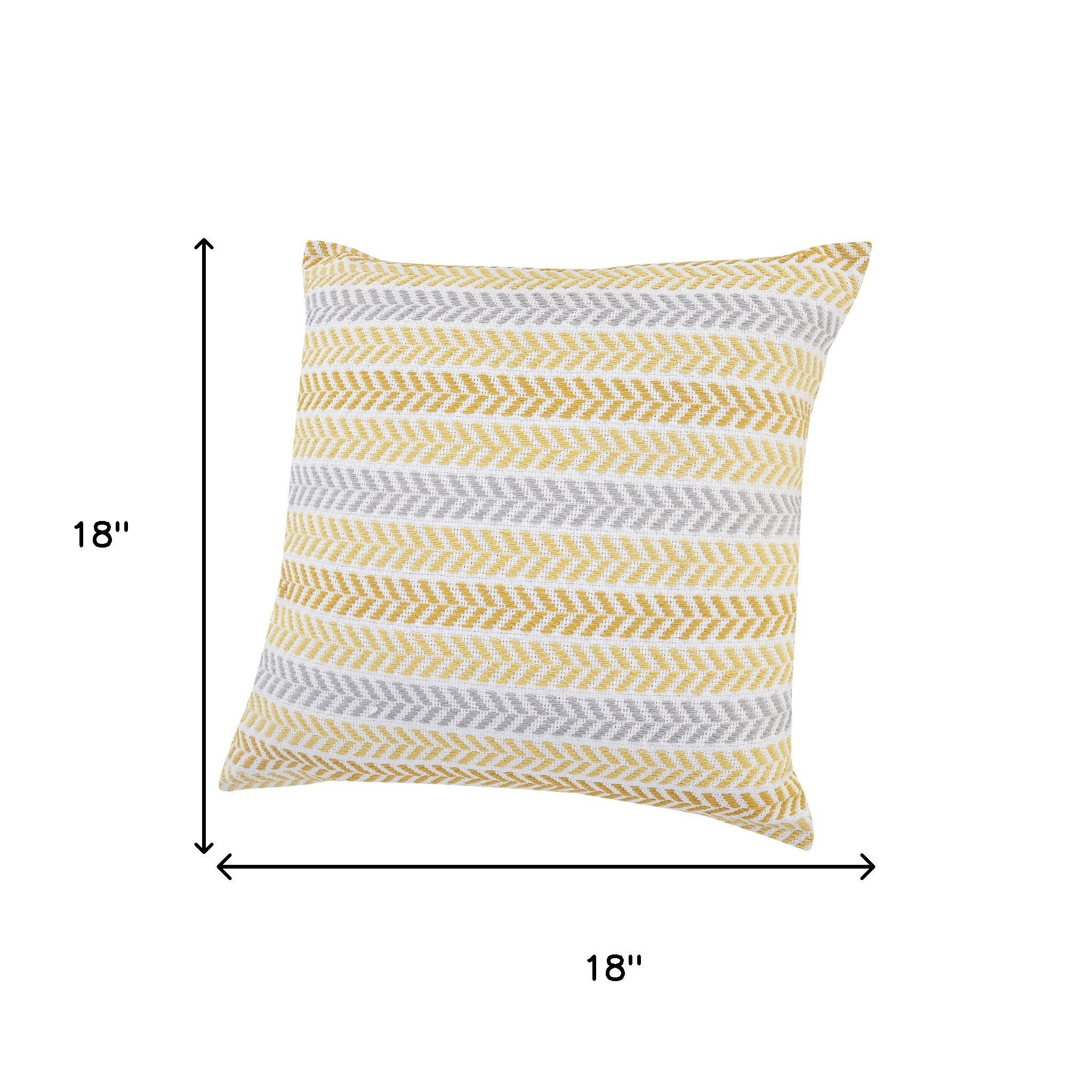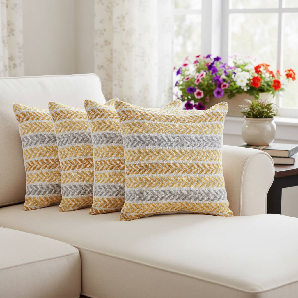 The set of four 18-inch yellow and white chevron cotton throw pillow covers is the perfect decorative accessory for your home. Ultra durable yellow and white cotton has been used to make this decorative pillow cover set a beautiful look that will stand the test of time. Pillow covers are a good idea for anyone that loves to decorate or accent their space with color and texture. Combine with your own fill or insert to add decoration and dimension to your favorite chair, accent your sofa, or to use as part of your bed ensemble. 18.00-inch h x 18.00-inch w x 1.00-inch d.
