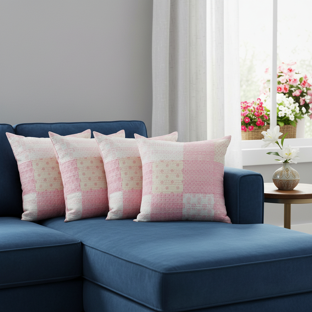 Unique and decorative, this comfortable set of four 20-inch pink and white patchwork cotton throw pillow covers will leave a lasting impression. The pink and white coloring of the extremely durable and long lasting cotton pillow covers will add dimension and texture to your space. Decorative pillow covers are a great way to change up the look and feel of your space easily and quickly. Combine with your own fill or insert to add decoration and dimension to your favorite chair, accent your sofa, or to use as part of your bed ensemble. 20.00-inch h x 20.00-inch w x 0.25-inch d.