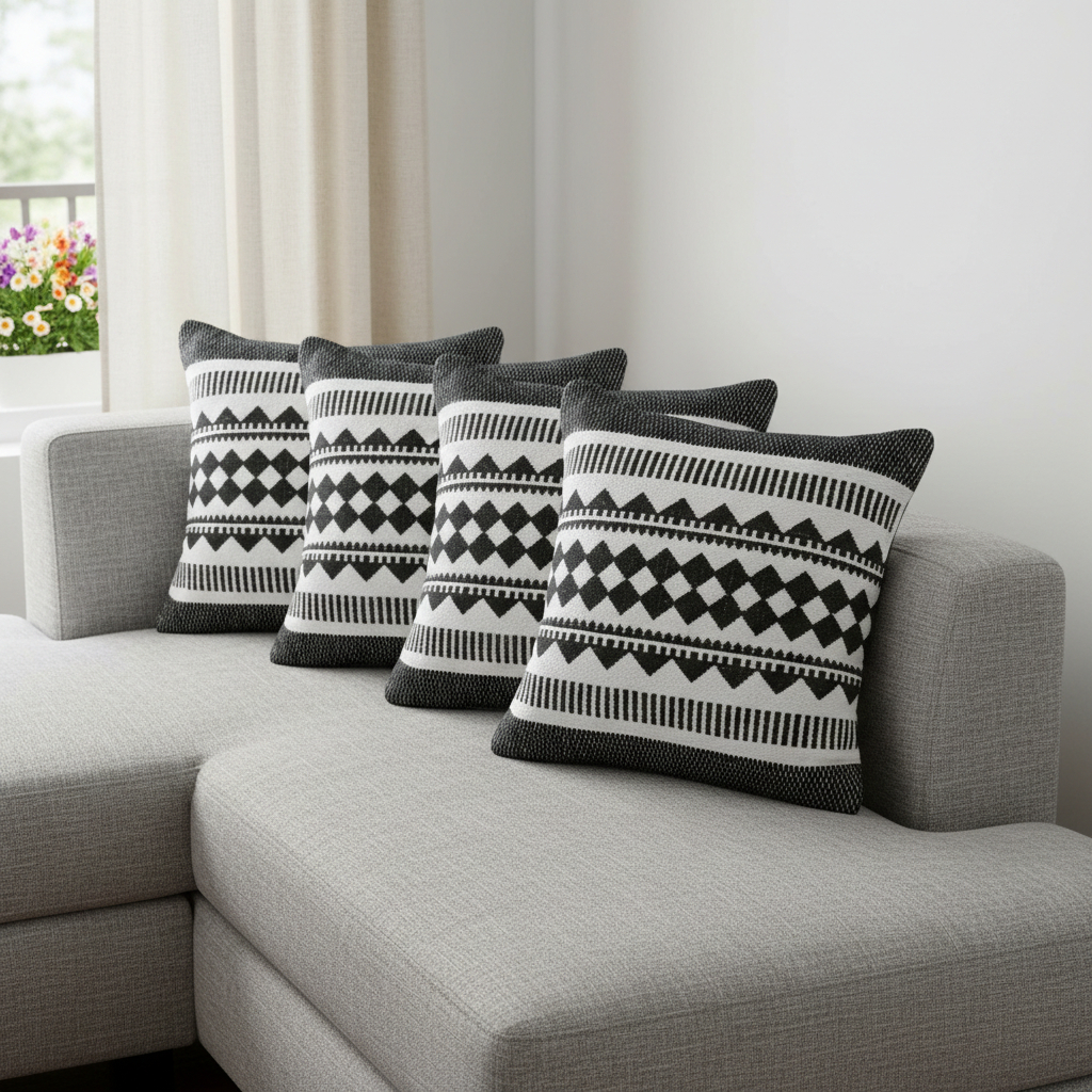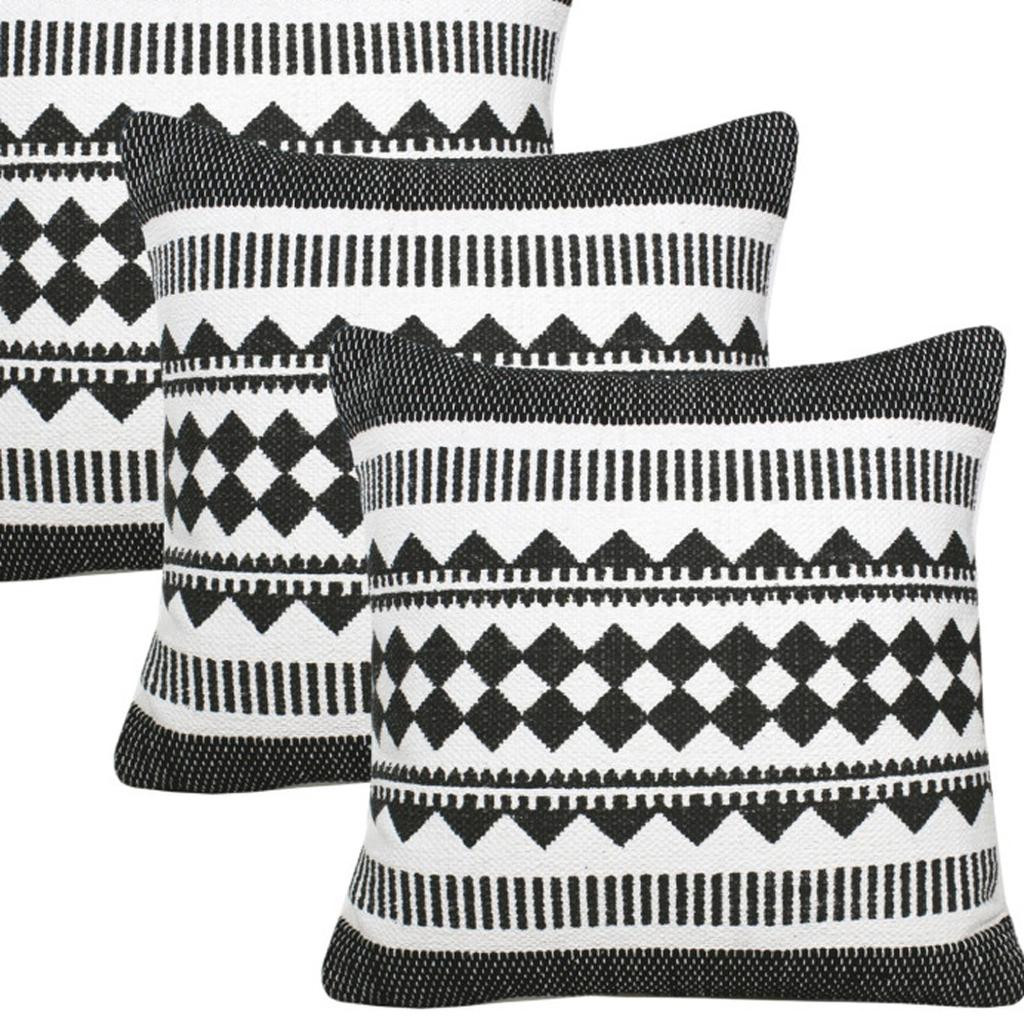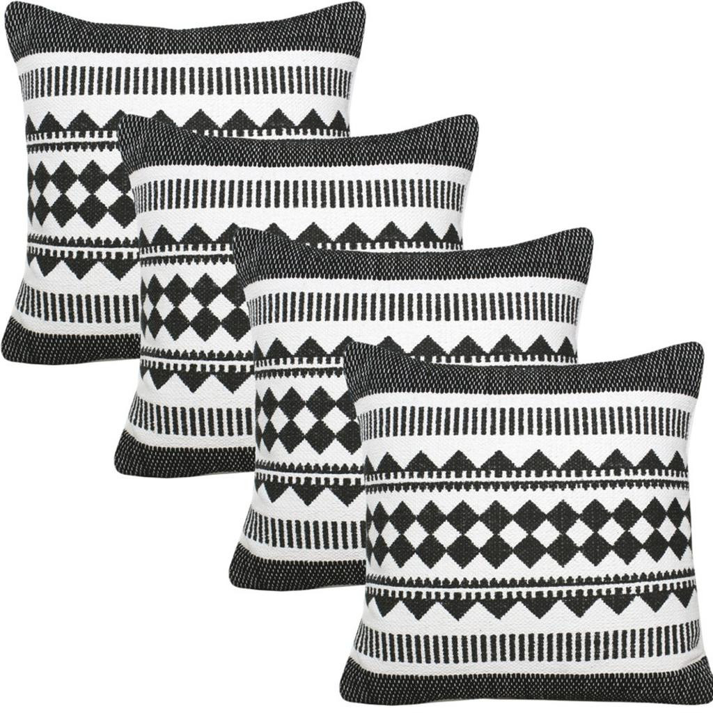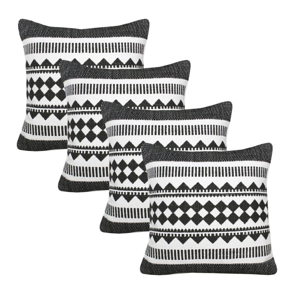 Add an air of fashion to your room and rejuvenate the space with this cute and fashionable set of four 20-inch black and white geometric cotton blend throw pillow covers. The black and white coloring of the extremely durable and long lasting cotton blend pillow covers will add dimension and texture to your space. Pillow covers are a good idea for anyone that loves to decorate or accent their space with color and texture. Combine with your own fill or insert to add decoration and dimension to your favorite chair, accent your sofa, or to use as part of your bed ensemble. 20.00-inch h x 20.00-inch w x 0.25-inch d.